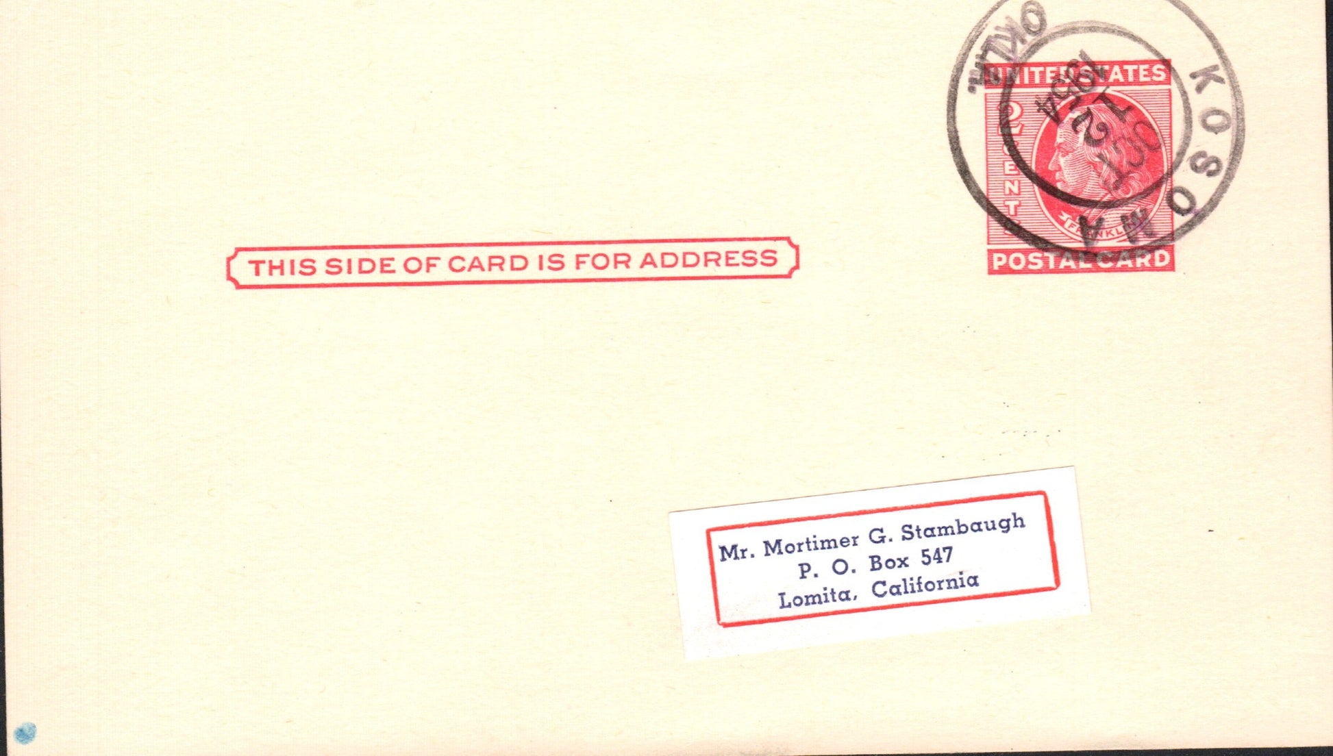 Kosoma (1888-1954) 1954 round dater on Postal Card
