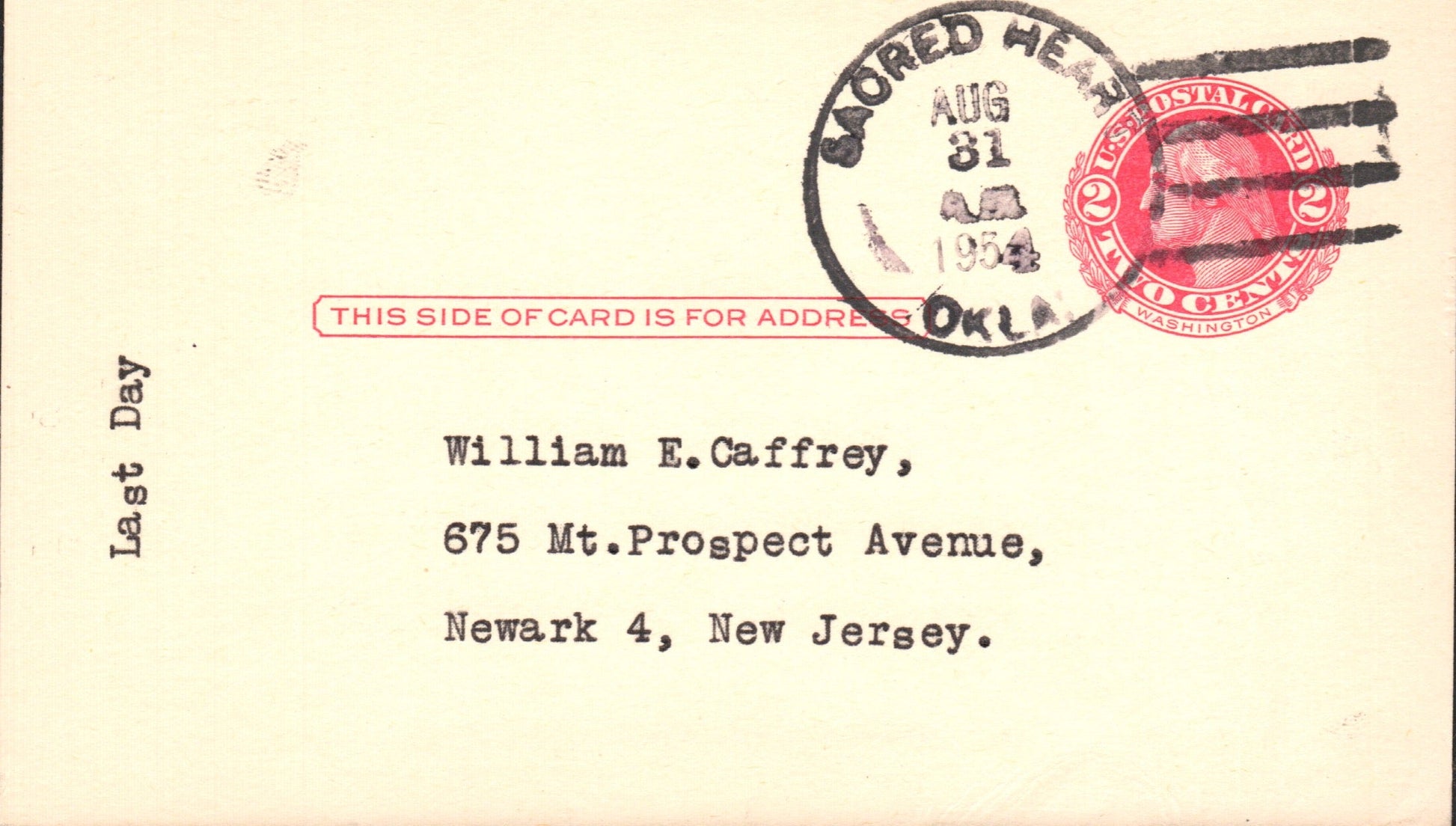 Sacred Heart (1888-1954) 1954 4-bar on LD Postal Card