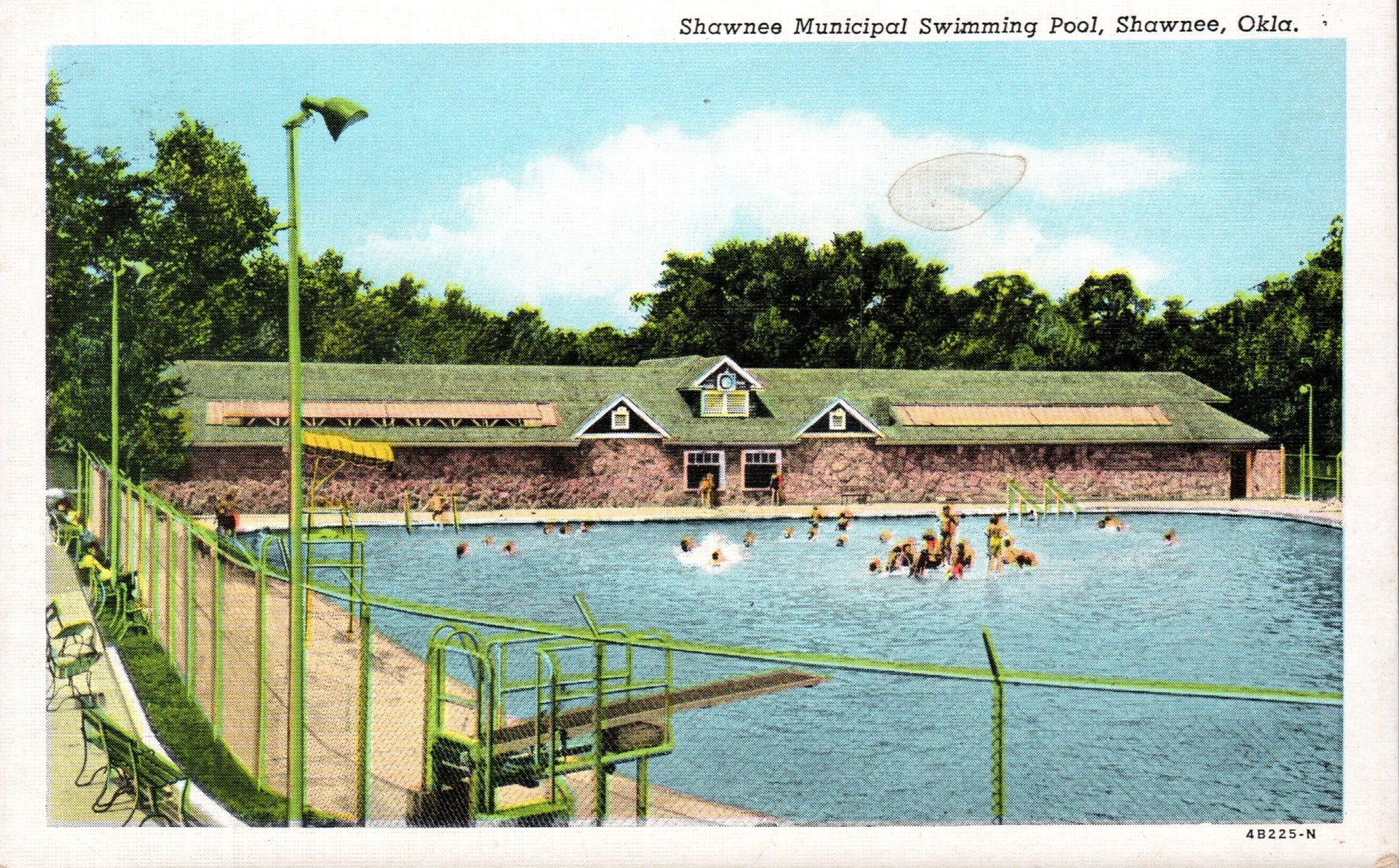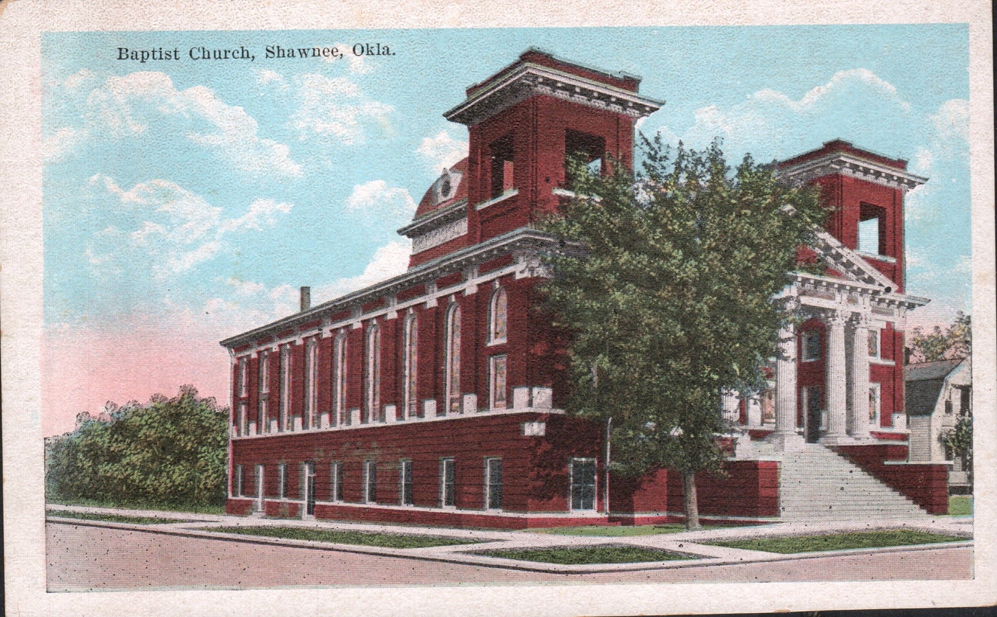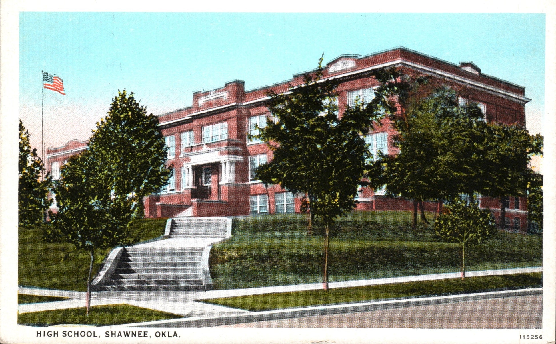 Shawnee Post cards: High School [c.1930]; Baptist Church [c.1930]; Swimming Pool [linen]; Entrance to Benson Park [c.1910?]