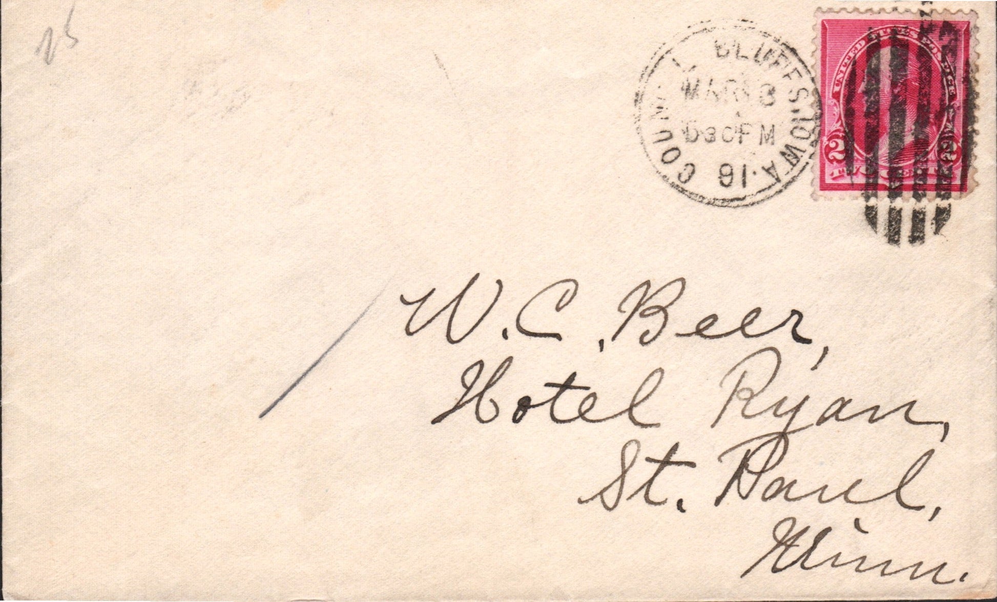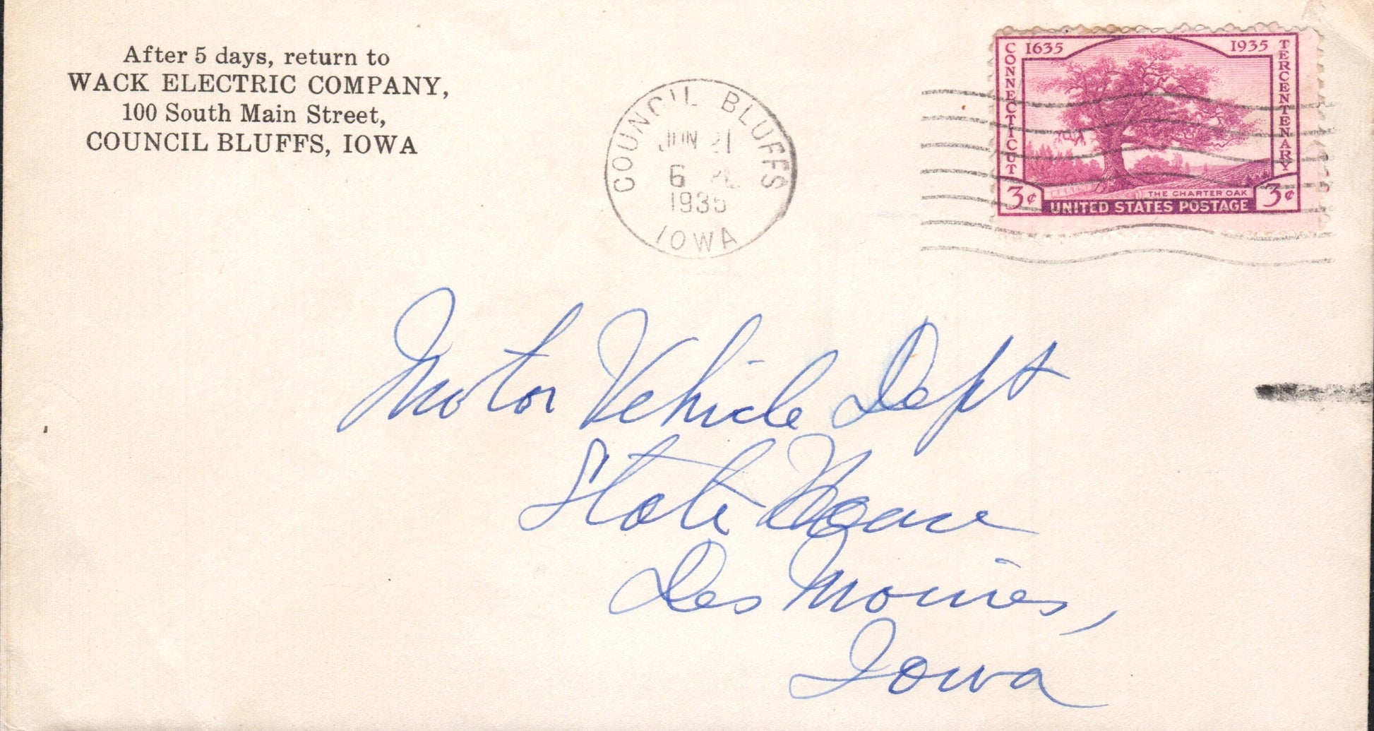 Council Bluffs Bold 1861 cds on small cover; readable 1881 duplex on cover, Hotel marking on back; 1935 machine cancel on cover, “Wack Electric Company” corner, 3¢ Connecticut stamp