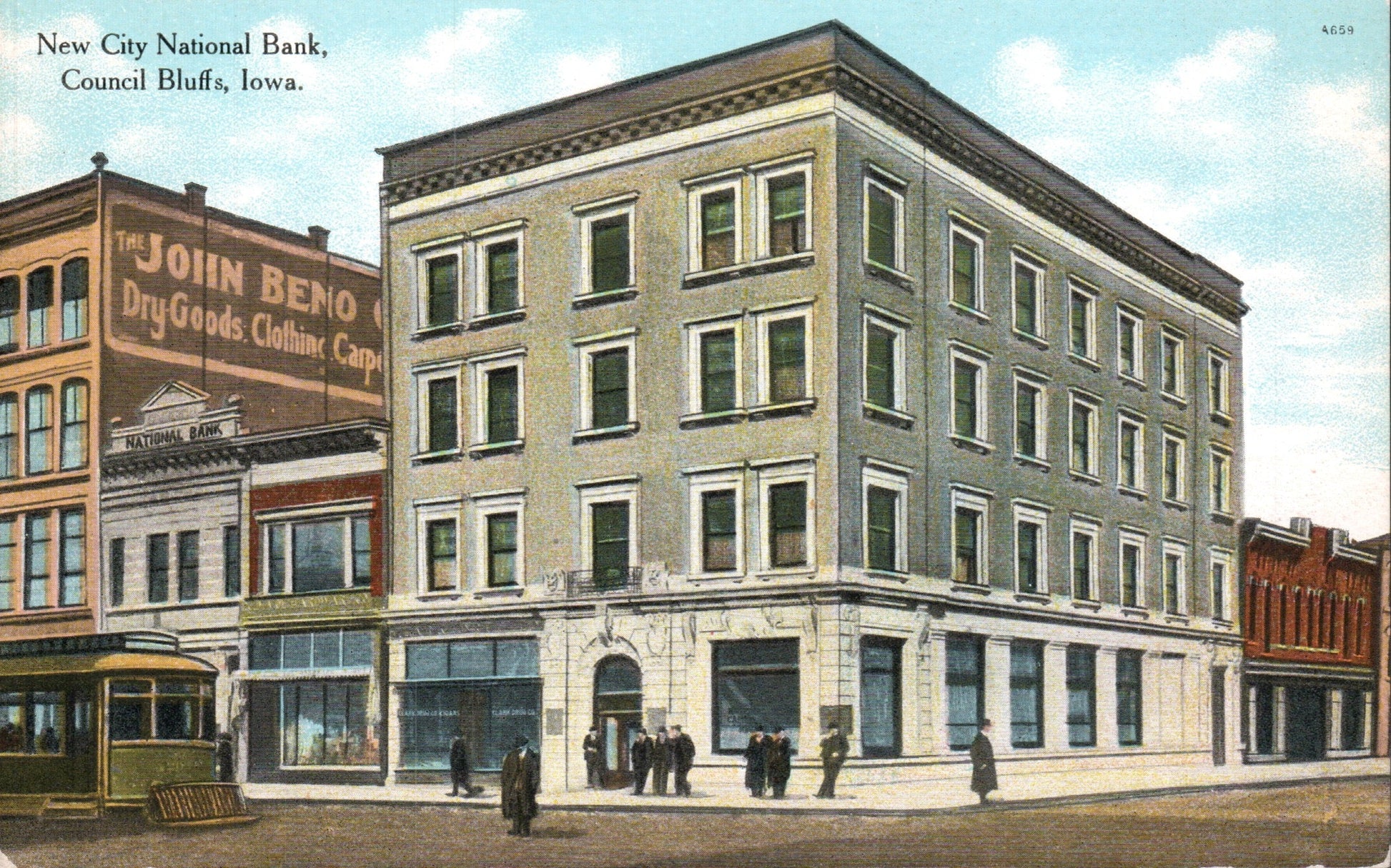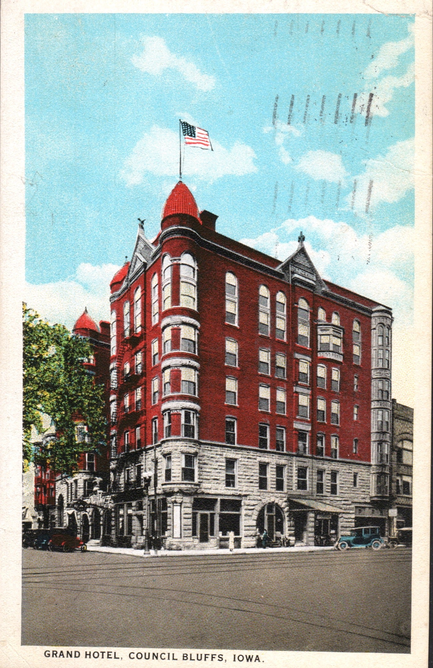 Post cards: “New City National Bank” [c.1910, streetcar]; Grand Hotel [1925]; Memorial to Mrs. G.M. Dodge [linen]