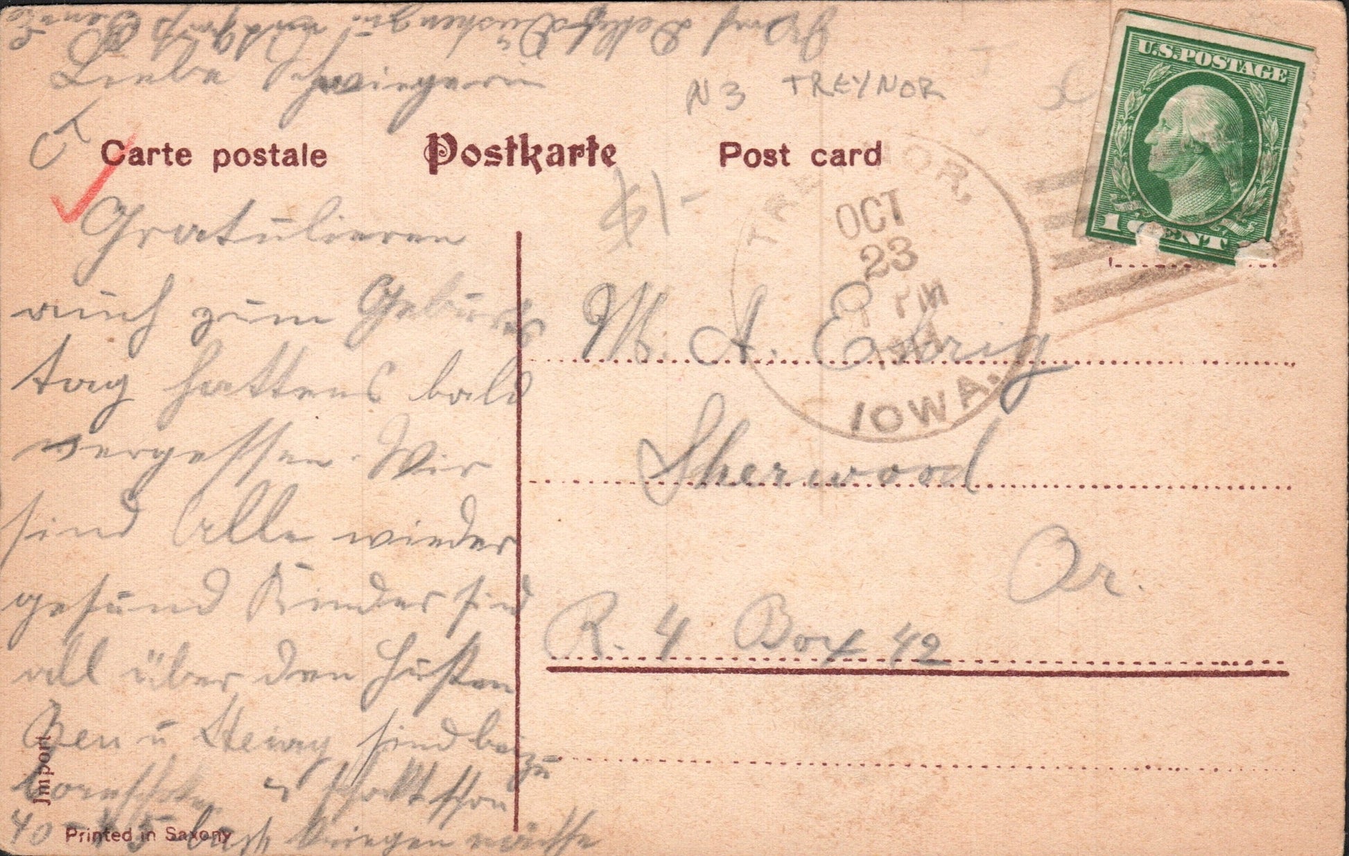 Treynor readable 1911 4-bar on post card; poor 1981 4-bar on cover