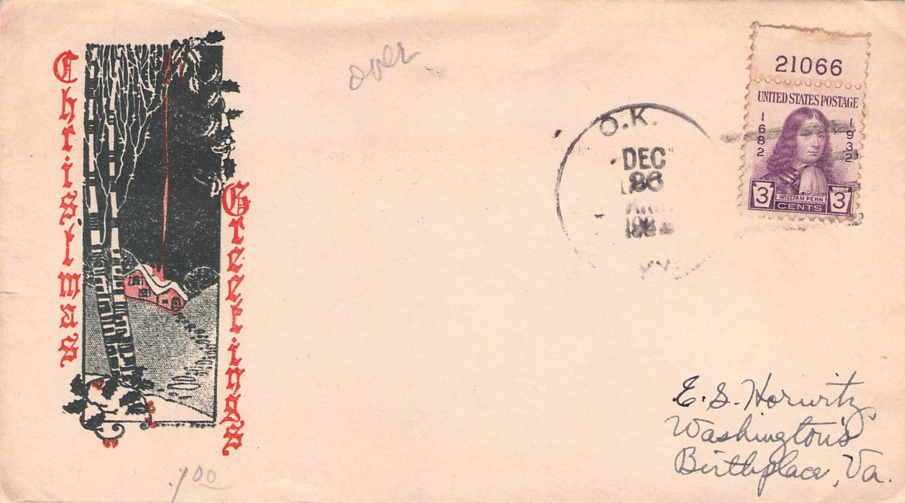 O.K. (1882-1942) 1932 4-bar on cover with Christmas cachet, plate block single of 3¢ Wm. Penn, and backstamp of Washington’s birthplace