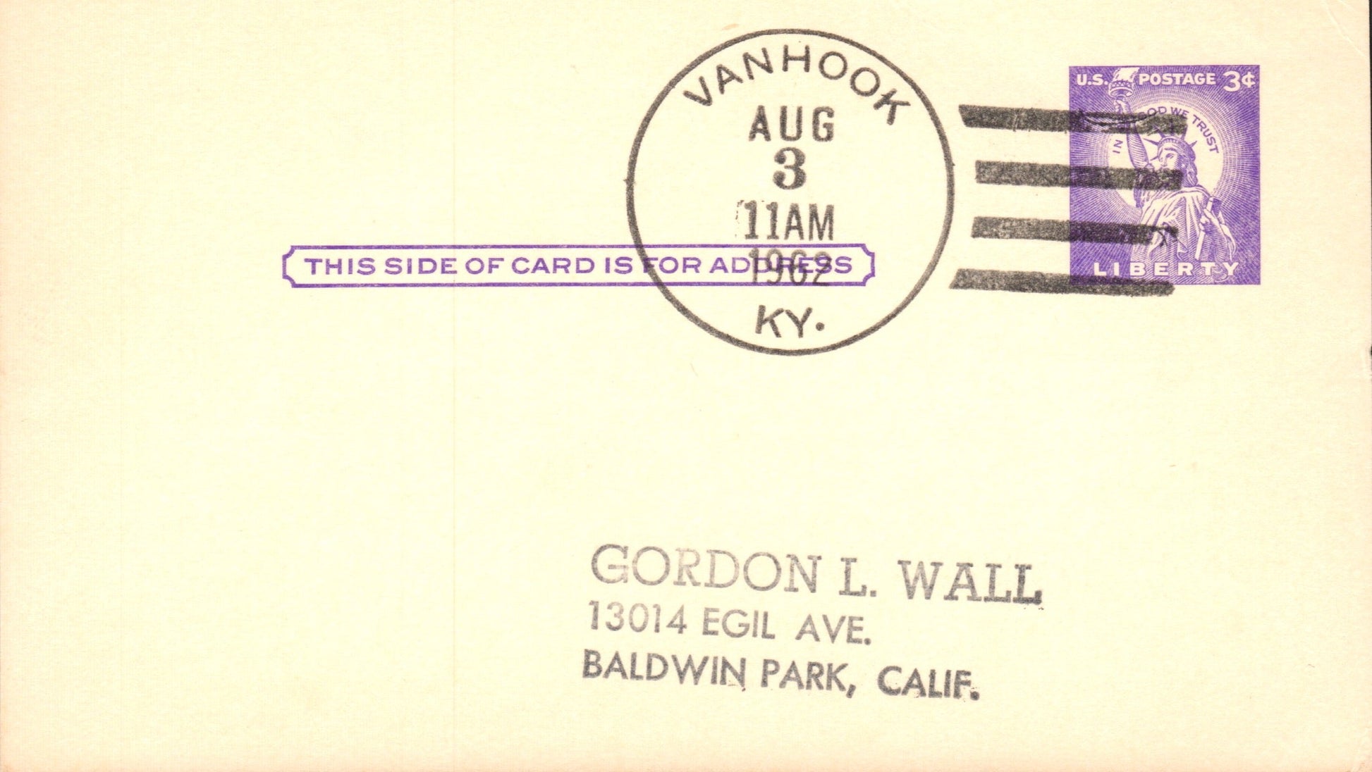 Vanhook (1898/1963) 1962 4-bar on Postal Card