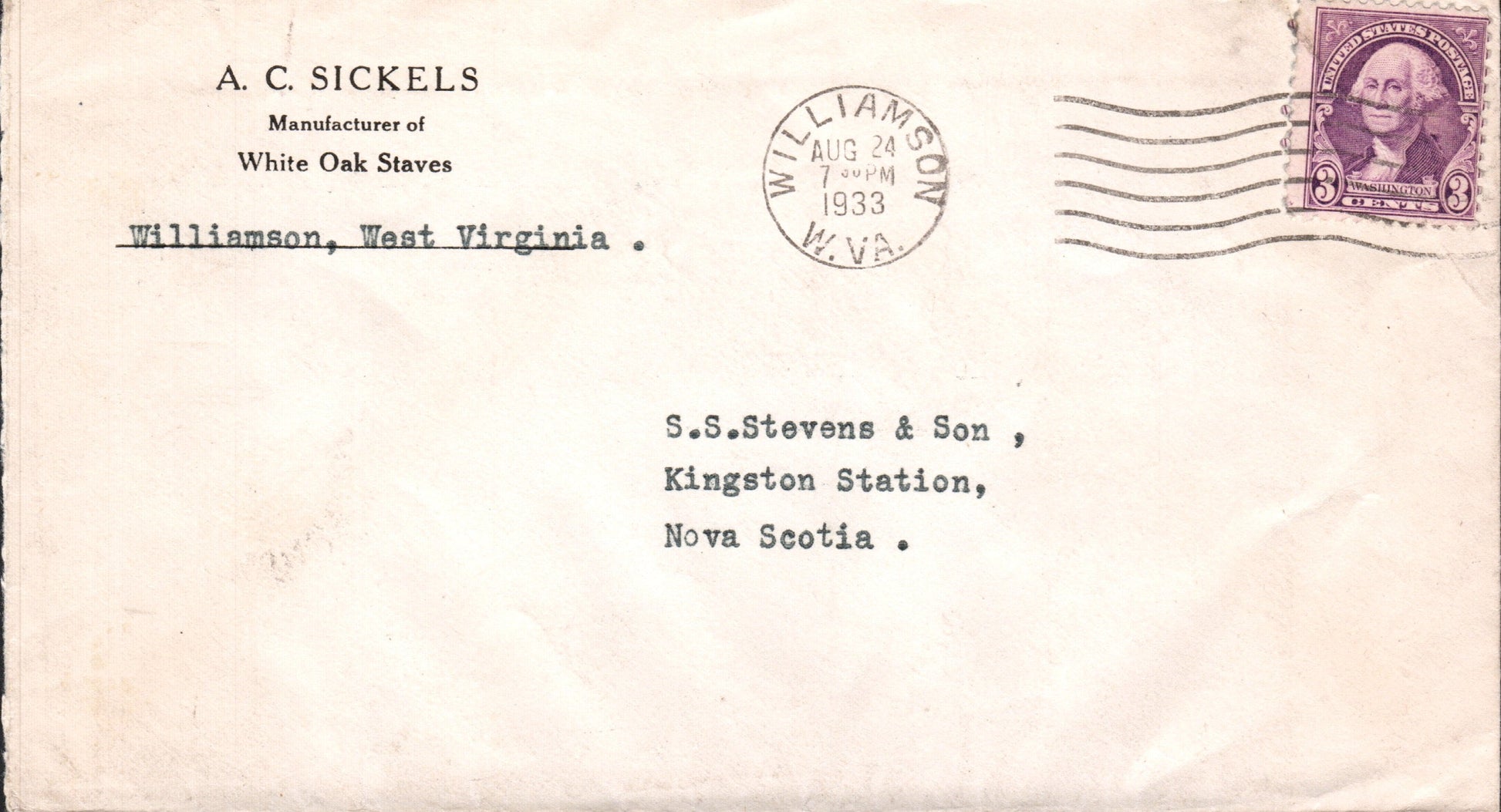 Williamson 1933 machine cancel on cover, “White Oak Staves” corner