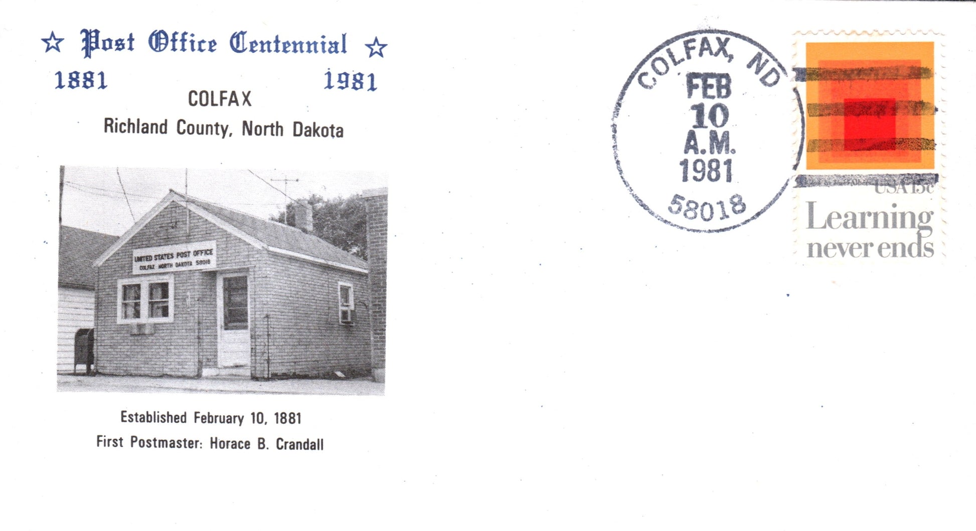 Colfax 1981 4-bar on cover, cacheted with photo of post office, 100th year of operation