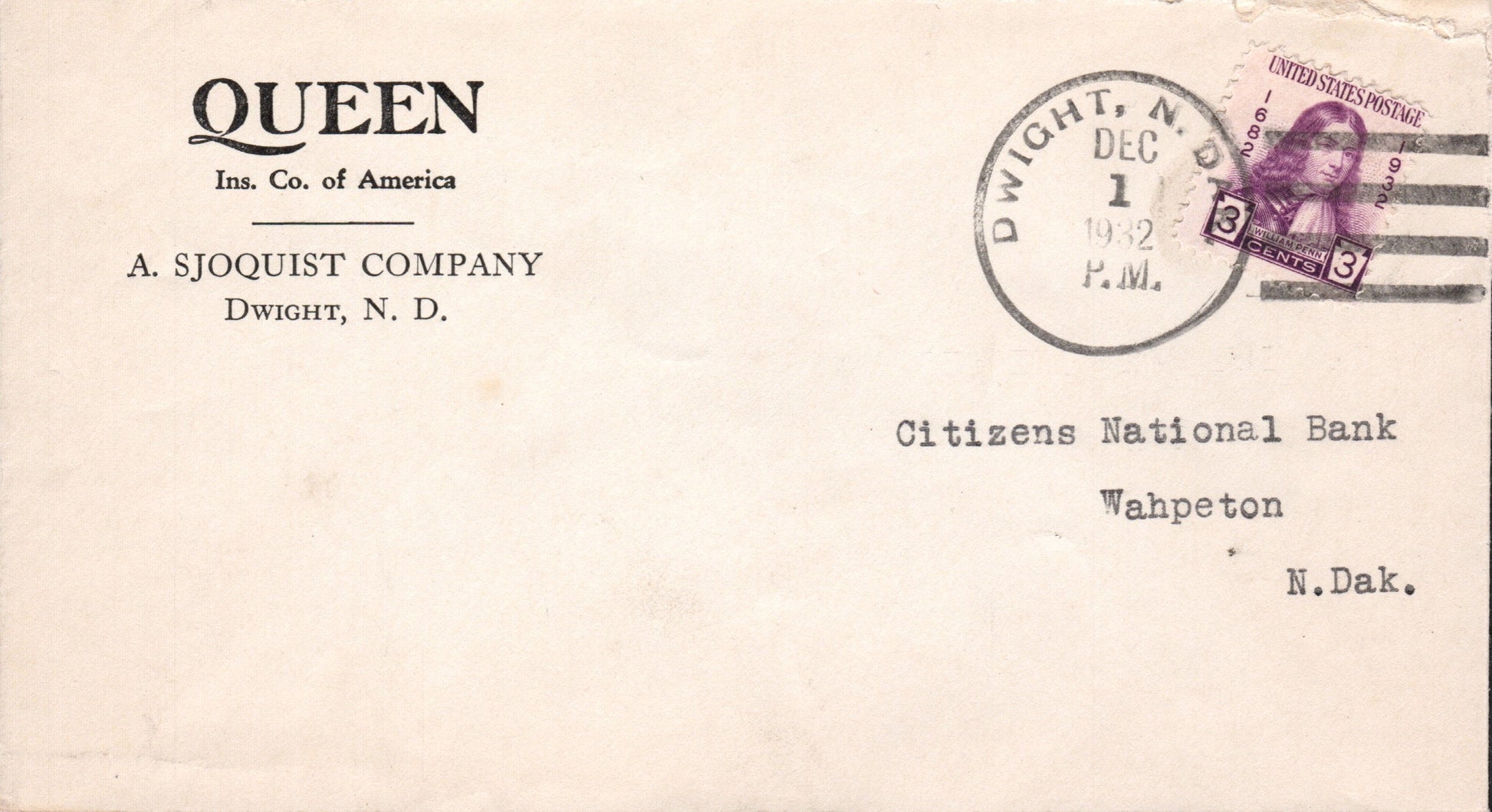 Dwight (1881-1978) 1932 4-bar on cover, Queen Insurance corner; 1981 4-bar on cover, cacheted with photo of post office, 100th year of operation