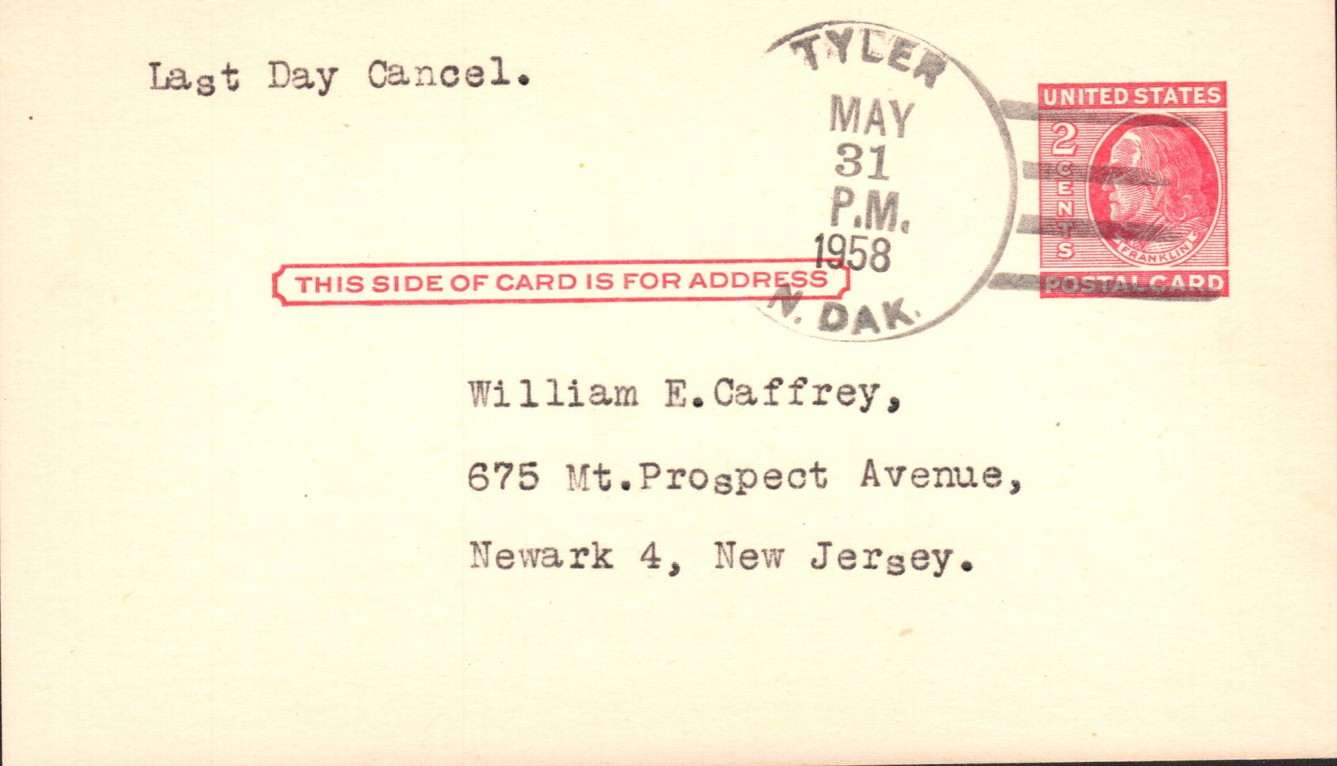 Tyler (1891-1958) 1932 4-bar on cover; 1958 4-bar on LD Postal Card