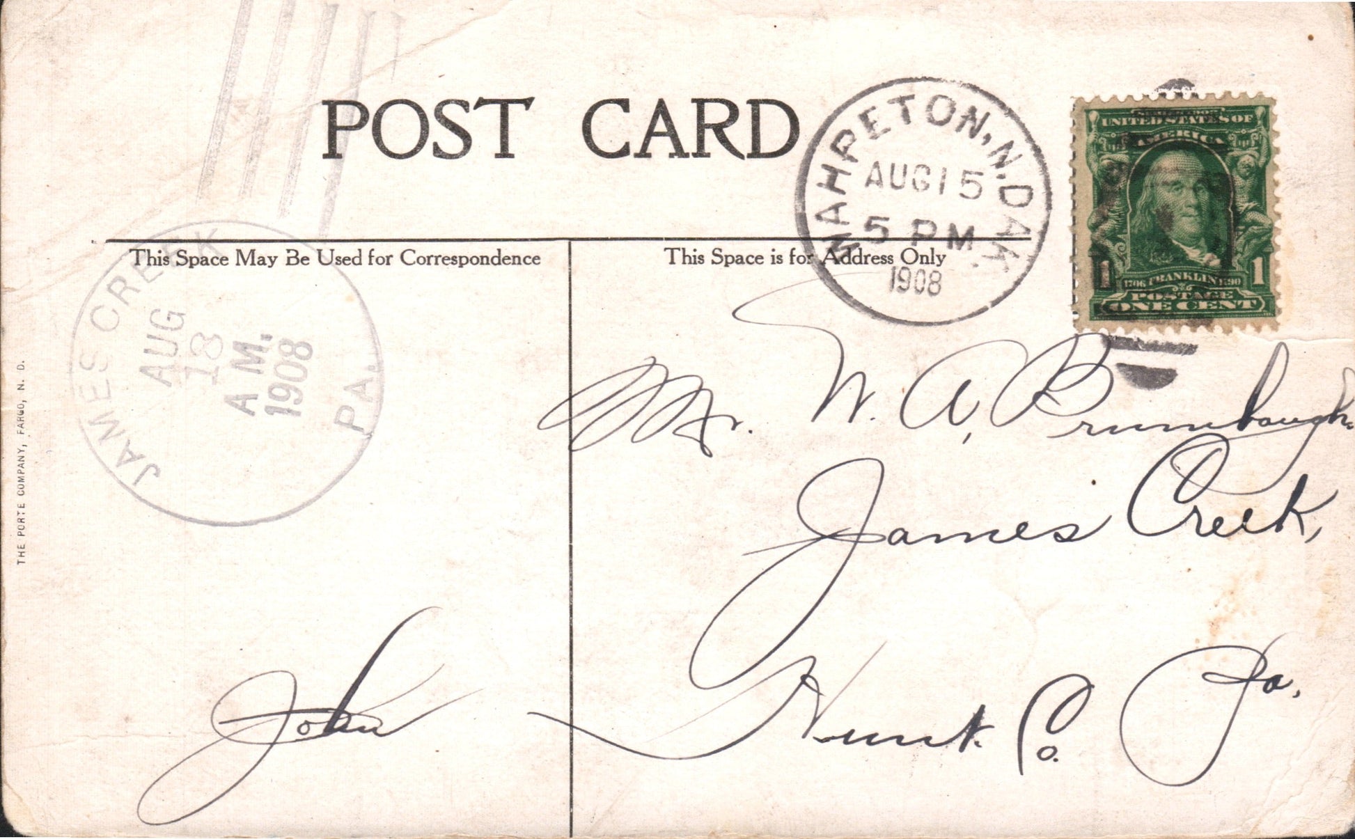 Wahpeton 1908 duplex on post card, view of U.S. Indian school. also James Creek, Penna. 4-bar as rec’d strike; 1974 machine cancel.