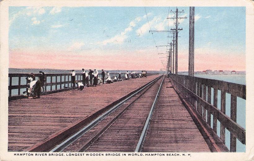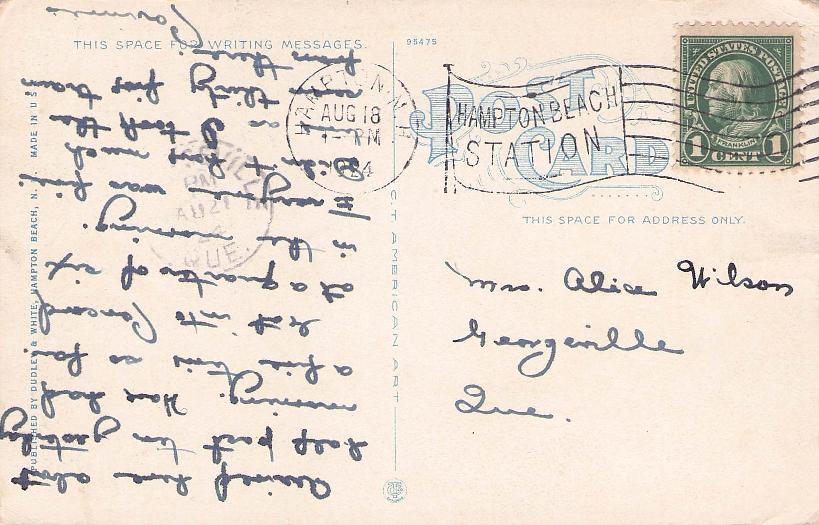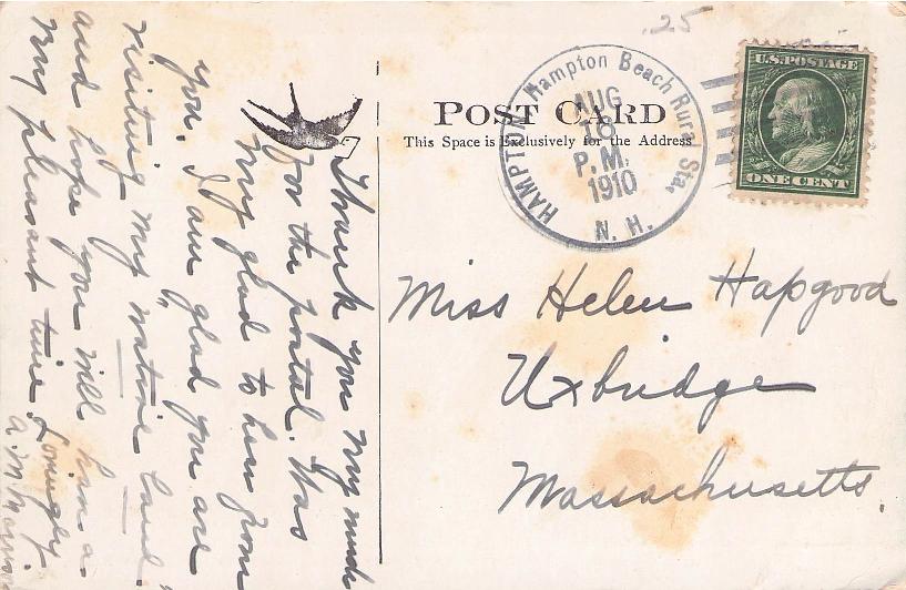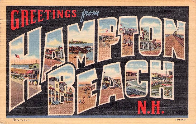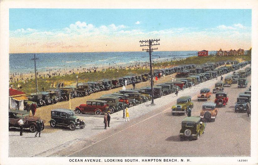 Post cards: Ocean Avenue, with many cars [c.1930]; The Ashworth, with poor 1915 RS postmark; Hampton River bridge, both pre-1930, one B&W]; Beach [chrome]; “Greetings from” in large letters [linen]; Boar’s Head [B&W, c.1910]