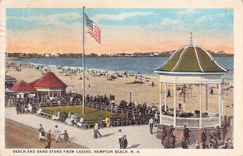 Hampton Beach S 1914 Flag cancel on post card, view of beach and band stand.