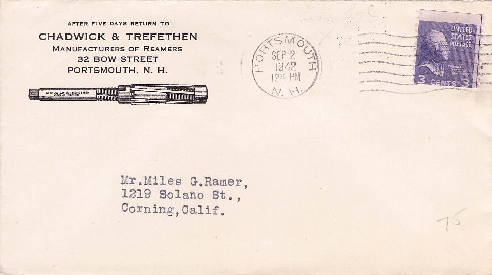 Portsmouth 1942 machine cancel on cover, “Chadwick & Trefethen, Manufacturers of Reamers” corner with illustration of a reamer.