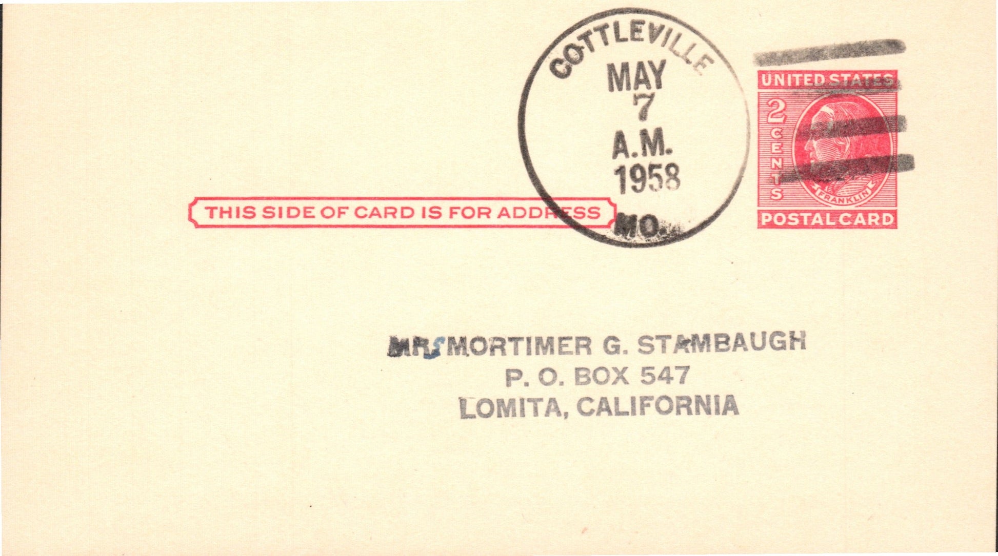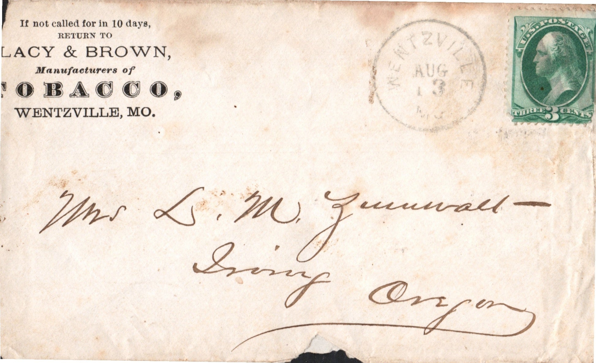 Wentzville c.1880 cds on cover, “Lacy & Brown, Tobacco,” corner, faults; 1908 duplex on post card