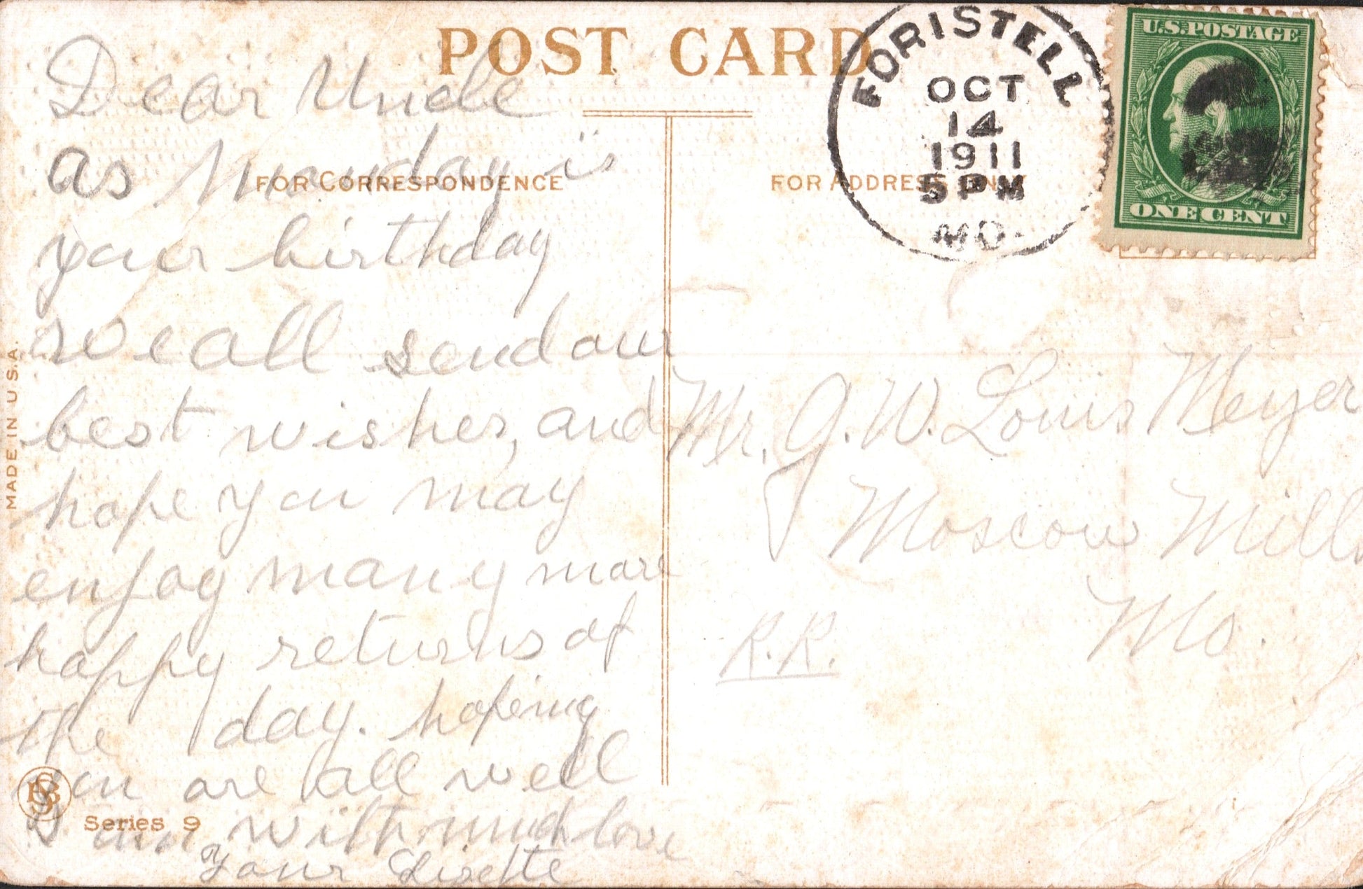 Foristell 1911 cds on post card; 1916 4-bar on post card