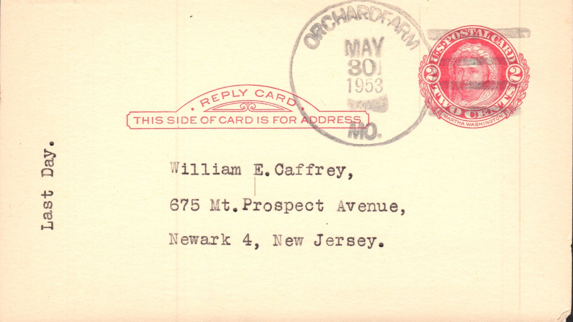 Orchardfarm (1894-1953) 1953 4-bar on Last Day Postal Card