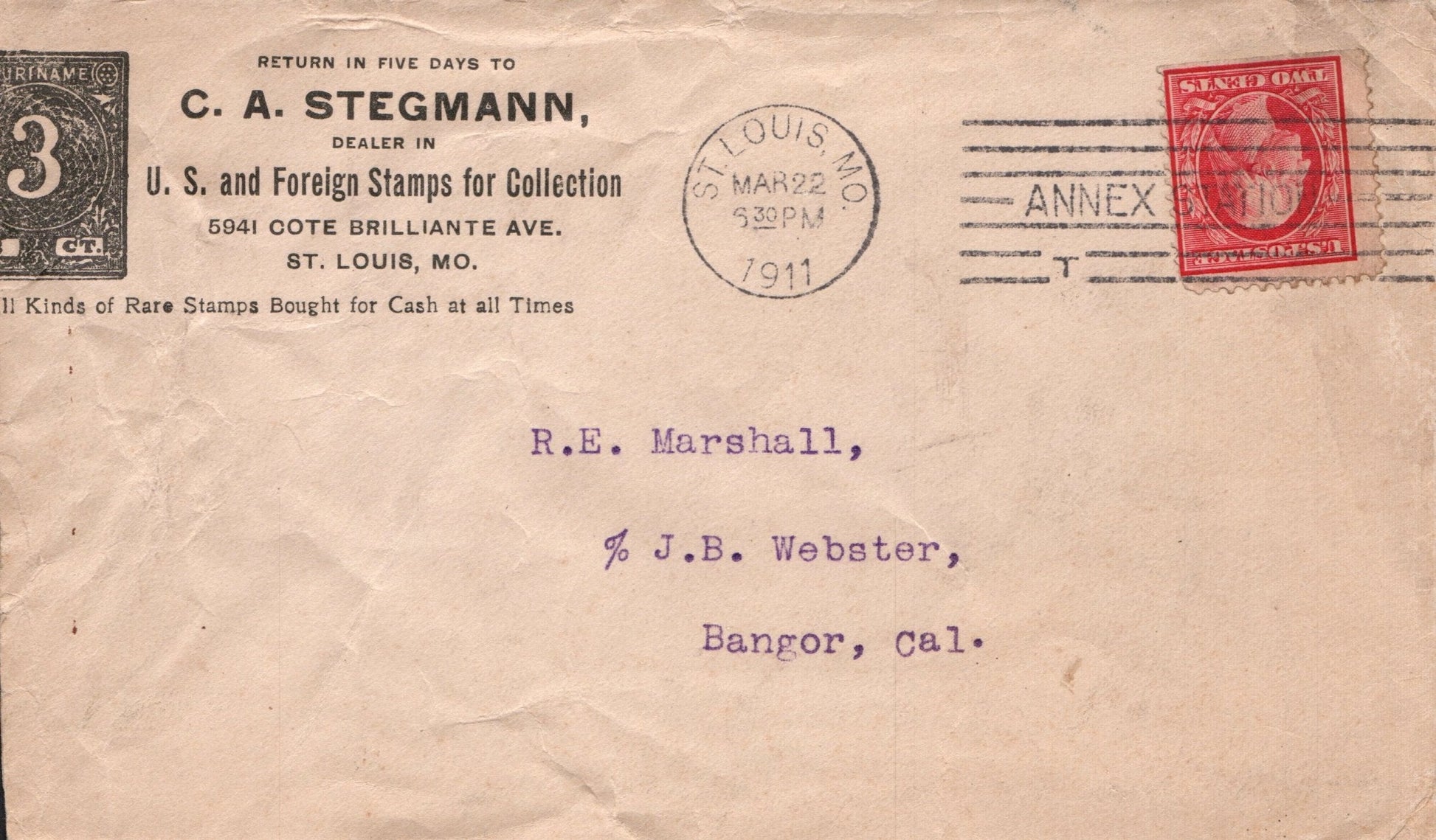 Annex Sta. 1911 machine cancel on cover, C.A. Stegmann, stamp dealer, corner