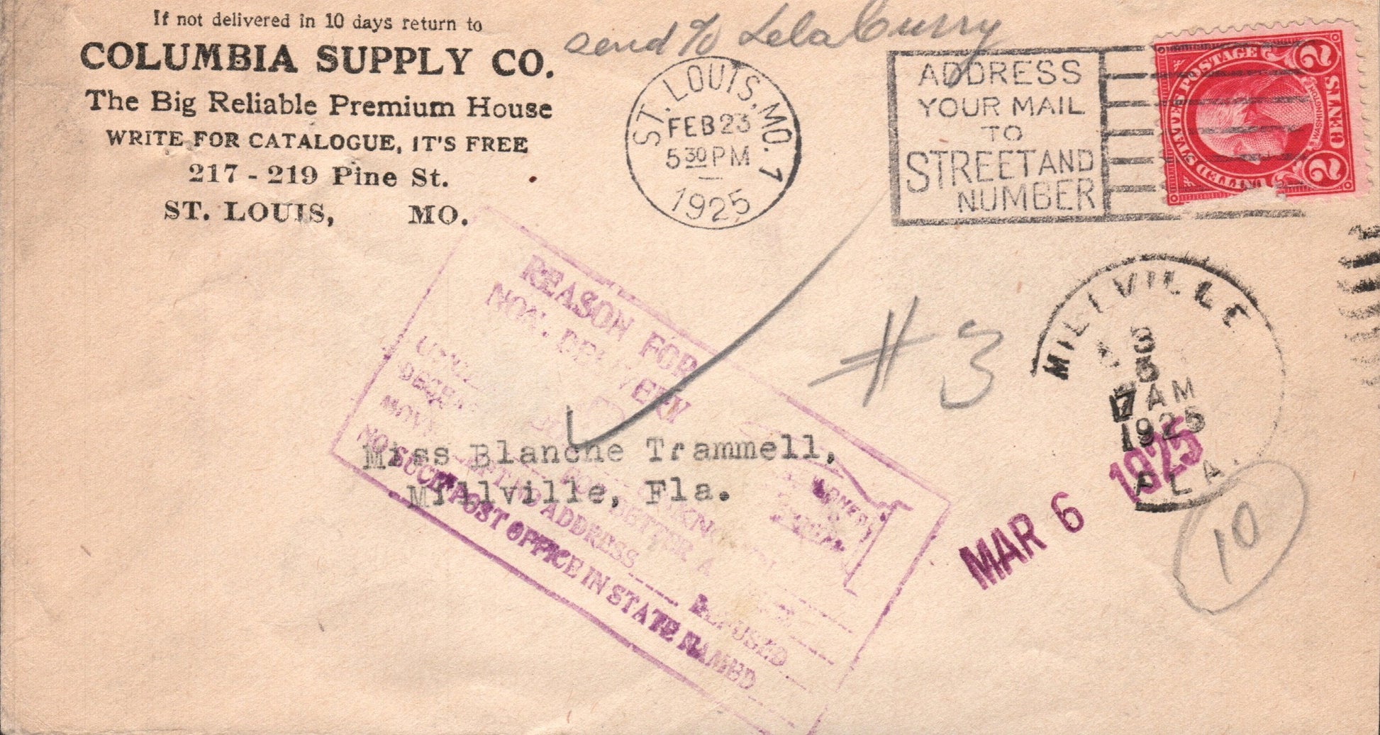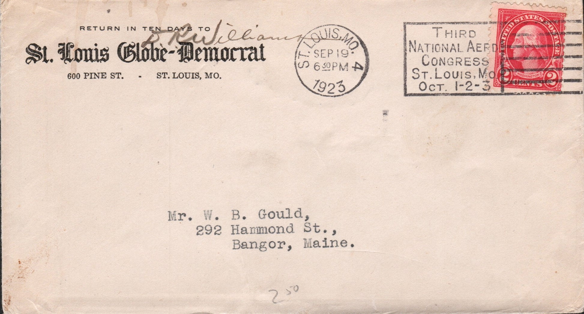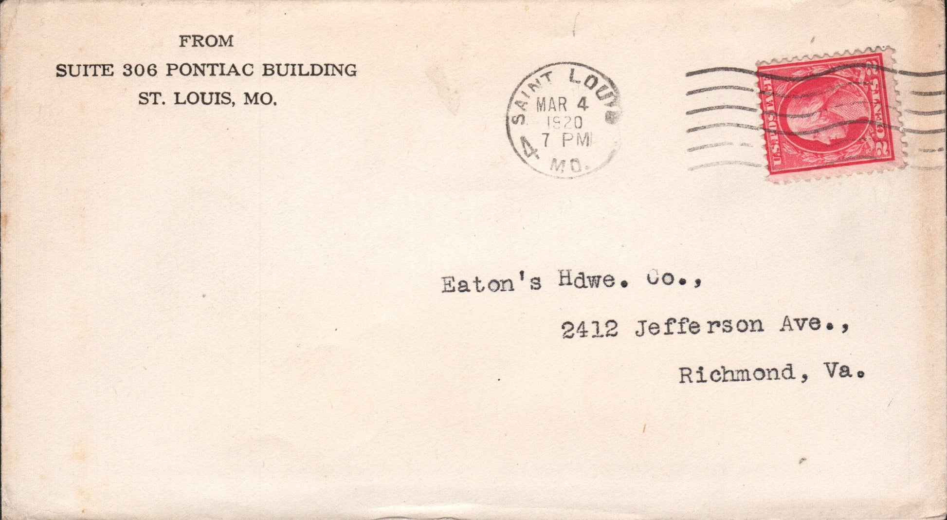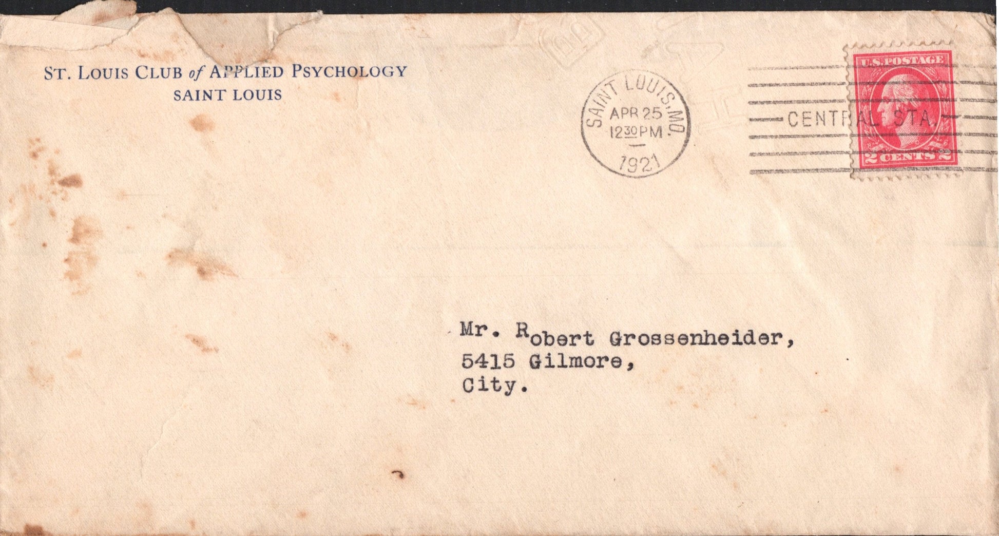 Central Sta. 1921 machine cancel on cover, ragged top into corner “St. Louis Club of Applied Psychology