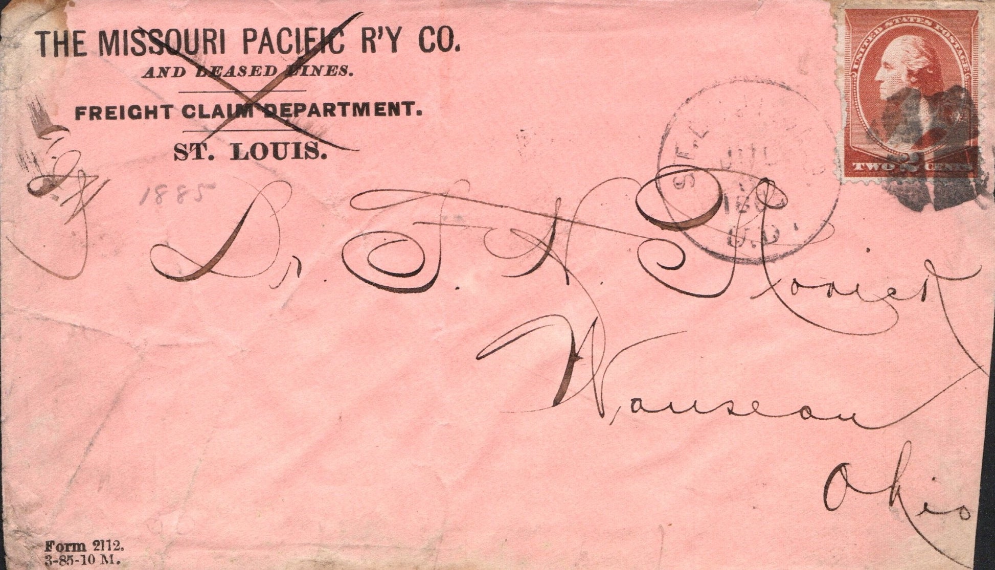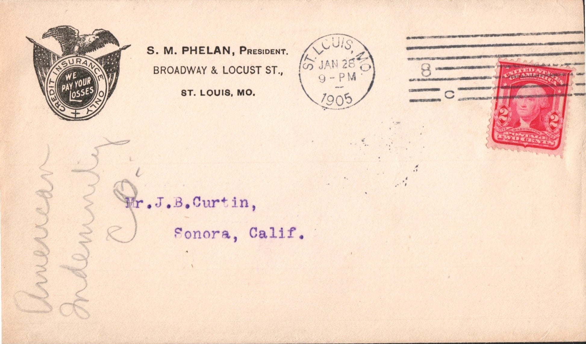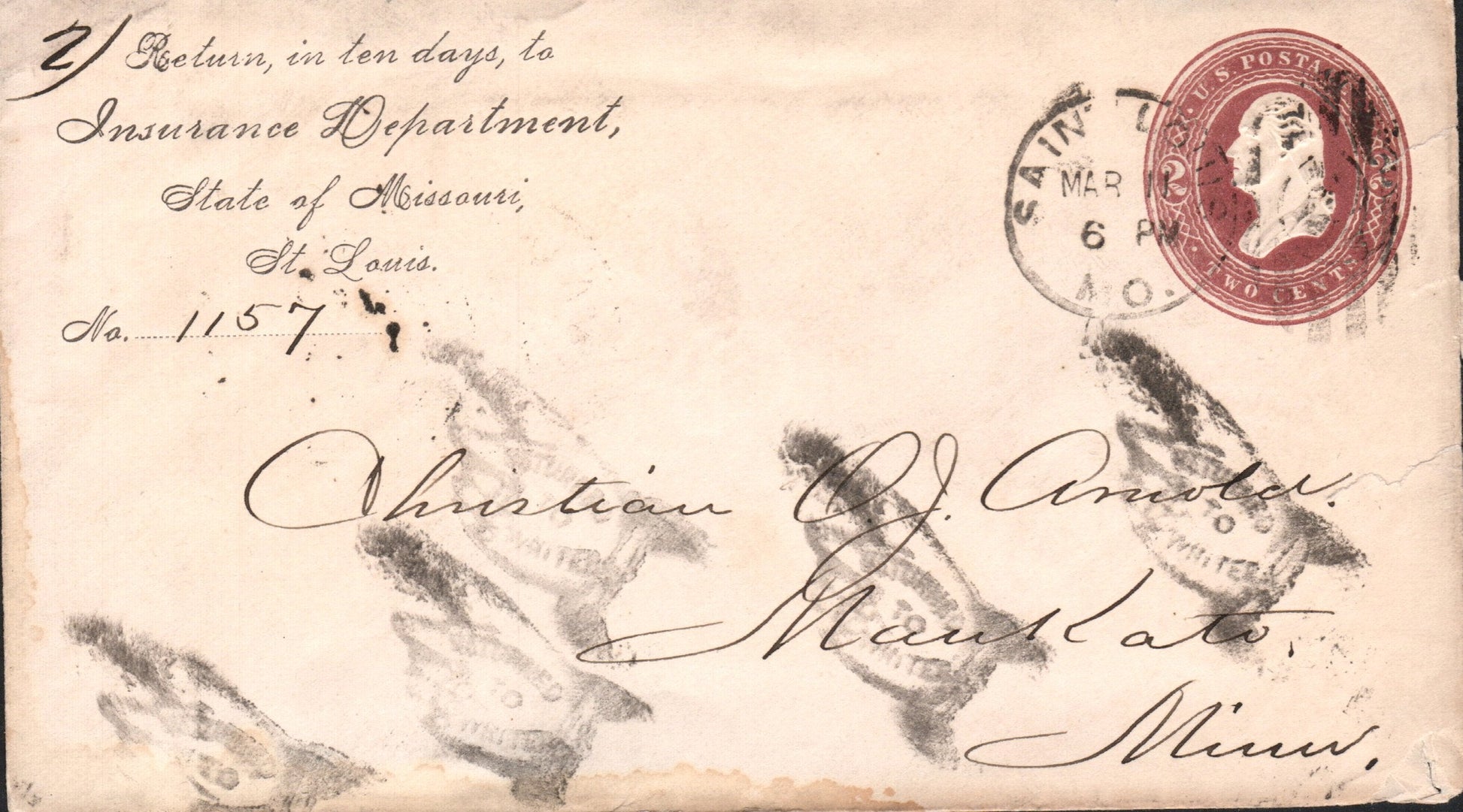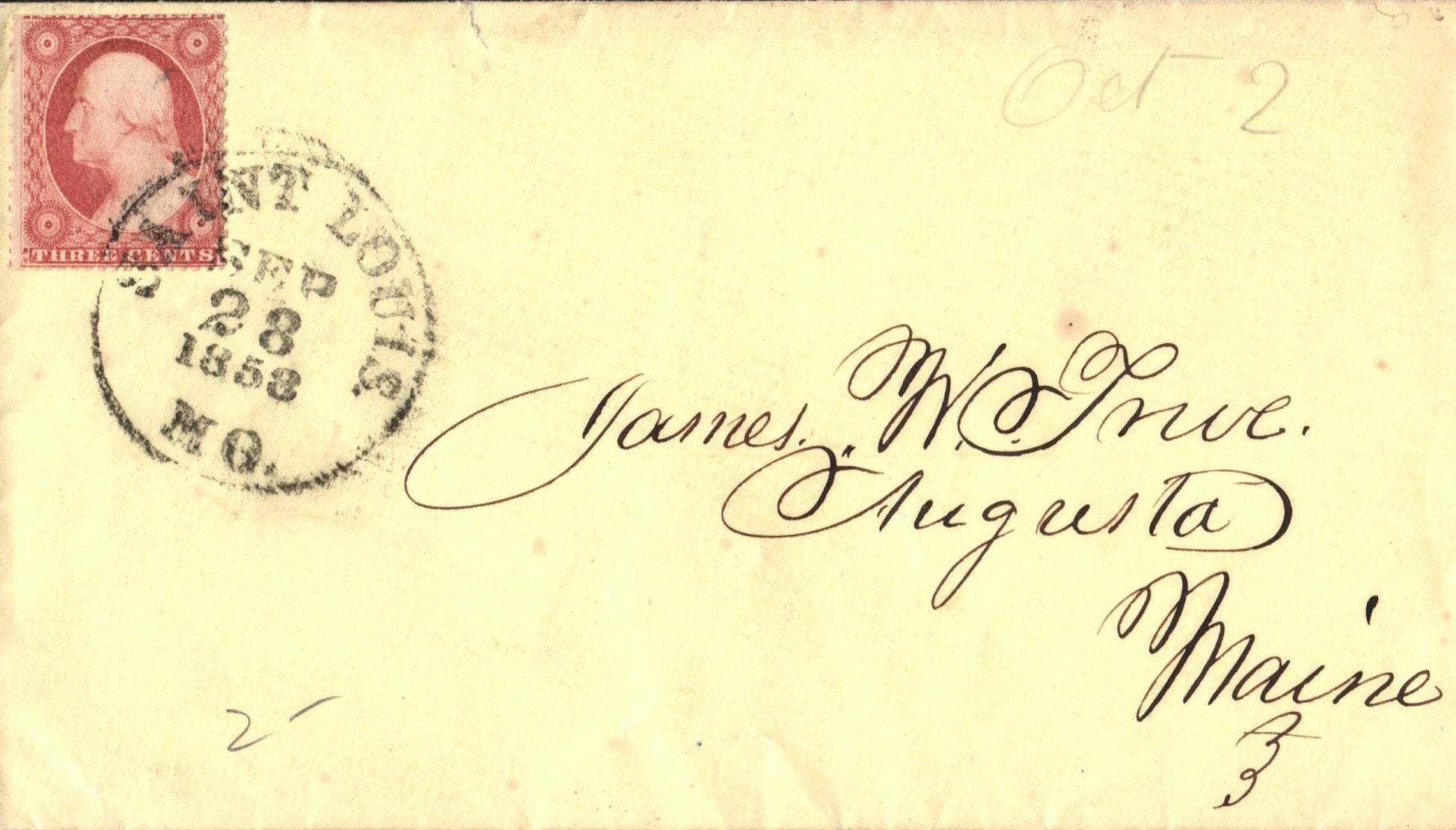 Saint Louis: fine 1858 cds on cover to Maine; c.1870s cds on cover; 1885 cds & cork killer on pink cover, corner “Freight Claim Dept, Missouri Pacific R’y Co.; 1888 cds. on cover with 5 “pointing fingers”, corner of Mo. State Insurance dept.; 1888 duplex, star-in-bars killer on postal card announcing meeting of German Club (in German); c.1890s off top of cover, corner “Harrison Wire Co.”; 1894 duplex (“C” in killer) on Postal Card; 1899 oval machine cancel, corner “Scharff-Bernheimer Grocer Co.” with contents; 1905 machine [die 8] on cover, “Credit Insurance”; 1905 machine [die 8] on cover, “Barr & Widen Mercantile Agency“ corner; 1905 machine [die 1] on cover, corner “Rice Stix Dry Goods Co.”; 1905 machine [die 6] on cover, corner “Fulsen, Klein & Krausse Mfg. Co.”; 1910 machine [die 7] on post card; 1911 machine [no die no.] on post card; 1913 machine [die 2] on post card; 1917 machine slogan “Food will win the War” on post card; 1919 machine [die 2] on cover; 1920 machine [die 4] on cover; 1923 machine slogan “Third National AEFD Congress,” “St. Louis Globe-Democrat” corner; 1925 machine slogan “Register or Insure your Valuables” on cover, “Golden Churn Brand Butter Color Laboratories” corner, purple blotch detracts; 1925 machine “Address Street and Number” slogan on cover, corner “Columbia Supply Co.,” also Millville Fla. cds and “Reason for Non-Delivery” marking; 1927 “Airmail Saves Time” slogan on cover, circular stamp “Lindbergh Celebration. June 18, 1927”; 1929 duplex [“14”] & auxiliary mark “This is the mail for which you sent postage” on post card; 1935 “Mail Early for Christmas” slogan on cover, “Charter Oak Stove & Range Co.” corner; 1937 machine “Savings Bonds” slogan on cover, Wisconsin corner; 1937 duplex [“24”] on fancy cover cacheted “Twentieth Anniversary of First St. Louis Air Mail Flight”; 1937 machine “Savings Bond” slogan on cover, corner “The Baic Company”; 1944 machine “War Savings” slogan on post card, stamp removed; 1944 campaign advertising for “James W. Griffin for Circuit Attorney” printed on wrong side of postal card, “Street and Number” slogan; 1945 hand stamp on cover with 3¢ postage due stamp and marking; 1949 machine “Community Chest” slogan on post card; 1958 double circle on cover with “Pacific Railroad” favor marking; 1959 machine (die 13) on postal card; 1960 First Day of 7¢ airmail stamp on cover; 1961 National Park slogan on post card; 1967 “Aliens Must Report” slogan on cover; 1988 machine cancel on cover, “Heritage of St. Louis” cachet; 1990 First Day of issue on 15¢ Fur Traders Postal Card; 2000 machine on cover; 2006 straight line machine cancel on cover; 2006 pictorial postmark, “Louis & Clark Bicentennial”; 1935 SPA Convention Sta.