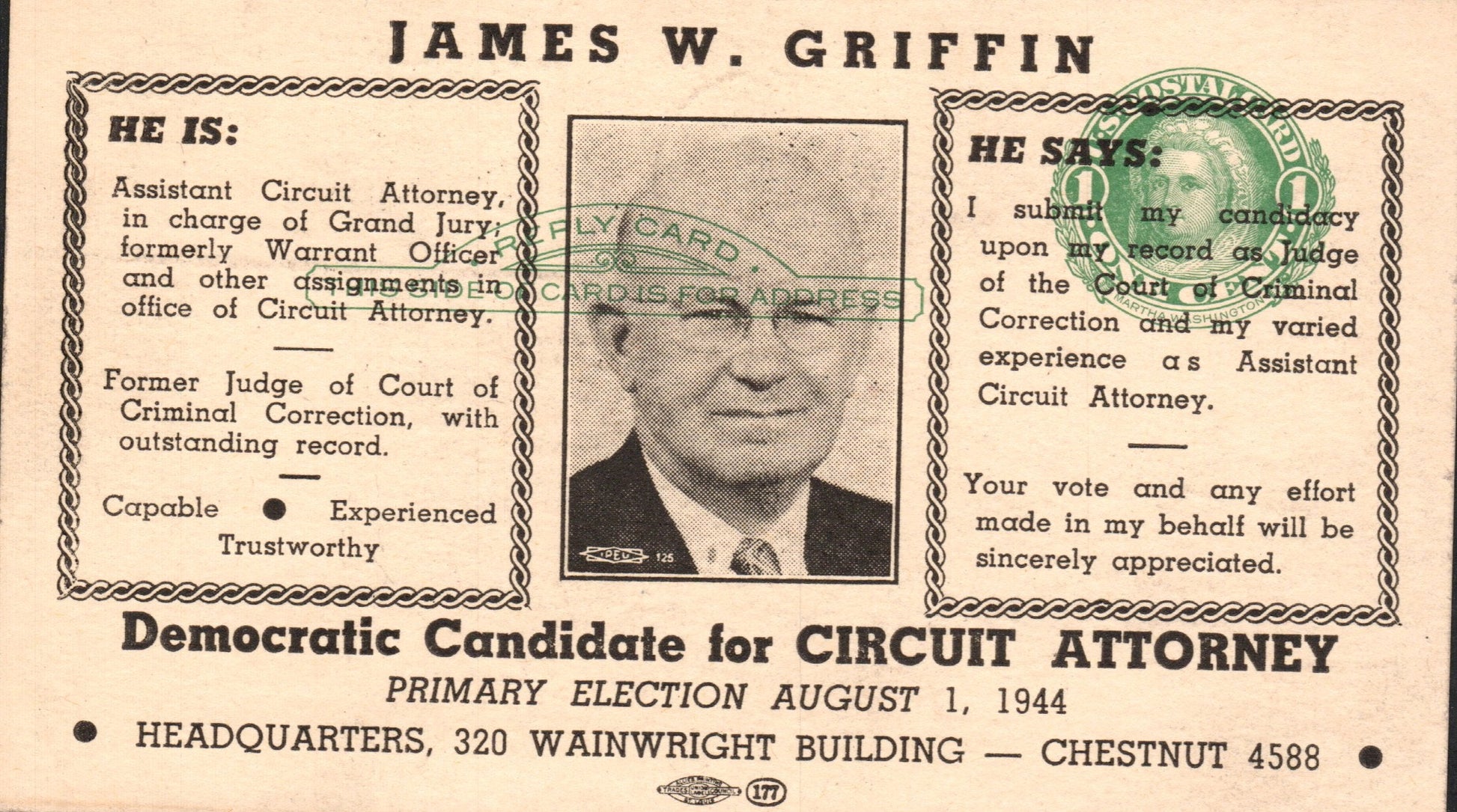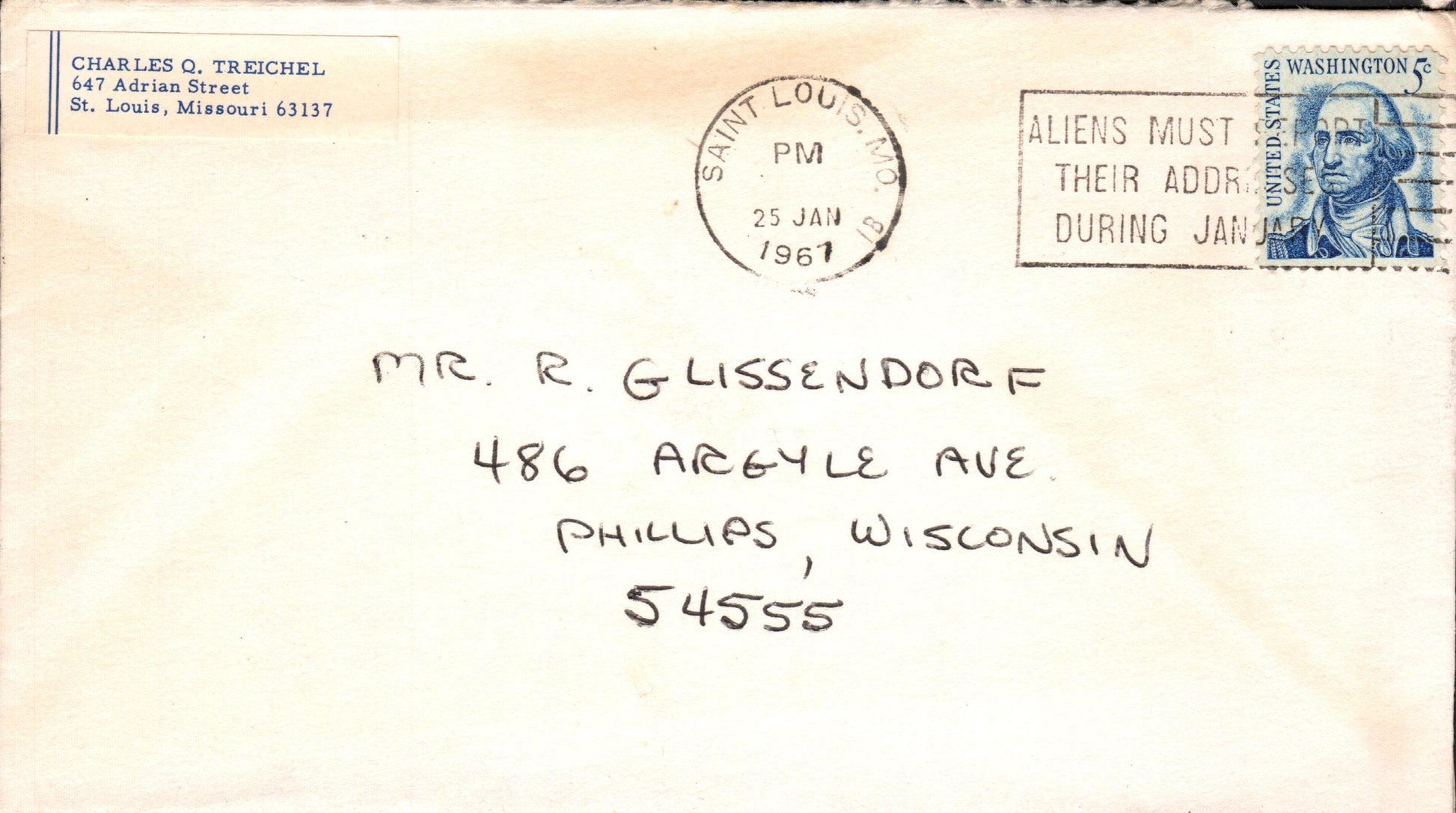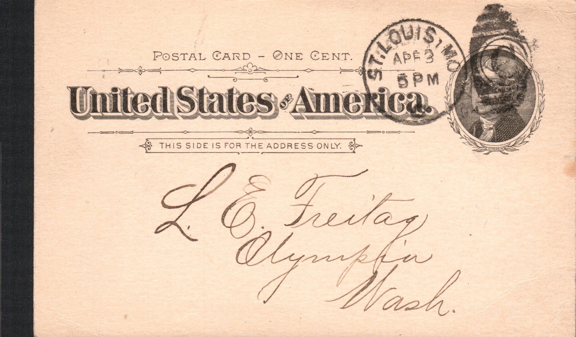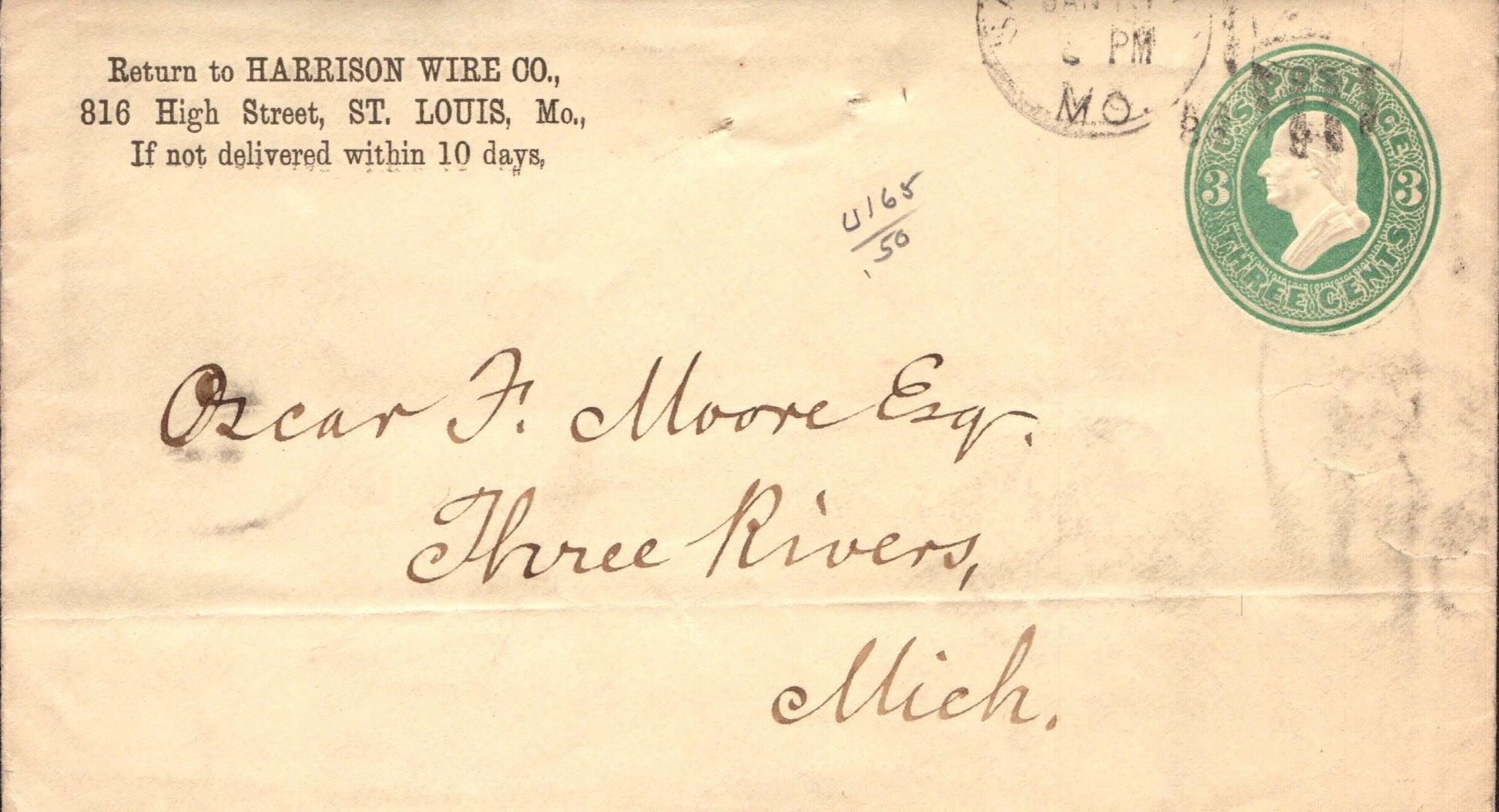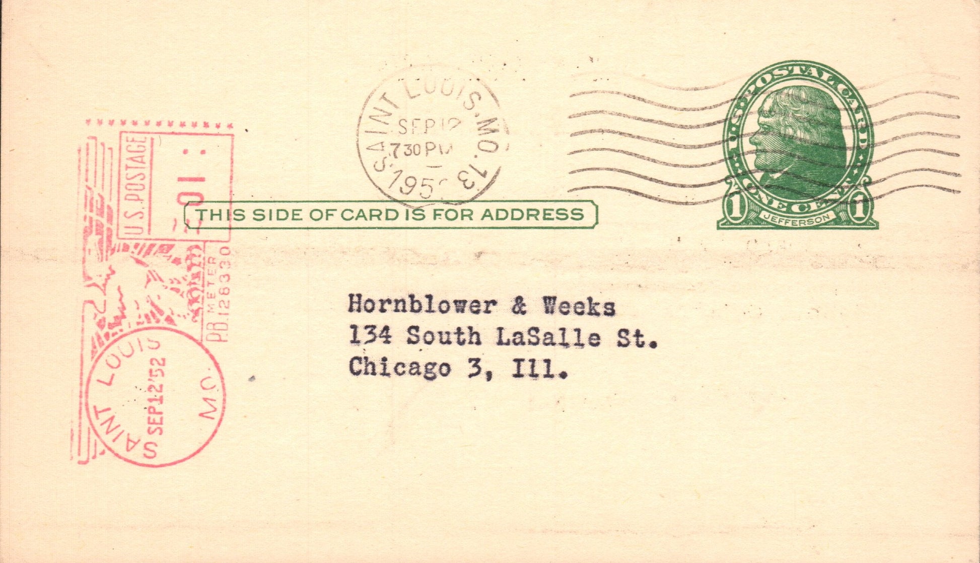 Saint Louis: fine 1858 cds on cover to Maine; c.1870s cds on cover; 1885 cds & cork killer on pink cover, corner “Freight Claim Dept, Missouri Pacific R’y Co.; 1888 cds. on cover with 5 “pointing fingers”, corner of Mo. State Insurance dept.; 1888 duplex, star-in-bars killer on postal card announcing meeting of German Club (in German); c.1890s off top of cover, corner “Harrison Wire Co.”; 1894 duplex (“C” in killer) on Postal Card; 1899 oval machine cancel, corner “Scharff-Bernheimer Grocer Co.” with contents; 1905 machine [die 8] on cover, “Credit Insurance”; 1905 machine [die 8] on cover, “Barr & Widen Mercantile Agency“ corner; 1905 machine [die 1] on cover, corner “Rice Stix Dry Goods Co.”; 1905 machine [die 6] on cover, corner “Fulsen, Klein & Krausse Mfg. Co.”; 1910 machine [die 7] on post card; 1911 machine [no die no.] on post card; 1913 machine [die 2] on post card; 1917 machine slogan “Food will win the War” on post card; 1919 machine [die 2] on cover; 1920 machine [die 4] on cover; 1923 machine slogan “Third National AEFD Congress,” “St. Louis Globe-Democrat” corner; 1925 machine slogan “Register or Insure your Valuables” on cover, “Golden Churn Brand Butter Color Laboratories” corner, purple blotch detracts; 1925 machine “Address Street and Number” slogan on cover, corner “Columbia Supply Co.,” also Millville Fla. cds and “Reason for Non-Delivery” marking; 1927 “Airmail Saves Time” slogan on cover, circular stamp “Lindbergh Celebration. June 18, 1927”; 1929 duplex [“14”] & auxiliary mark “This is the mail for which you sent postage” on post card; 1935 “Mail Early for Christmas” slogan on cover, “Charter Oak Stove & Range Co.” corner; 1937 machine “Savings Bonds” slogan on cover, Wisconsin corner; 1937 duplex [“24”] on fancy cover cacheted “Twentieth Anniversary of First St. Louis Air Mail Flight”; 1937 machine “Savings Bond” slogan on cover, corner “The Baic Company”; 1944 machine “War Savings” slogan on post card, stamp removed; 1944 campaign advertising for “James W. Griffin for Circuit Attorney” printed on wrong side of postal card, “Street and Number” slogan; 1945 hand stamp on cover with 3¢ postage due stamp and marking; 1949 machine “Community Chest” slogan on post card; 1958 double circle on cover with “Pacific Railroad” favor marking; 1959 machine (die 13) on postal card; 1960 First Day of 7¢ airmail stamp on cover; 1961 National Park slogan on post card; 1967 “Aliens Must Report” slogan on cover; 1988 machine cancel on cover, “Heritage of St. Louis” cachet; 1990 First Day of issue on 15¢ Fur Traders Postal Card; 2000 machine on cover; 2006 straight line machine cancel on cover; 2006 pictorial postmark, “Louis & Clark Bicentennial”; 1935 SPA Convention Sta.