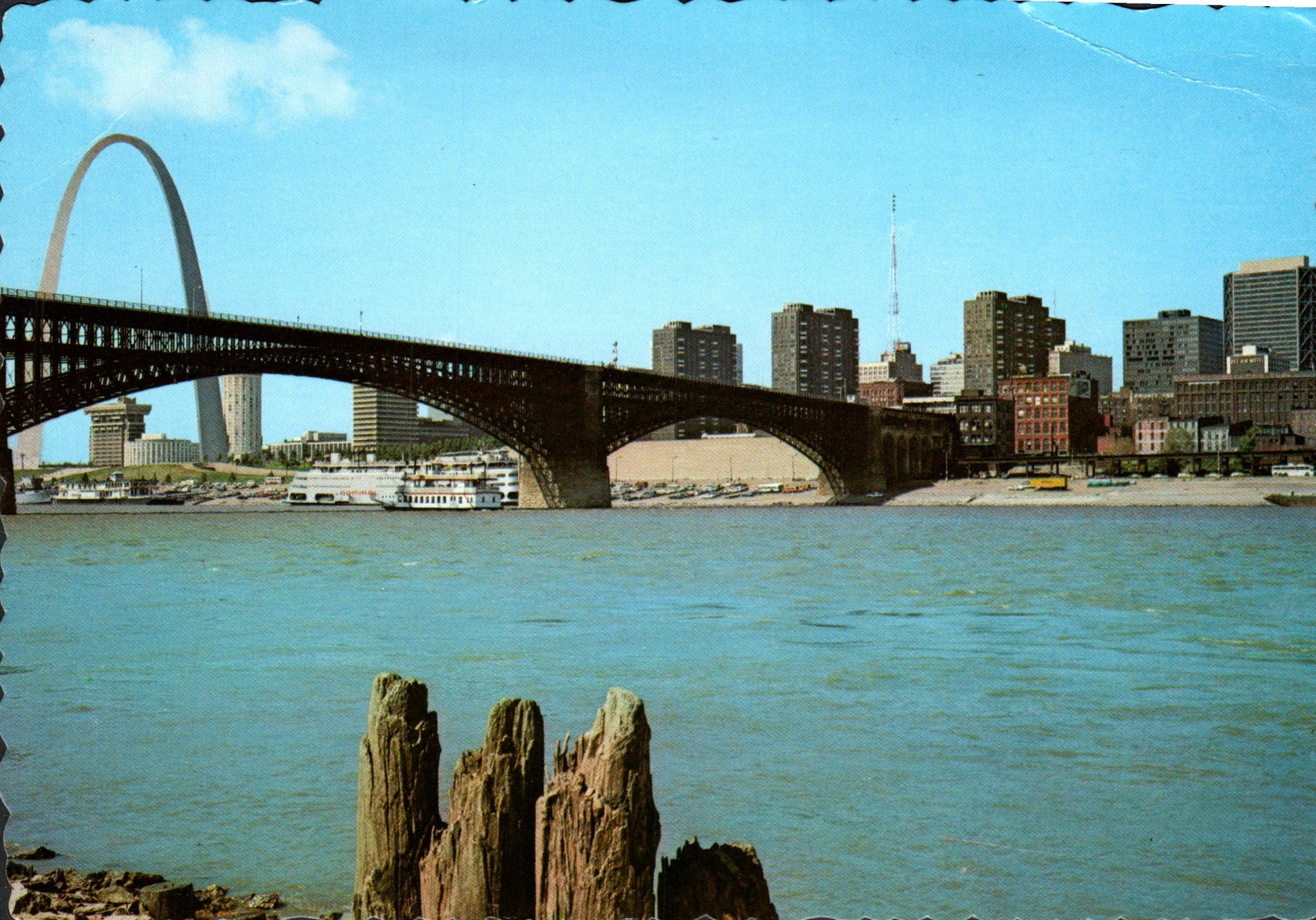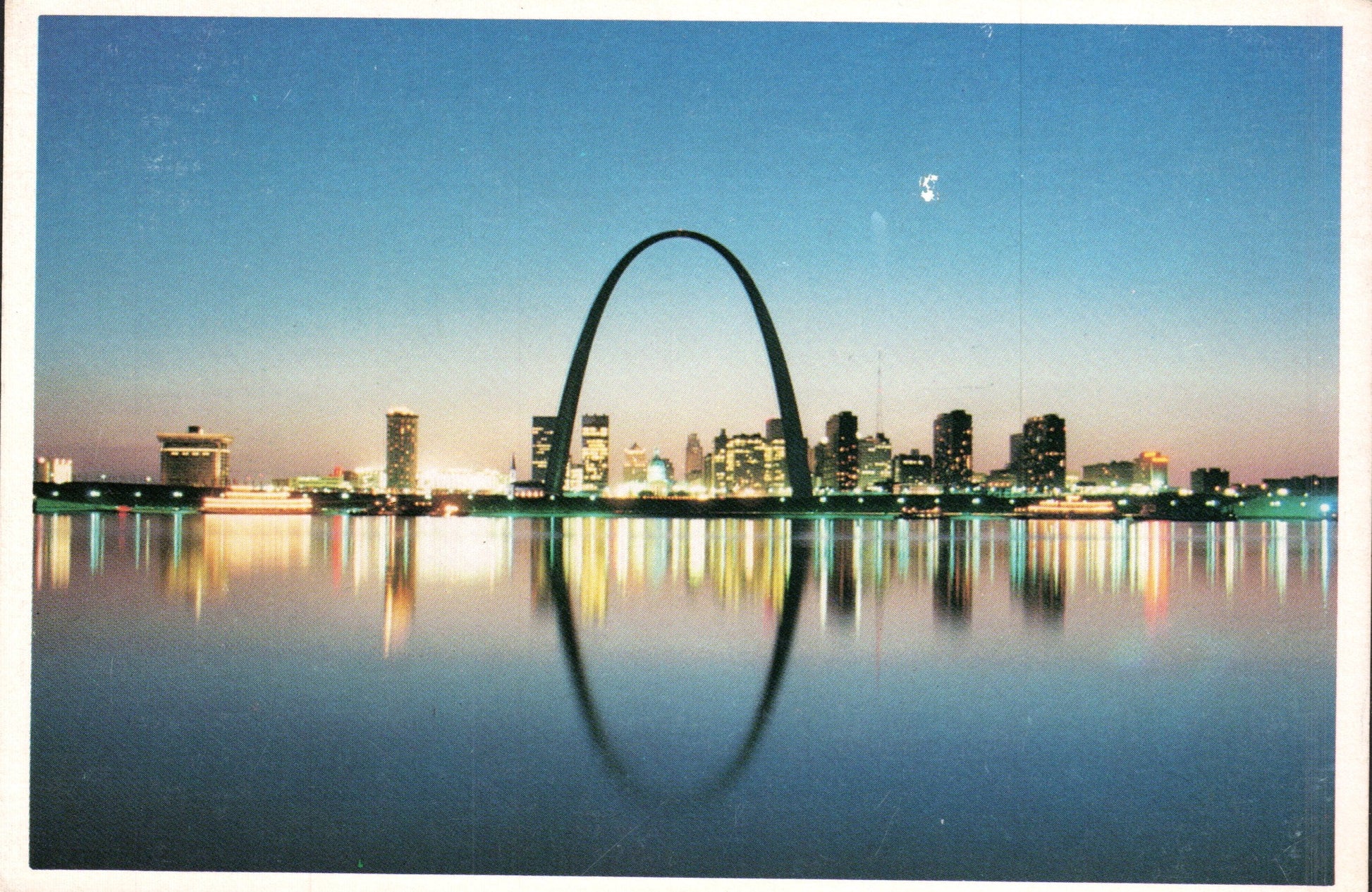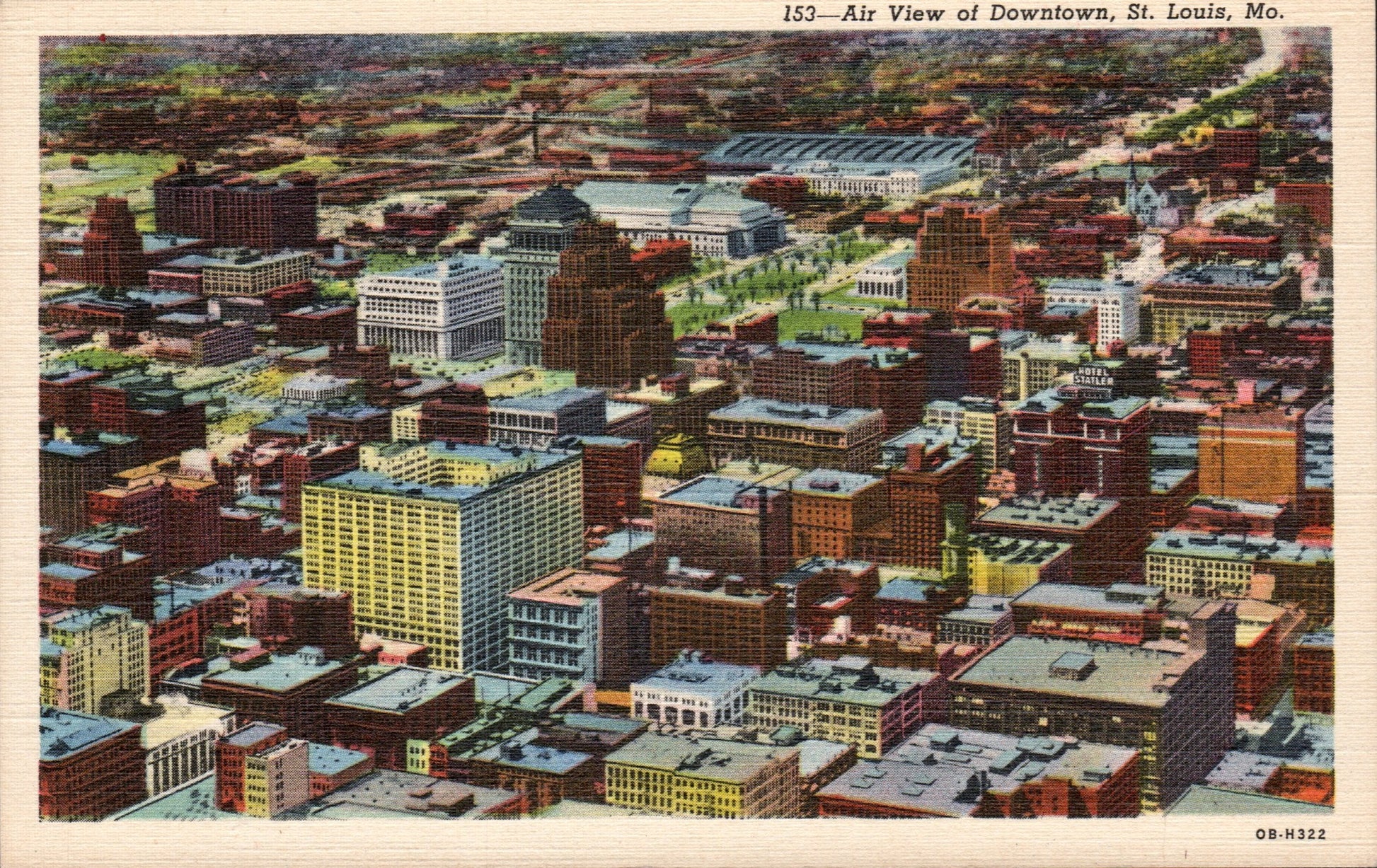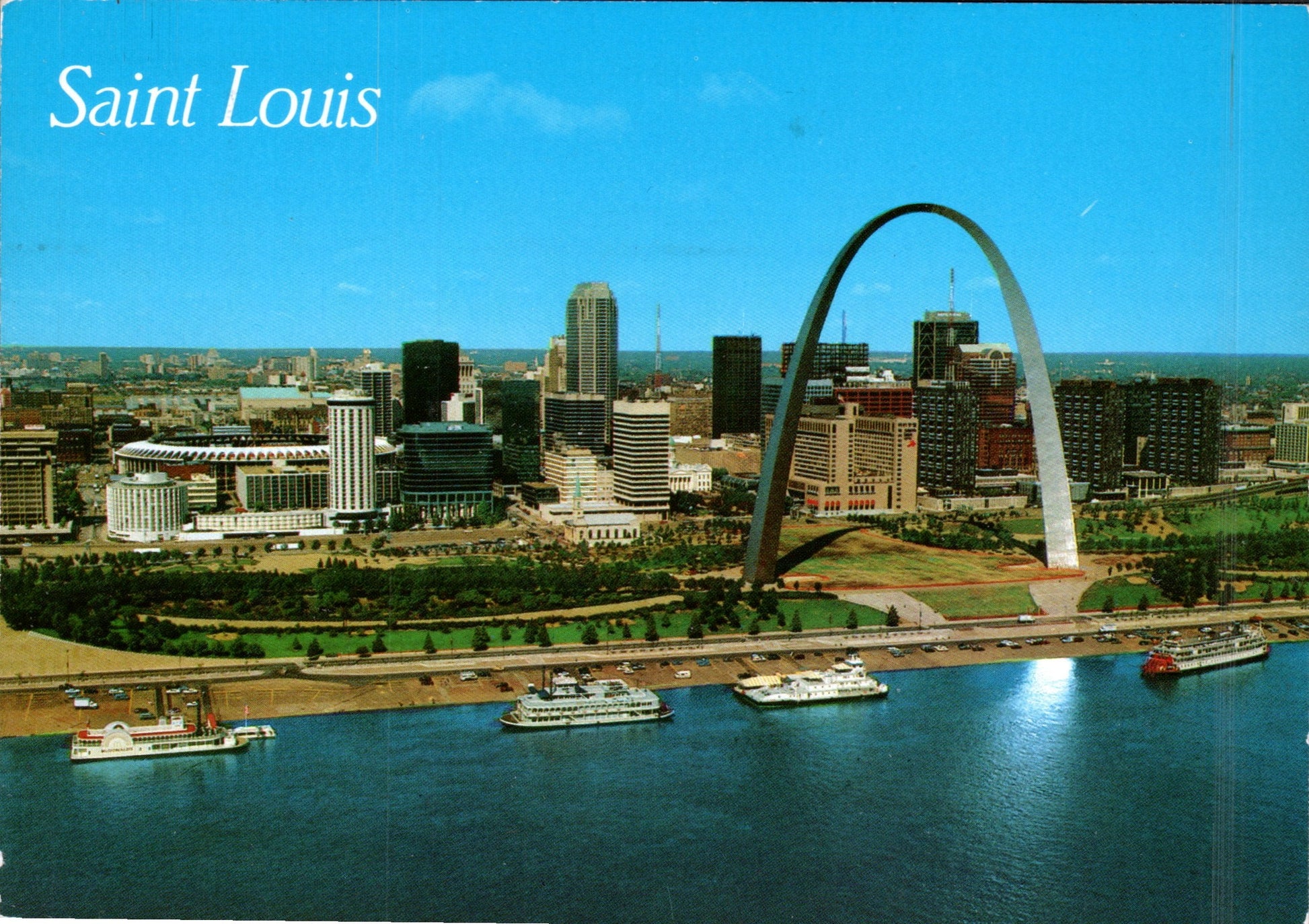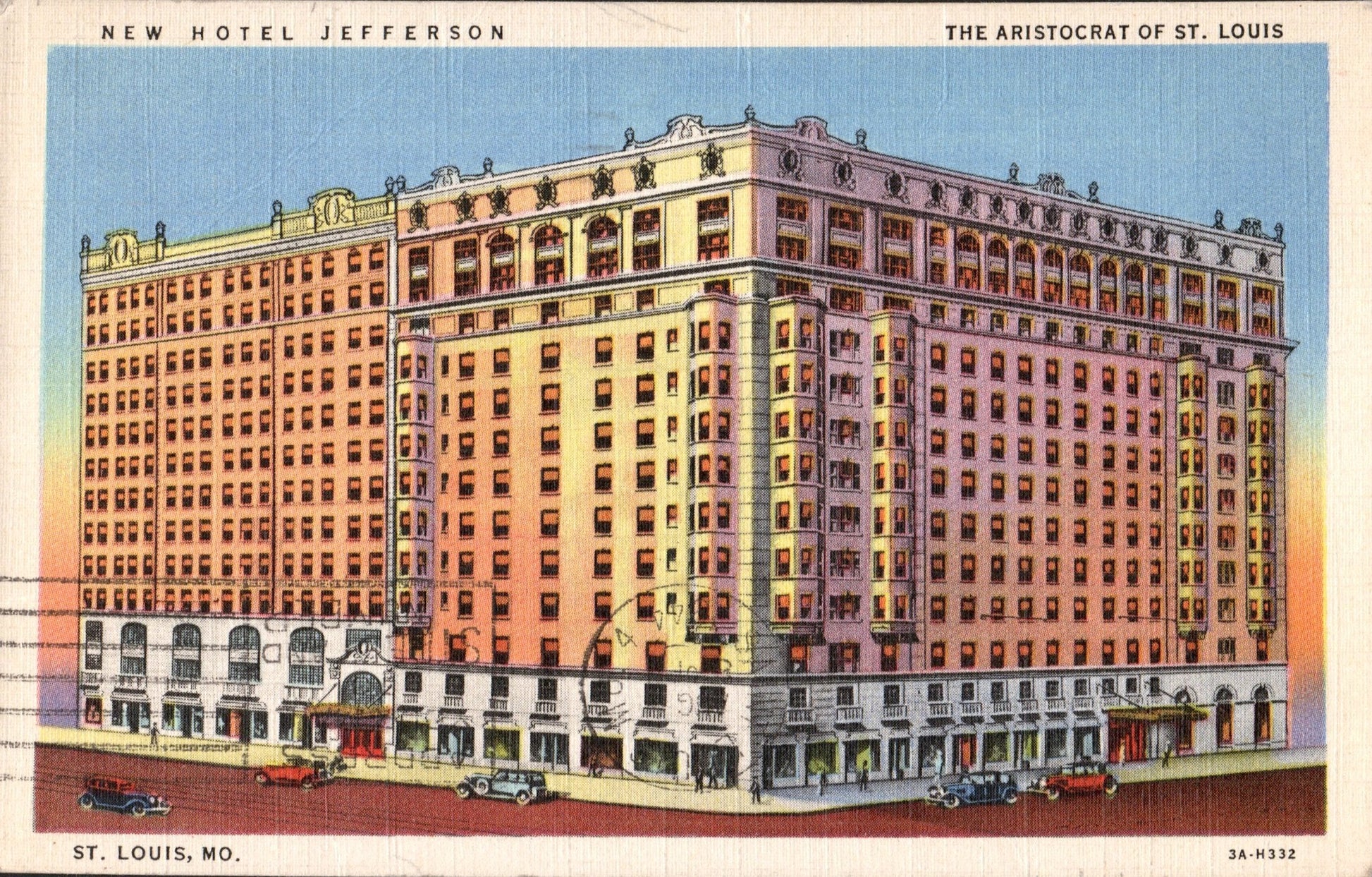 “Greetings from St. Louis” in large letters [linen]; Aerial view [ 2 views, one linen & one Continental]; “Looking N.E. from Old Water Tower”[c.1910]; Waterfront [c.1910]; Mississippi River ice jam [1907] Washington Ave. with many cars [1919]; Telephone Bldg. and Court House; Railway Exchange Building [linen]; Hotels: Chase-Park Plaza Hotel [2 chrome views]; Coronado Hotel [chrome]; Forest Park Hotel [1940s]; Hamilton Hotel Rooftop Garden [c.1910]; Hotel Jefferson [1909, horse-drawn]; New Hotel Jefferson [linen]; Mark Twain Hotel [linen]; Marquette Hotel [1919]; Hotel Melbourne [linen]; Hotel Statler [B&W on yellow]; Hotel/Motel Bel Air [2 chrome cards, one interior of dining room; Warwick Hotel [chrome]; King Bros. motel [chrome]; Hospitals: City Hospital [c.1910]; Barnes Hospital Group [linen]; Deaconess Hospital [2 views, one linen, one chrome]; Homer Phillips Hospital [real photo]; Shriners Hospital aerial view [chrome;] Union Station [7 views, c.1910 to modern]; Other: Anheuser-Busch plant, aerial view [chrome]; Airport terminal [chrome]; Post office [2 linen views]; Court House [3 views, one is 1918; City Hall [2 linen, one chrome]; Library [2 views, c.1910, linen]; YWCA, with two early automobiles; Moolah Temple [1930s] The Arena [2 views, two linen, one chrome]; Opera, interior view [linen]; Planetarium [Continental]; Kirkwood School [1916]; Marion Sims Medical College [1909, horse drawn, corner missing]; Lutheran Home for the Aged [chrome]; Washington Univ. [3 views, two 1930s, one linen]; St. Louis U. [linen]; 9 views of churches and religious buildings; The Arch [5 chrome views]; Jefferson Memorial [5 views]; bridges [4 views]; Passenger boats [2 views]; 54 parks and monuments.
