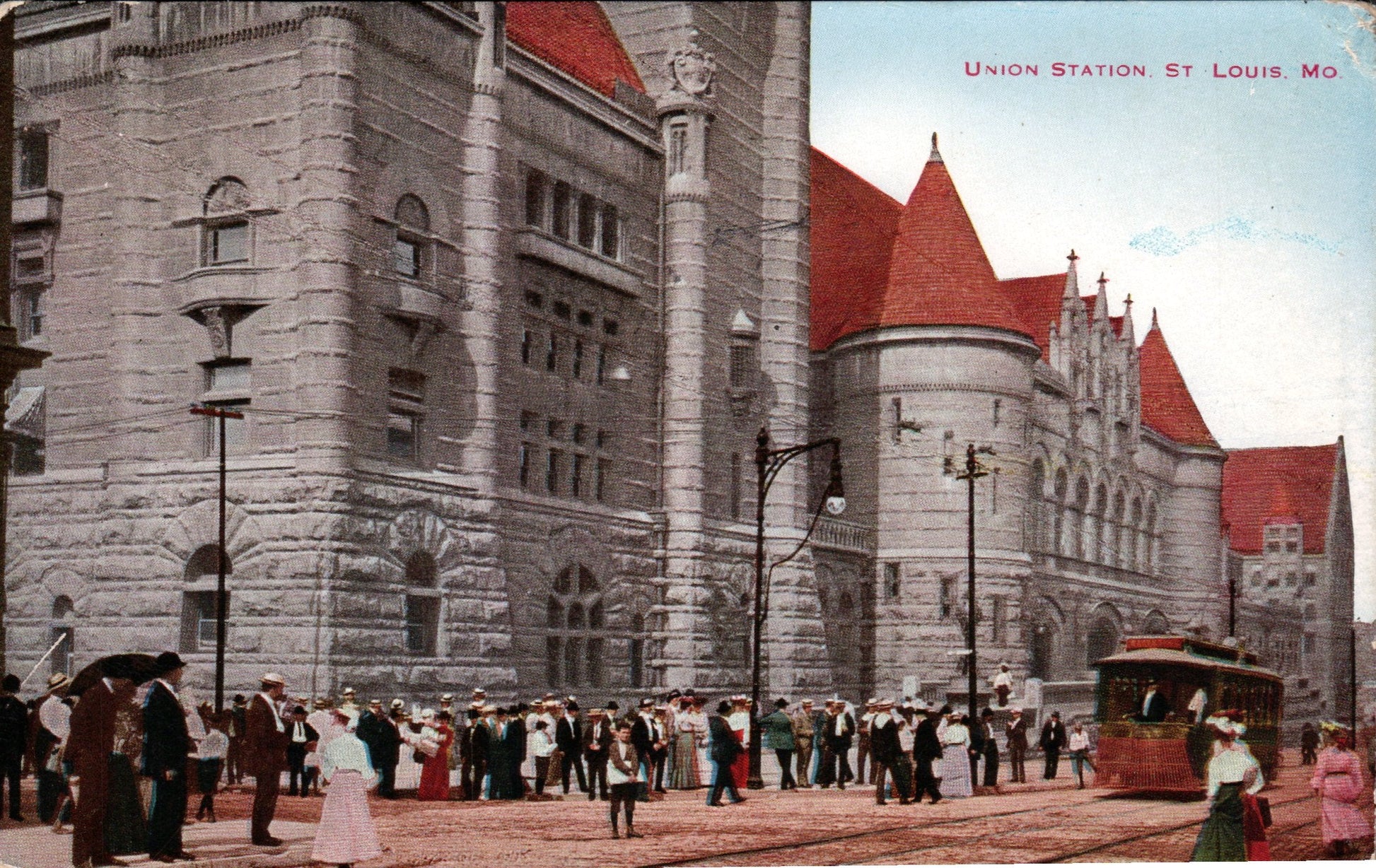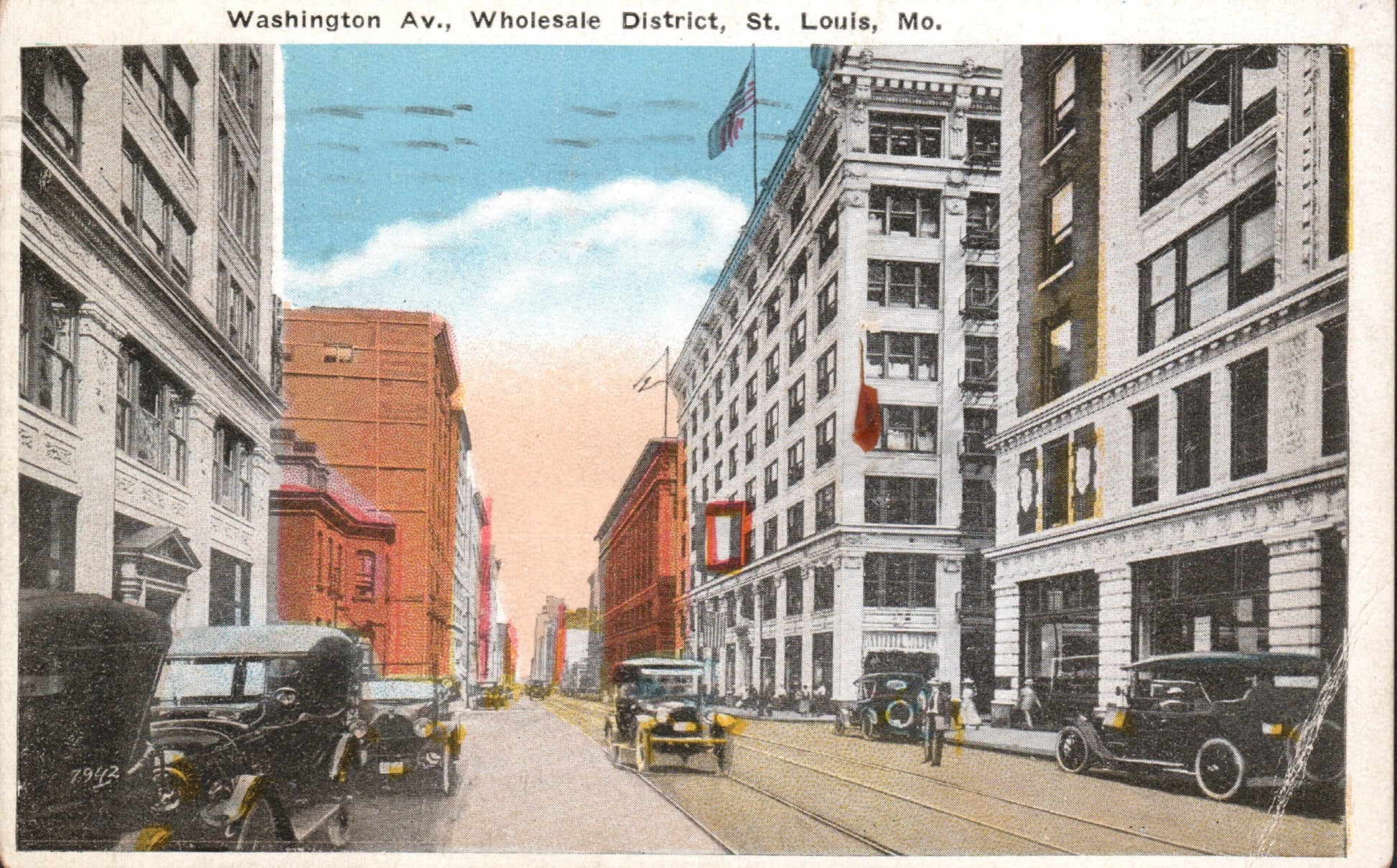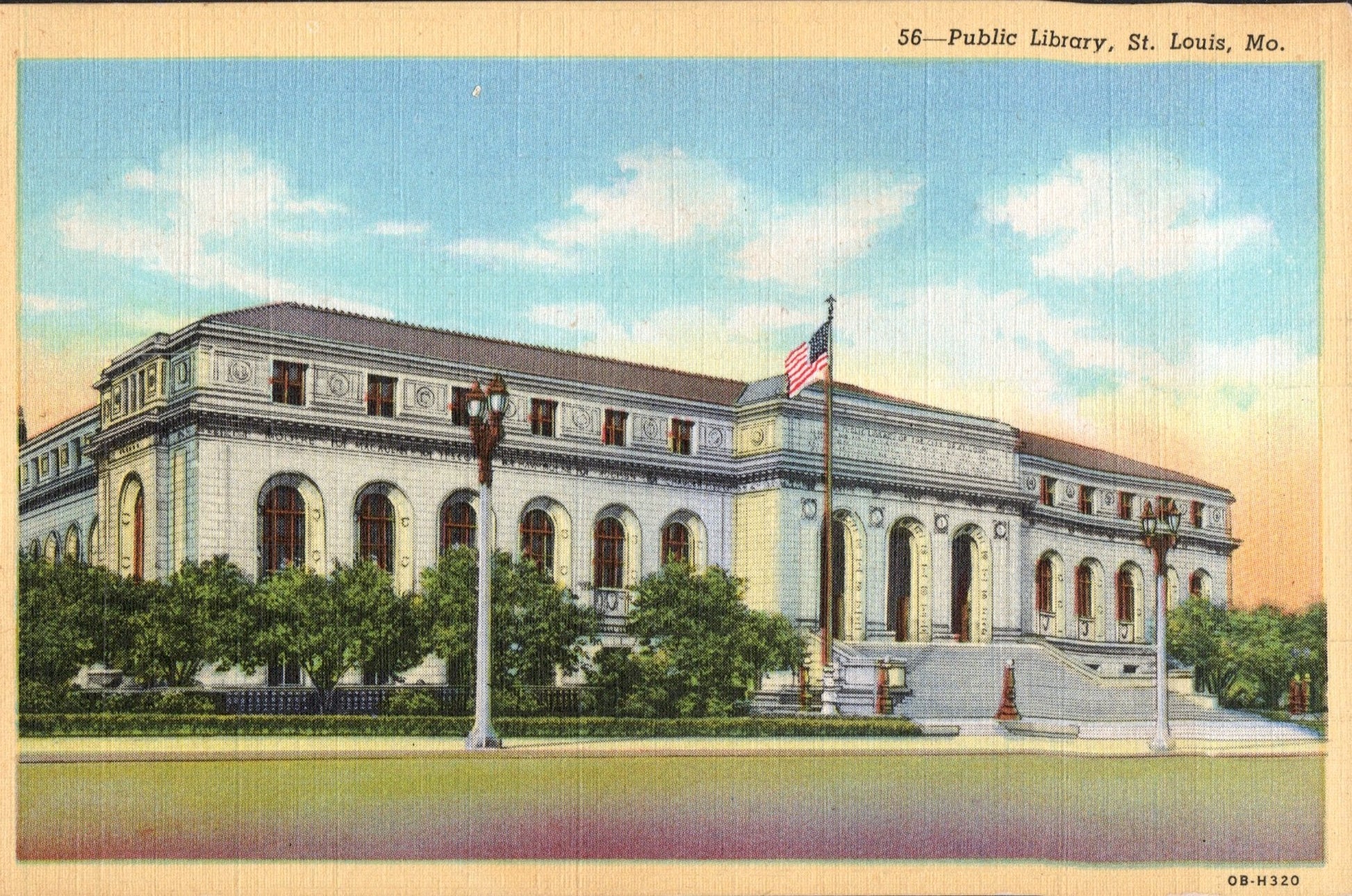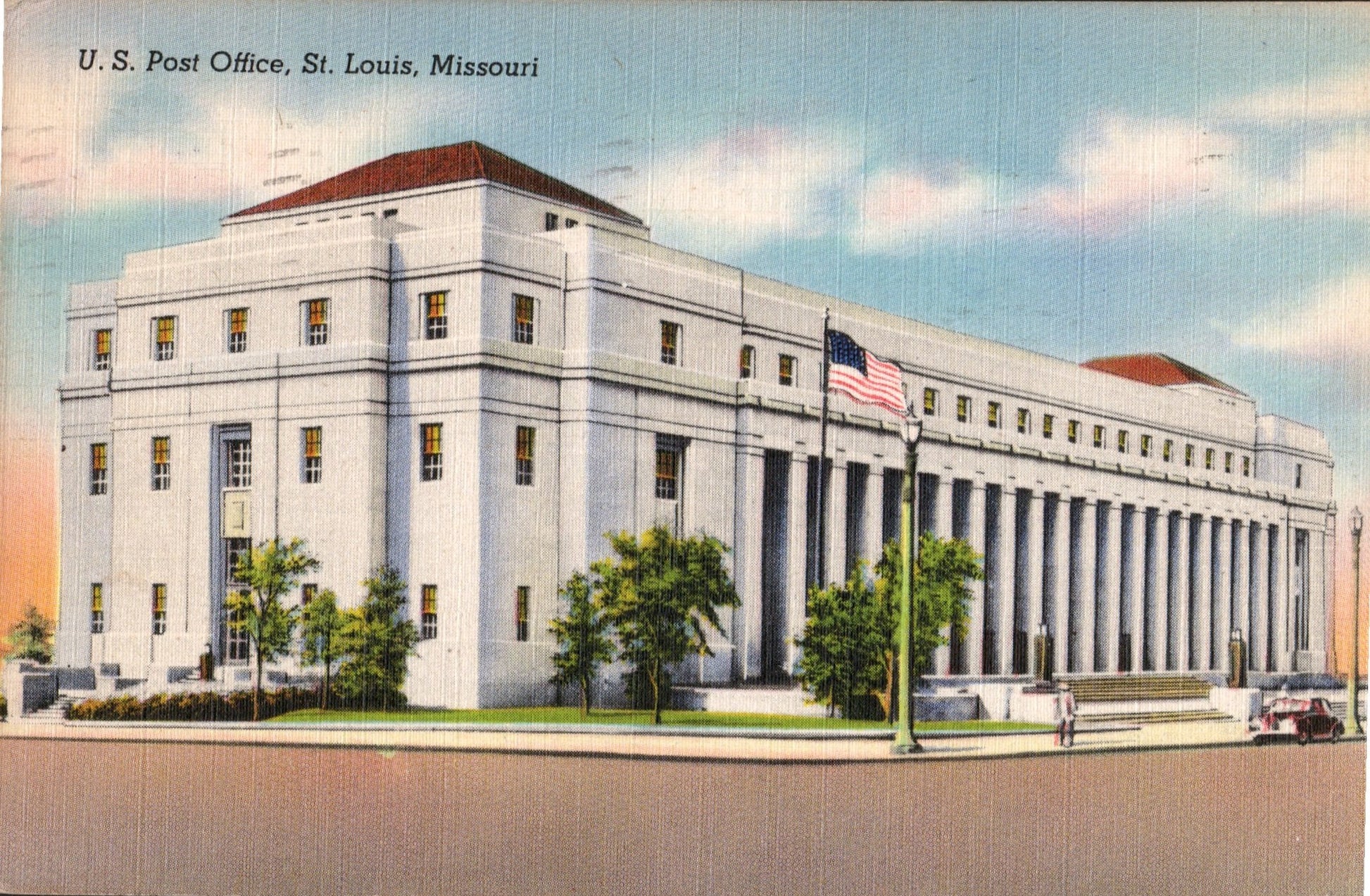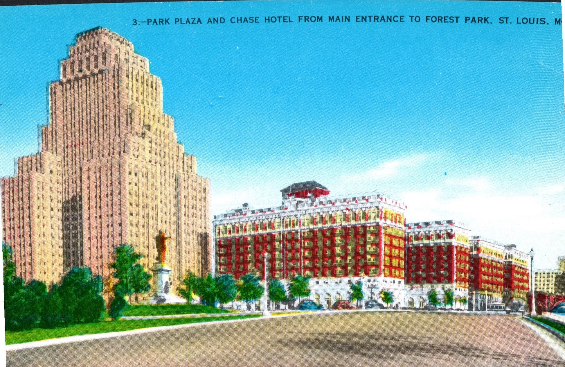 “Greetings from St. Louis” in large letters [linen]; Aerial view [ 2 views, one linen & one Continental]; “Looking N.E. from Old Water Tower”[c.1910]; Waterfront [c.1910]; Mississippi River ice jam [1907] Washington Ave. with many cars [1919]; Telephone Bldg. and Court House; Railway Exchange Building [linen]; Hotels: Chase-Park Plaza Hotel [2 chrome views]; Coronado Hotel [chrome]; Forest Park Hotel [1940s]; Hamilton Hotel Rooftop Garden [c.1910]; Hotel Jefferson [1909, horse-drawn]; New Hotel Jefferson [linen]; Mark Twain Hotel [linen]; Marquette Hotel [1919]; Hotel Melbourne [linen]; Hotel Statler [B&W on yellow]; Hotel/Motel Bel Air [2 chrome cards, one interior of dining room; Warwick Hotel [chrome]; King Bros. motel [chrome]; Hospitals: City Hospital [c.1910]; Barnes Hospital Group [linen]; Deaconess Hospital [2 views, one linen, one chrome]; Homer Phillips Hospital [real photo]; Shriners Hospital aerial view [chrome;] Union Station [7 views, c.1910 to modern]; Other: Anheuser-Busch plant, aerial view [chrome]; Airport terminal [chrome]; Post office [2 linen views]; Court House [3 views, one is 1918; City Hall [2 linen, one chrome]; Library [2 views, c.1910, linen]; YWCA, with two early automobiles; Moolah Temple [1930s] The Arena [2 views, two linen, one chrome]; Opera, interior view [linen]; Planetarium [Continental]; Kirkwood School [1916]; Marion Sims Medical College [1909, horse drawn, corner missing]; Lutheran Home for the Aged [chrome]; Washington Univ. [3 views, two 1930s, one linen]; St. Louis U. [linen]; 9 views of churches and religious buildings; The Arch [5 chrome views]; Jefferson Memorial [5 views]; bridges [4 views]; Passenger boats [2 views]; 54 parks and monuments.