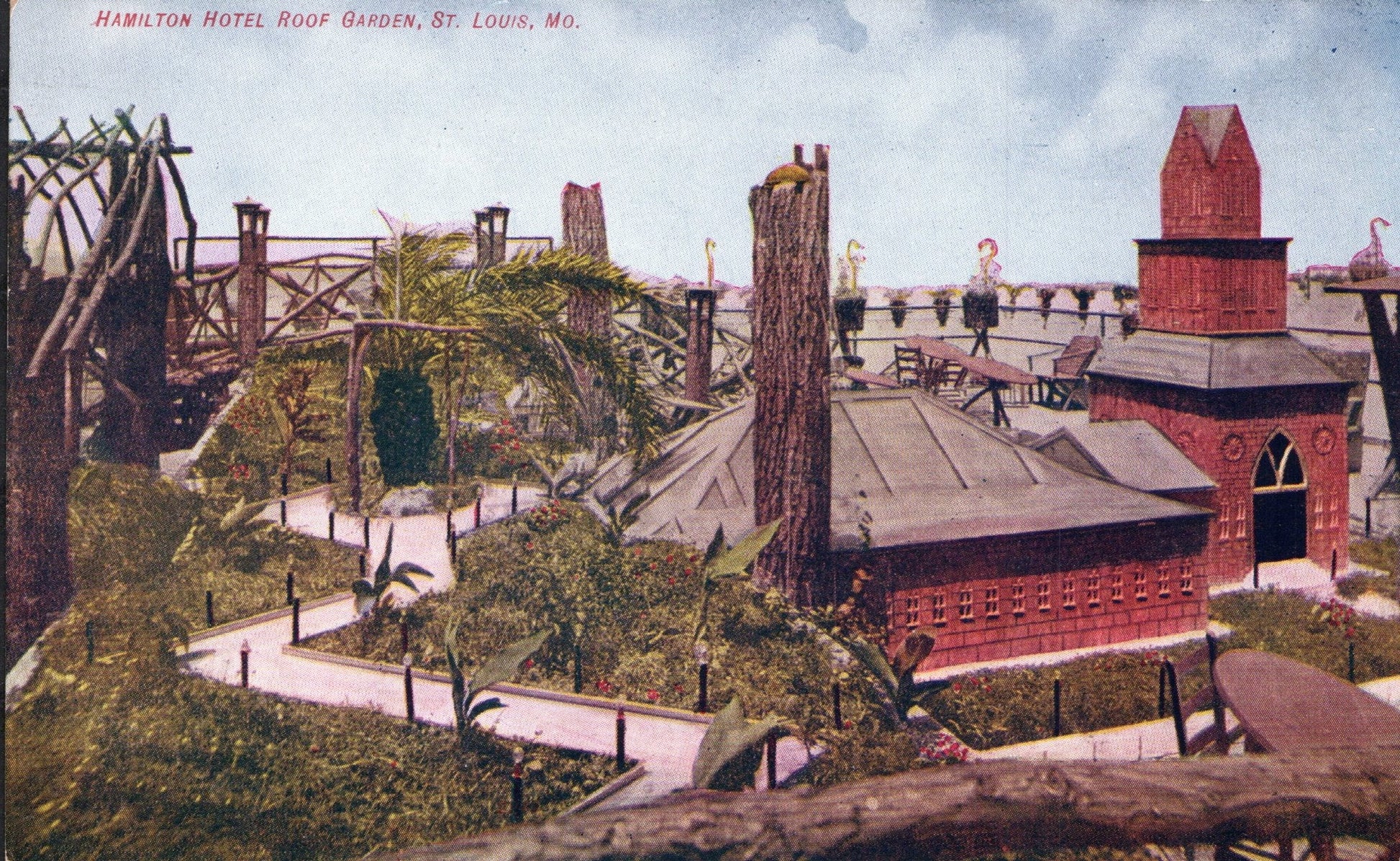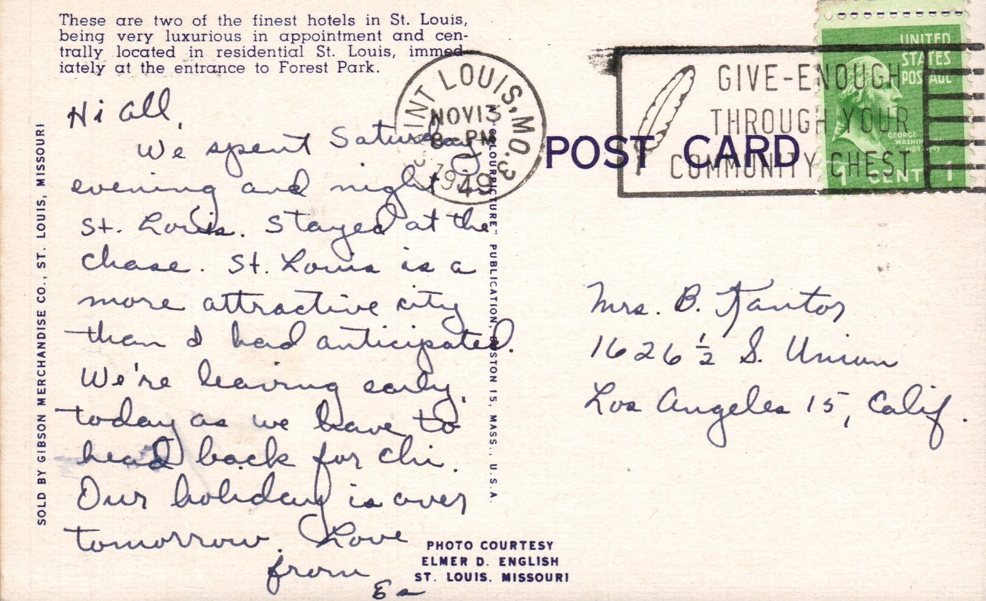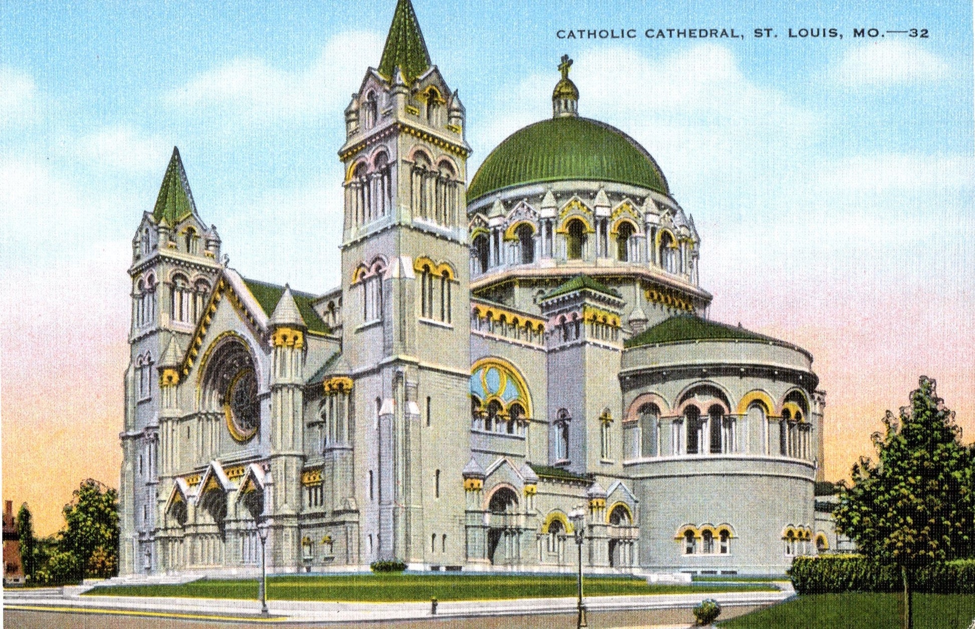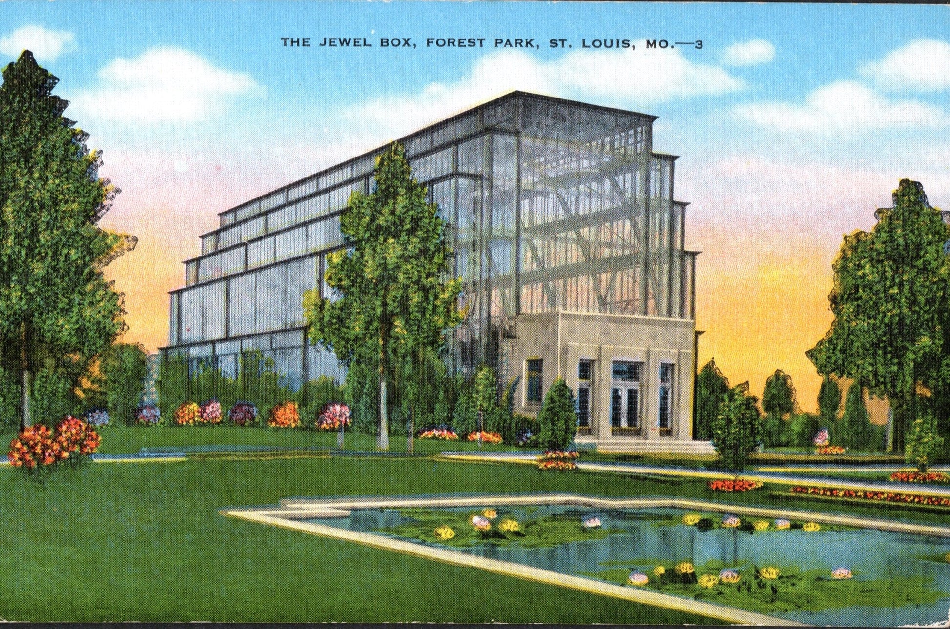 “Greetings from St. Louis” in large letters [linen]; Aerial view [ 2 views, one linen & one Continental]; “Looking N.E. from Old Water Tower”[c.1910]; Waterfront [c.1910]; Mississippi River ice jam [1907] Washington Ave. with many cars [1919]; Telephone Bldg. and Court House; Railway Exchange Building [linen]; Hotels: Chase-Park Plaza Hotel [2 chrome views]; Coronado Hotel [chrome]; Forest Park Hotel [1940s]; Hamilton Hotel Rooftop Garden [c.1910]; Hotel Jefferson [1909, horse-drawn]; New Hotel Jefferson [linen]; Mark Twain Hotel [linen]; Marquette Hotel [1919]; Hotel Melbourne [linen]; Hotel Statler [B&W on yellow]; Hotel/Motel Bel Air [2 chrome cards, one interior of dining room; Warwick Hotel [chrome]; King Bros. motel [chrome]; Hospitals: City Hospital [c.1910]; Barnes Hospital Group [linen]; Deaconess Hospital [2 views, one linen, one chrome]; Homer Phillips Hospital [real photo]; Shriners Hospital aerial view [chrome;] Union Station [7 views, c.1910 to modern]; Other: Anheuser-Busch plant, aerial view [chrome]; Airport terminal [chrome]; Post office [2 linen views]; Court House [3 views, one is 1918; City Hall [2 linen, one chrome]; Library [2 views, c.1910, linen]; YWCA, with two early automobiles; Moolah Temple [1930s] The Arena [2 views, two linen, one chrome]; Opera, interior view [linen]; Planetarium [Continental]; Kirkwood School [1916]; Marion Sims Medical College [1909, horse drawn, corner missing]; Lutheran Home for the Aged [chrome]; Washington Univ. [3 views, two 1930s, one linen]; St. Louis U. [linen]; 9 views of churches and religious buildings; The Arch [5 chrome views]; Jefferson Memorial [5 views]; bridges [4 views]; Passenger boats [2 views]; 54 parks and monuments.