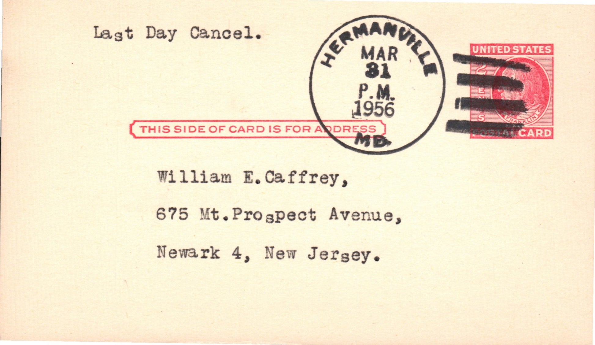 Hermanville (1893/1956) 1956 4-bar on LD Postal Card