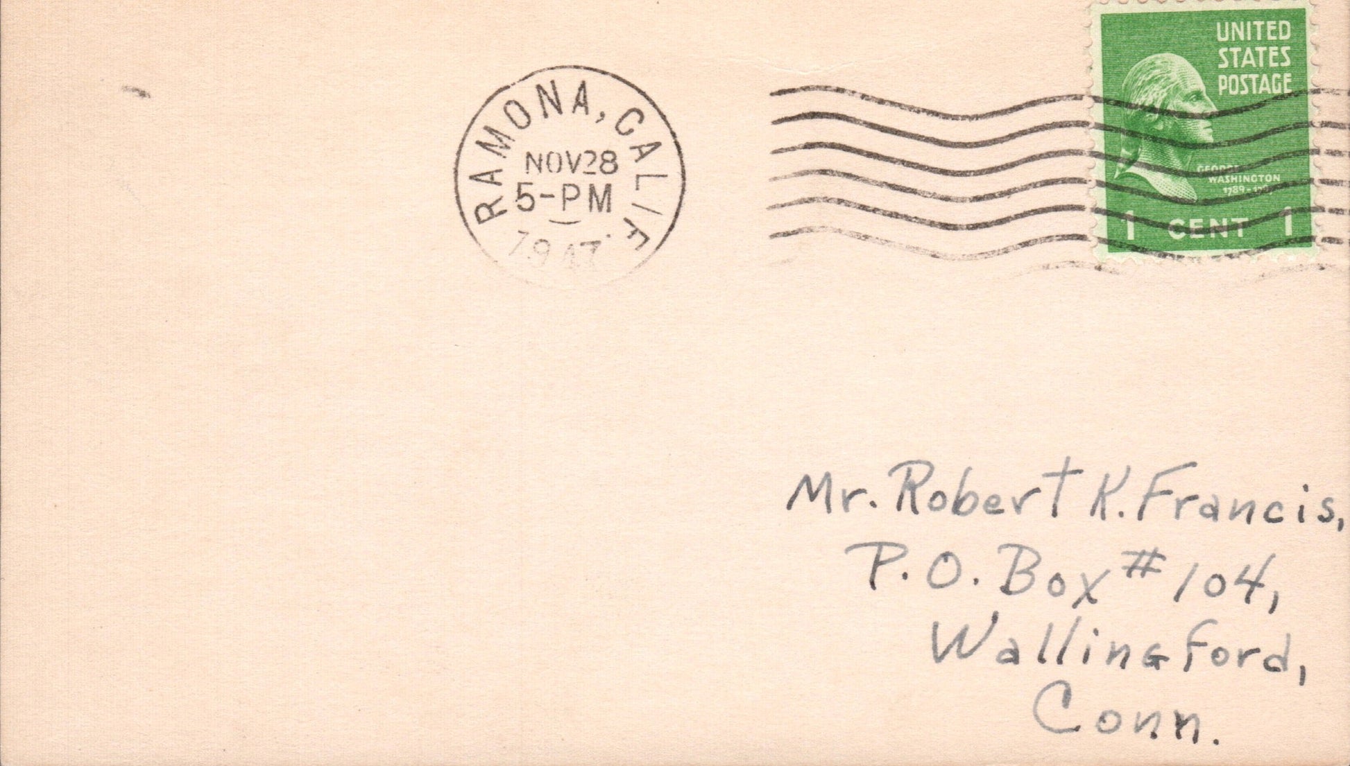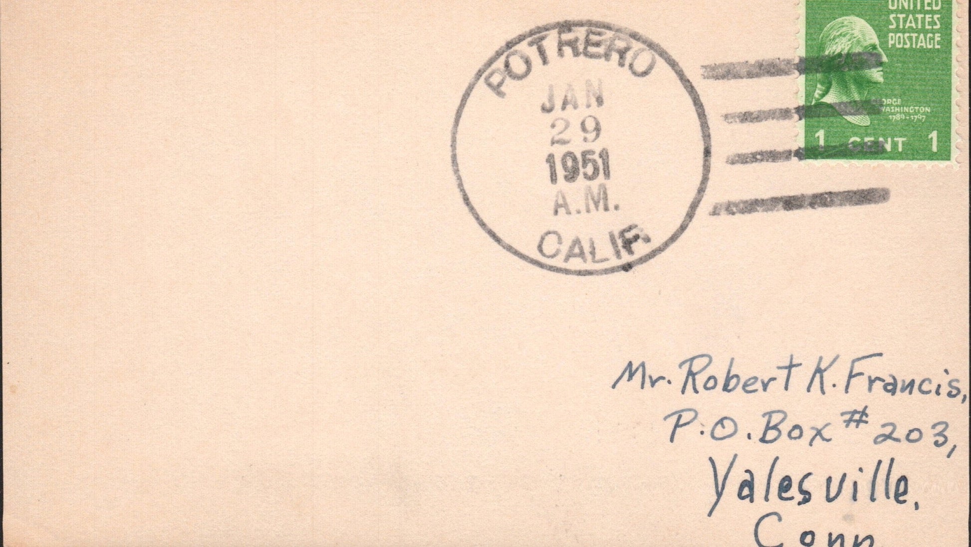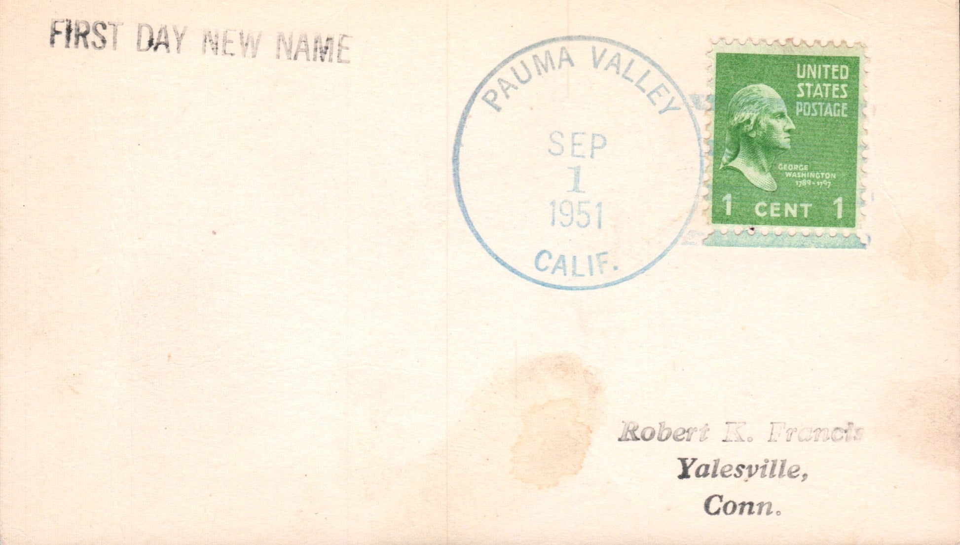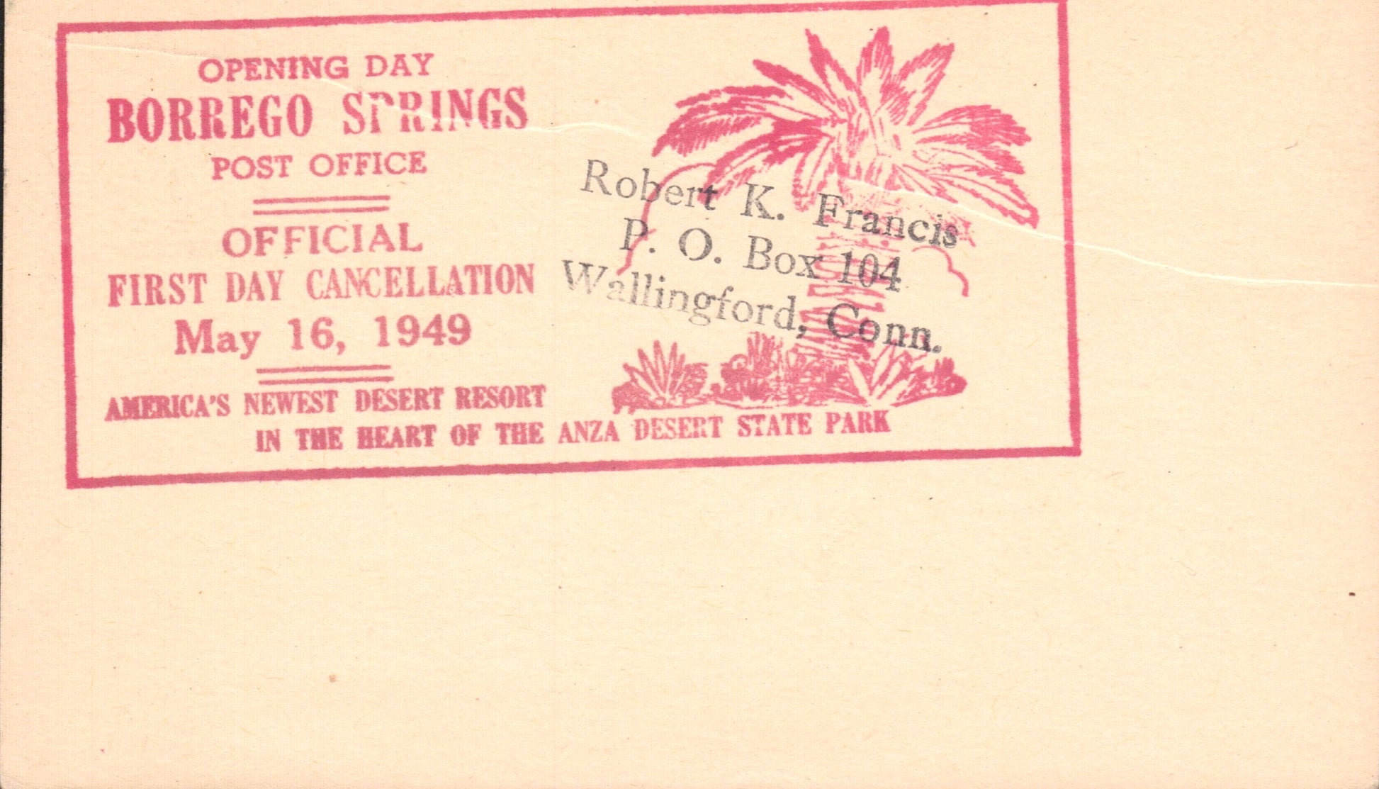 Pauma Valley 1951 4-bar on 3x5 card, FD of name