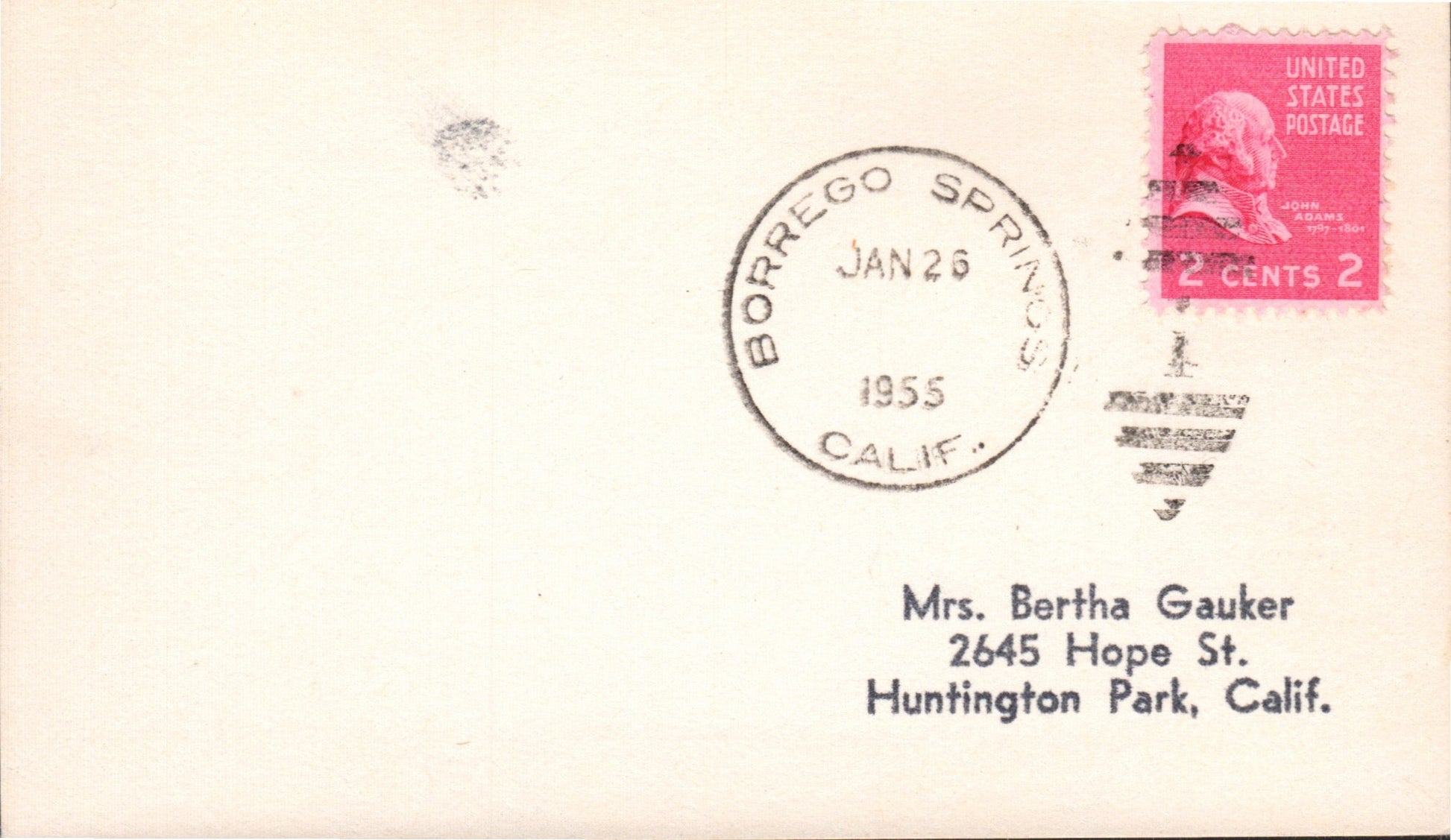 Borrego Springs 1949 4-bar on Postal Card, Cacher for First Day on back; 1955 duplex on 3x5 card