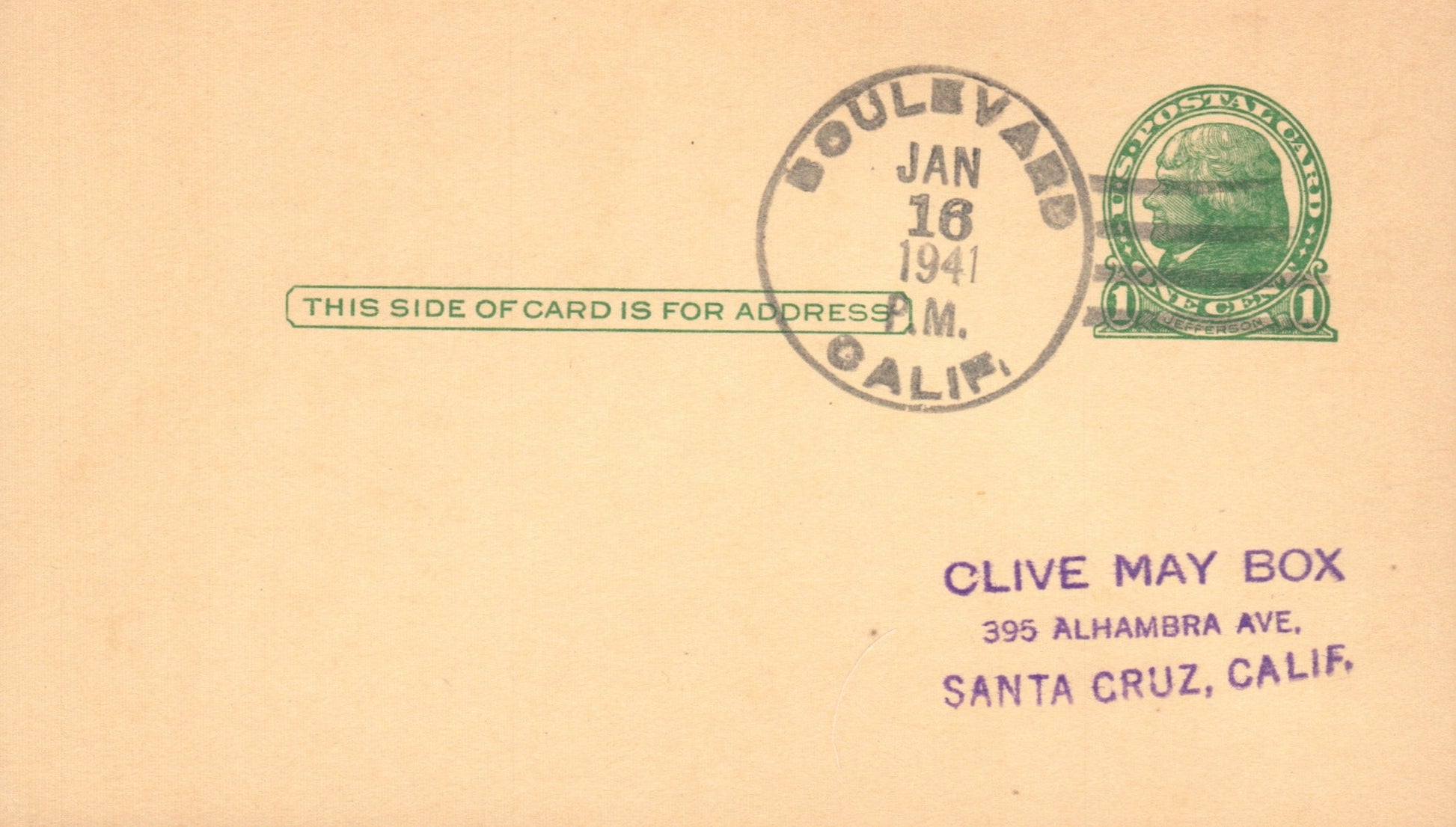 Boulevard 1941 4-bar on Postal Card