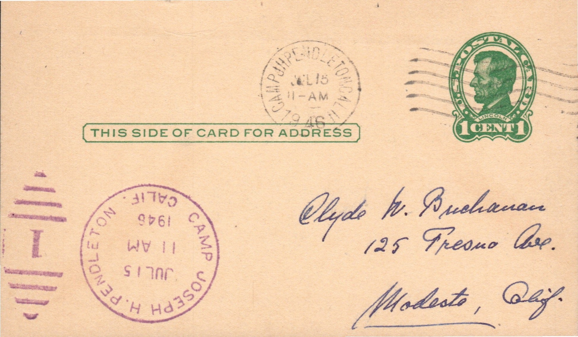 Camp Joseph H. Pendleton Bx (Oceanside) (1942-1946) 1946 duplex on Postal Card
