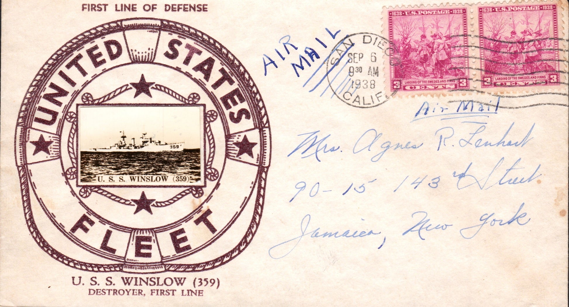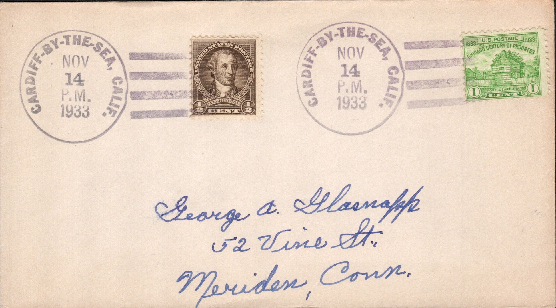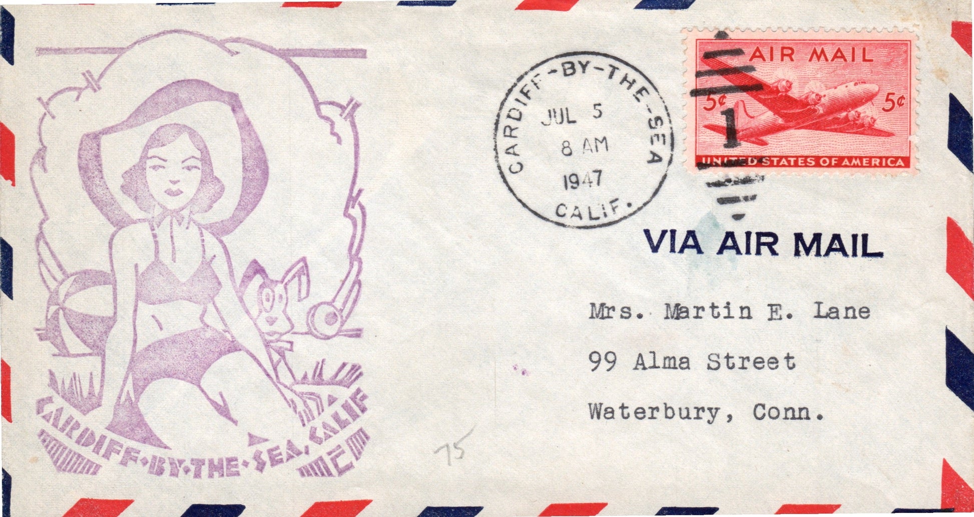 Cardiff-by-the-Sea 1933 4-bar on cover; 1947 duplex on cacheted airmail cover