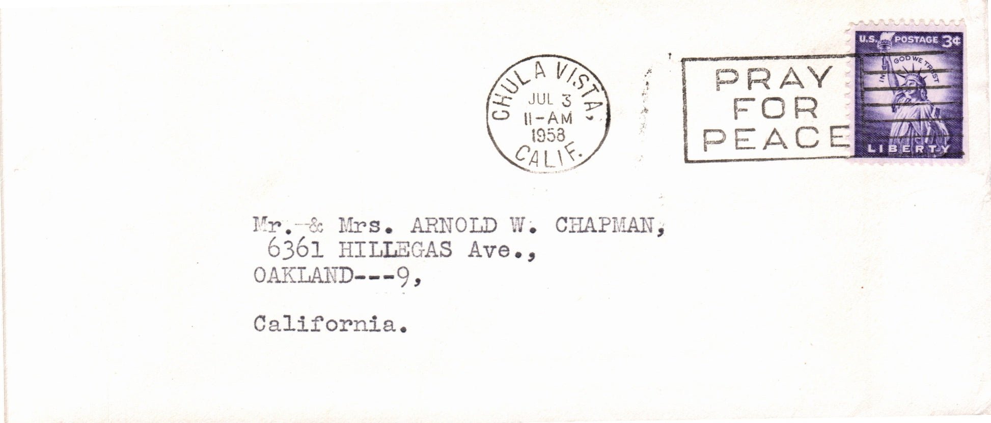 Chula Vista 1958 “Pray for Peace” slogan on cover; 1964 machine cancel on 3x5 card