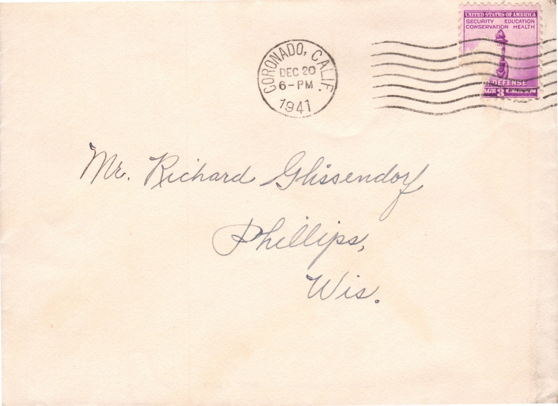 Coronado 1941 machine cancel on cover, Christmas card inside