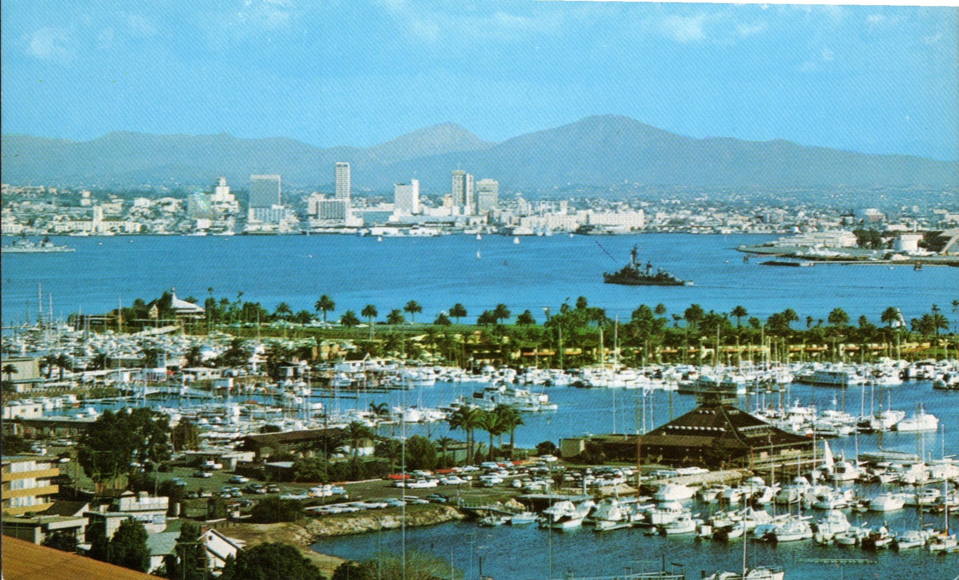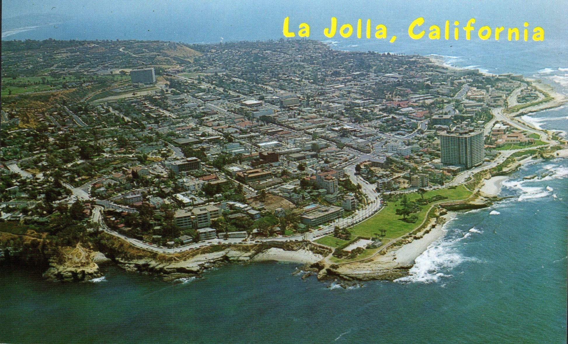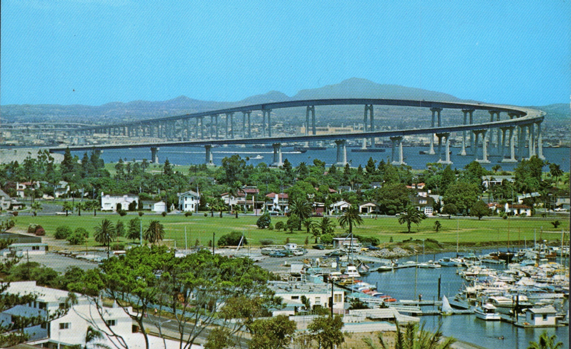 San Diego Post cards: Aerial view [chrome]; distant view [chrome]; Main Street in 1921 [B&W reproduction]; Cortez Hotel [chrome]; Motel 6 [chrome]; Aztec Motel [chrome]; Tourlodge Motel [chrome]; Harbor boat Cabrillo [chrome]; Post office [linen, 1946]; Cabrillo Bridge [linen]; San Diego Zoo [chrome]; Mission Valley [1909]; Marineland [2 chrome]; sunset [chrome]; Ramona’s Marriage Place [4 cards, 3 linen, 1 chrome]; Poinsettia field [linen, damaged]; Mission Cliff Gardens [c.1910]