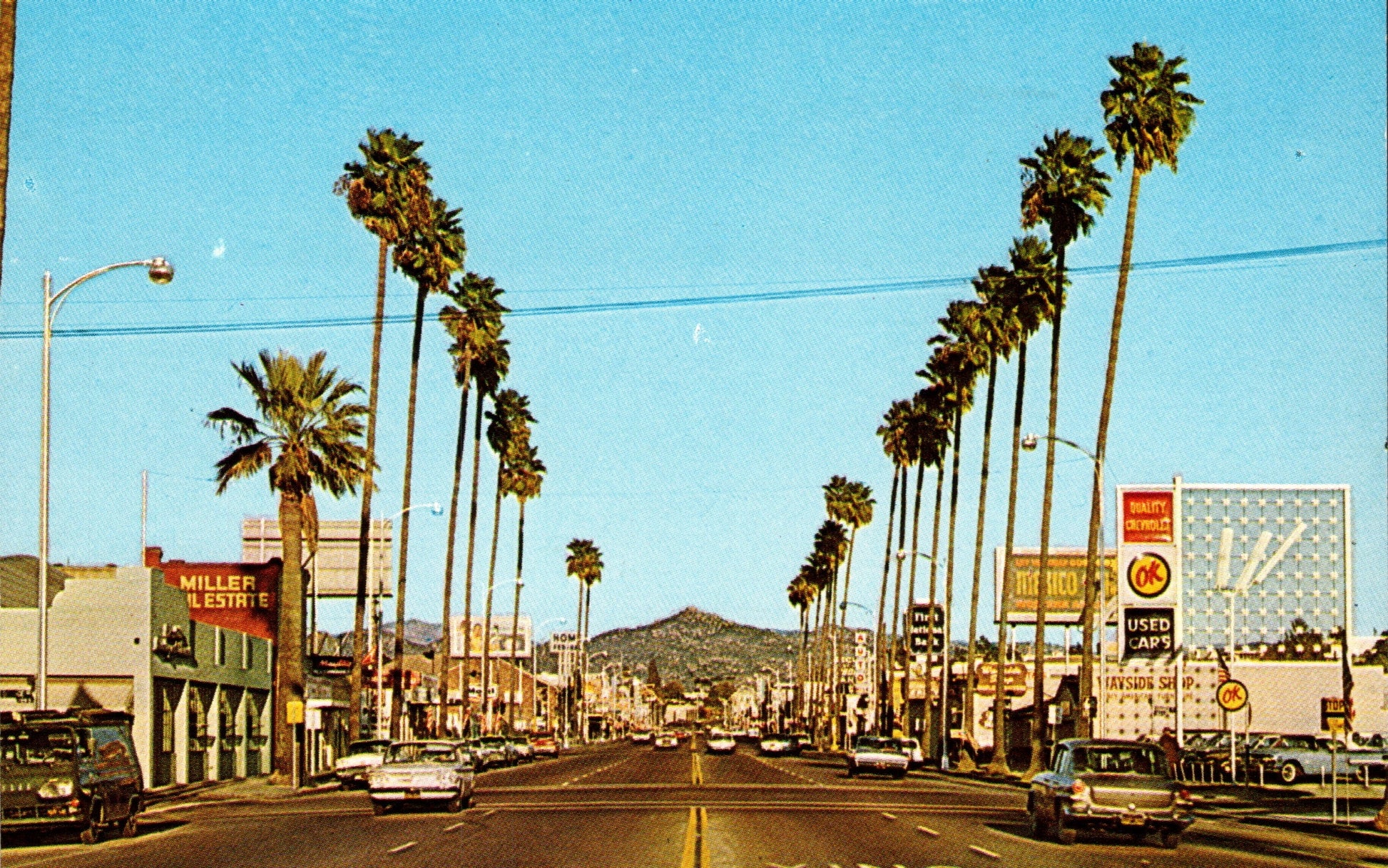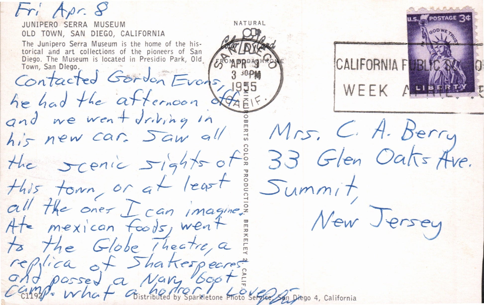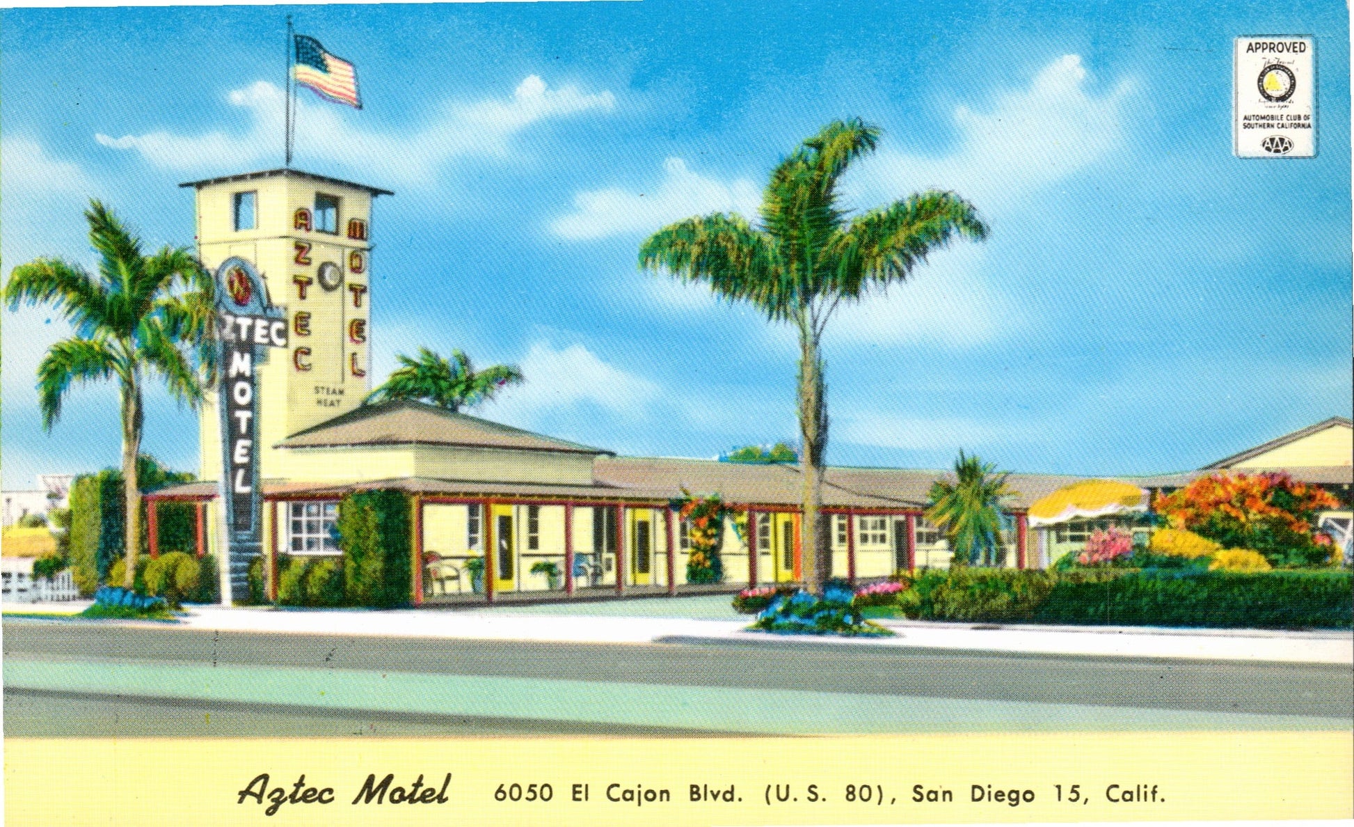 San Diego Post cards: Aerial view [chrome]; distant view [chrome]; Main Street in 1921 [B&W reproduction]; Cortez Hotel [chrome]; Motel 6 [chrome]; Aztec Motel [chrome]; Tourlodge Motel [chrome]; Harbor boat Cabrillo [chrome]; Post office [linen, 1946]; Cabrillo Bridge [linen]; San Diego Zoo [chrome]; Mission Valley [1909]; Marineland [2 chrome]; sunset [chrome]; Ramona’s Marriage Place [4 cards, 3 linen, 1 chrome]; Poinsettia field [linen, damaged]; Mission Cliff Gardens [c.1910]