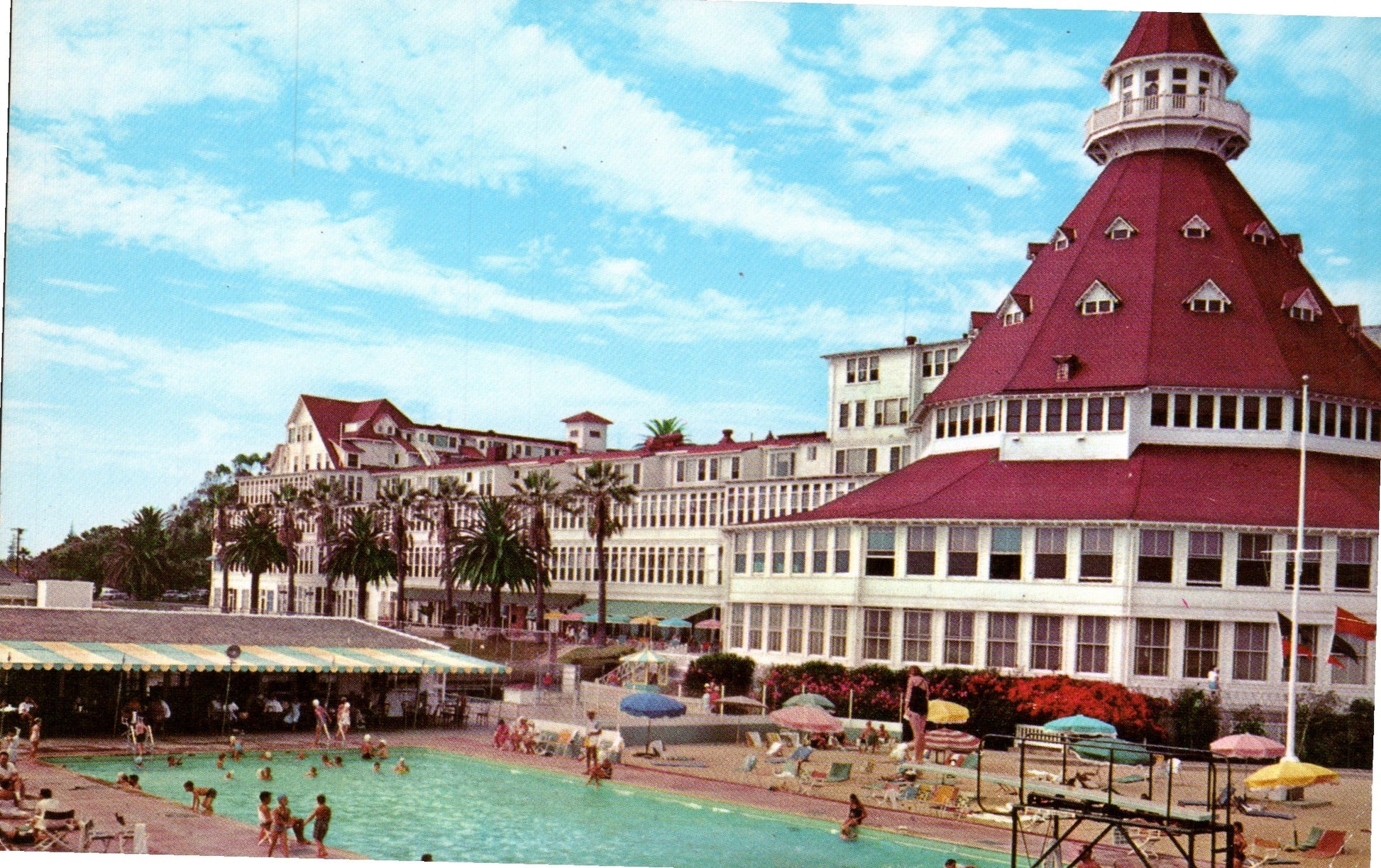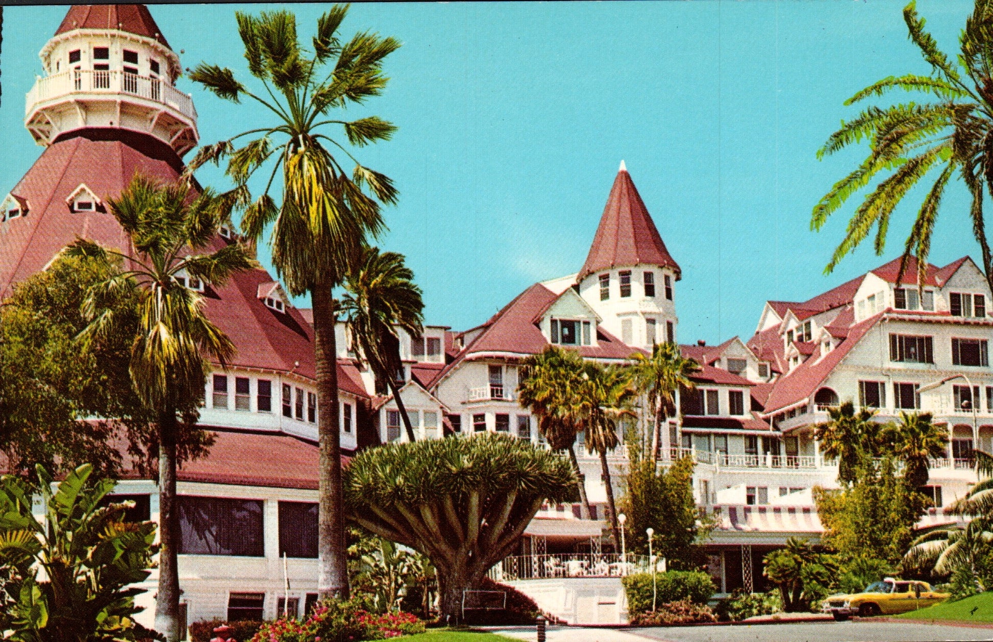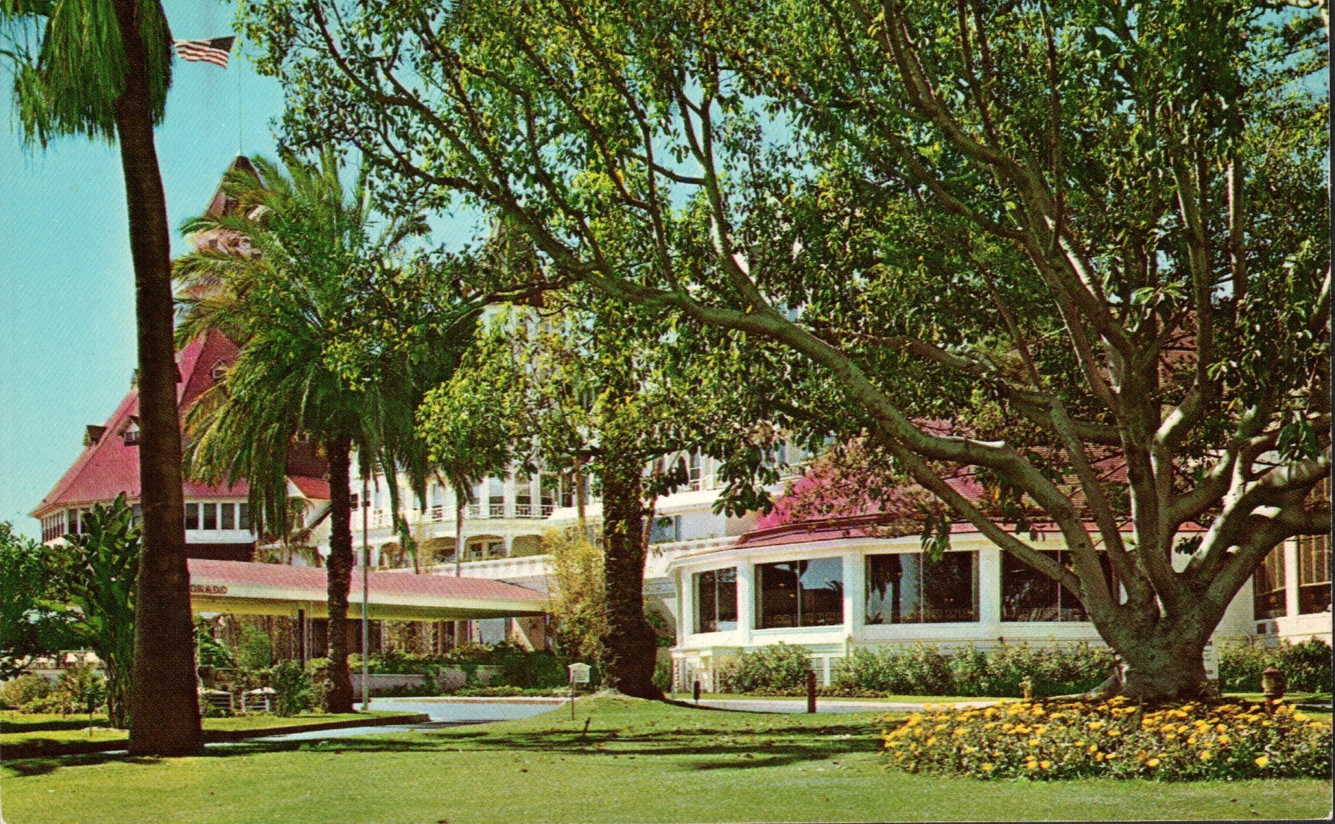 Post cards: Hotel del Coronado (3 exterior views, 1 dining room, all chrome); Bridge [chrome]; Sunset [c.1910?]