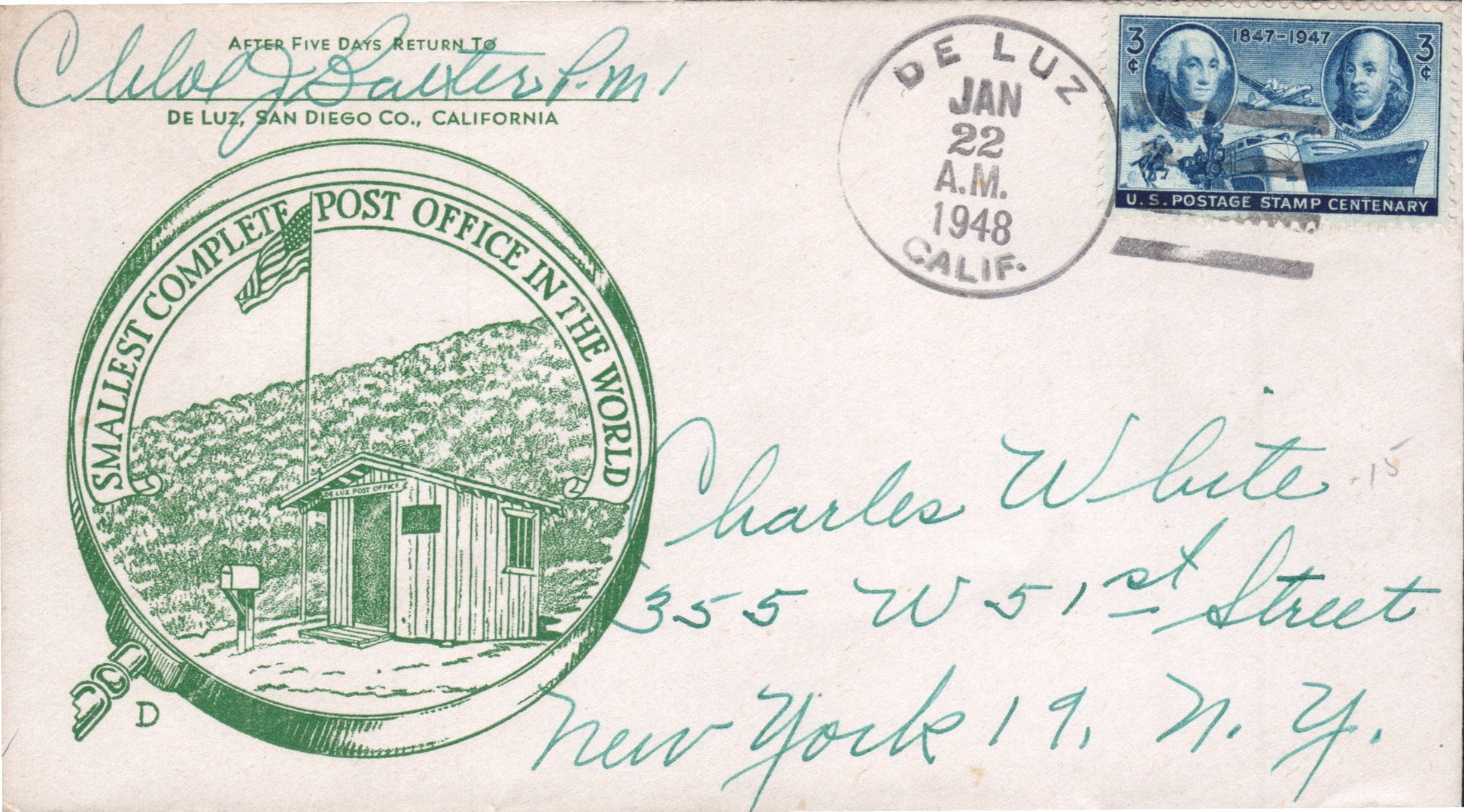 De Luz (1882-1955) 1930 4-bar on cover; 1948 4-bar on cacheted cover, “Smallest Complete Post Office in the World”
