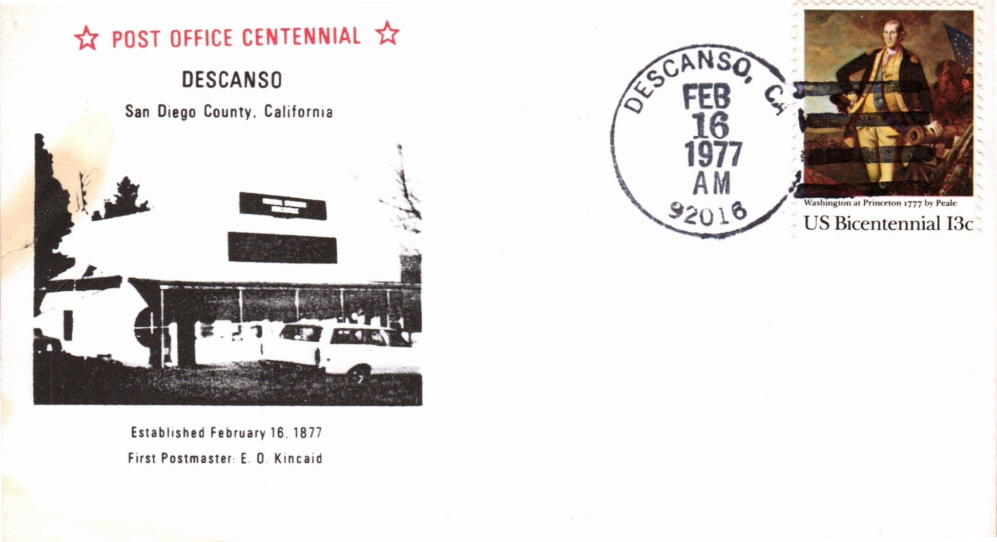 Descanso 1977 4-bar on cacheted cover [picture of p.o.], post office centennial