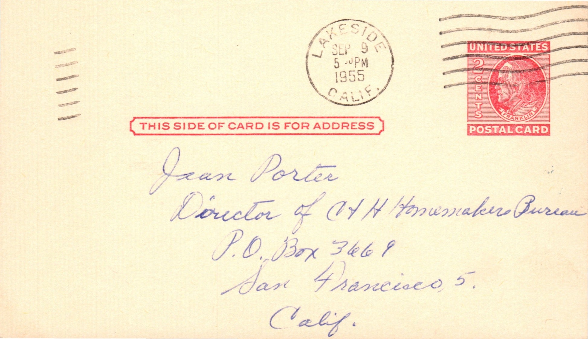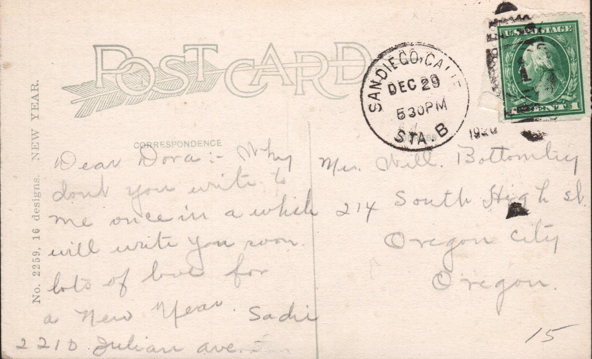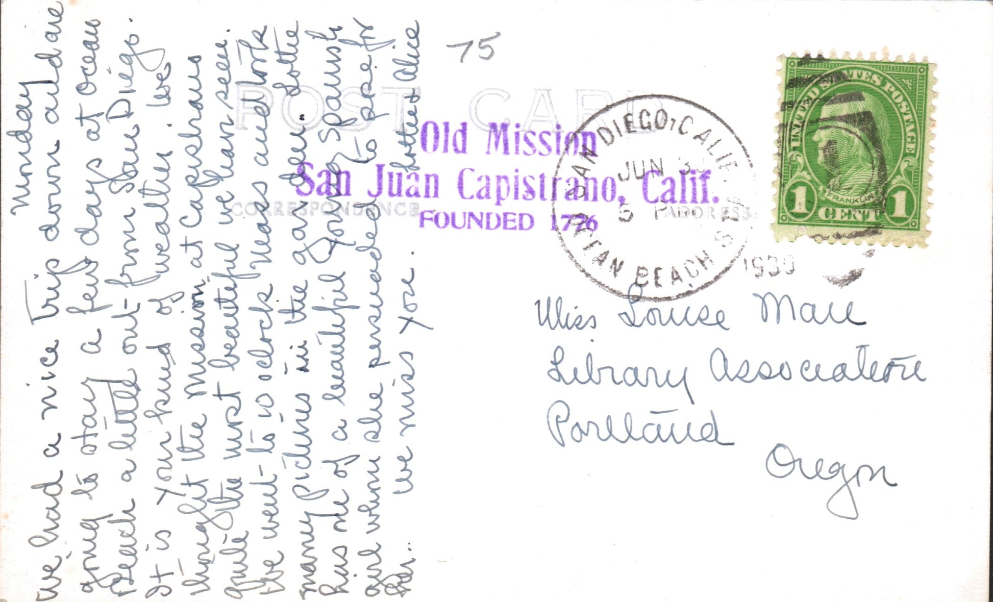 Ocean Beach Sta. (San Diego) 1930 date-out duplex on post card