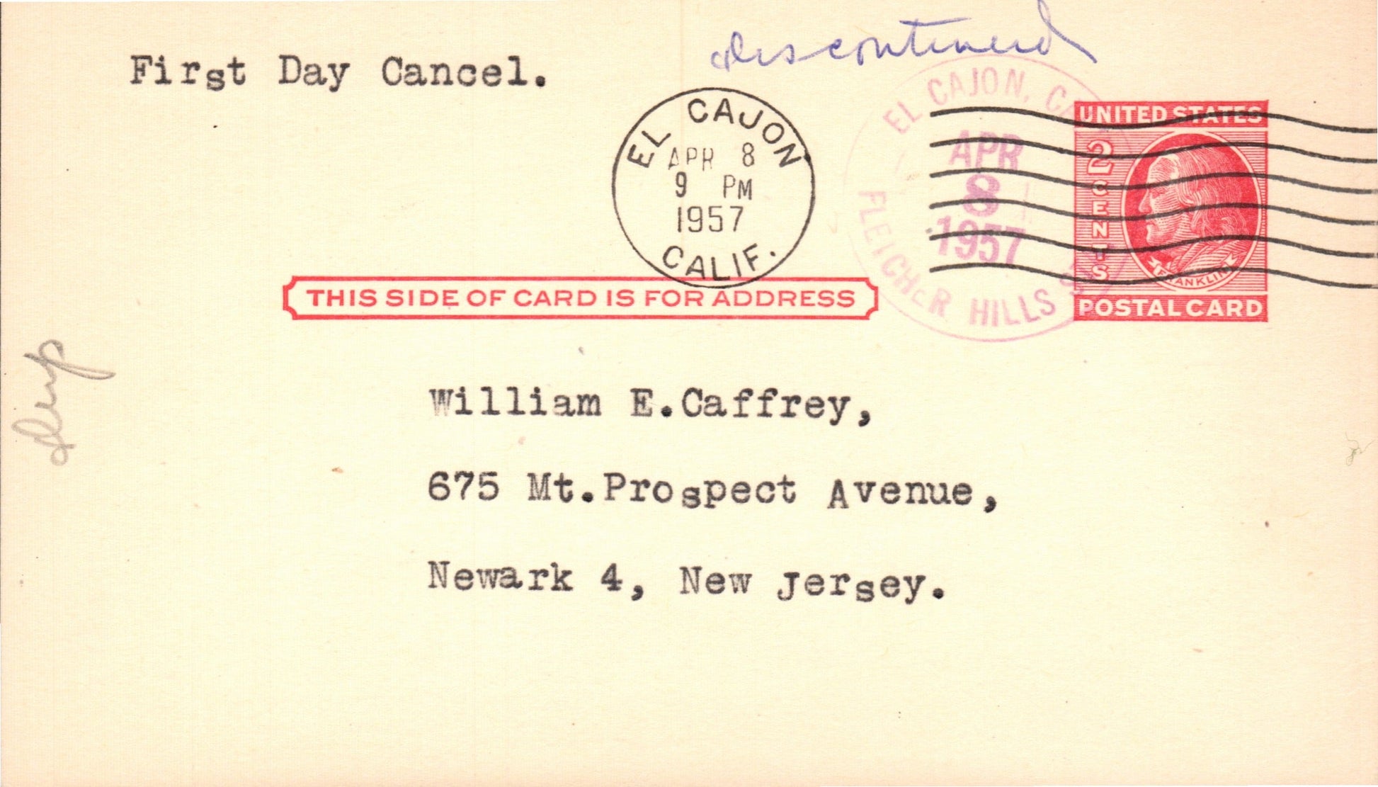 Fletcher Hills Sta. (El Cajon) (1957-1975) light 4-bar overstruck El Cajon on Postal Card, FD of Postal status