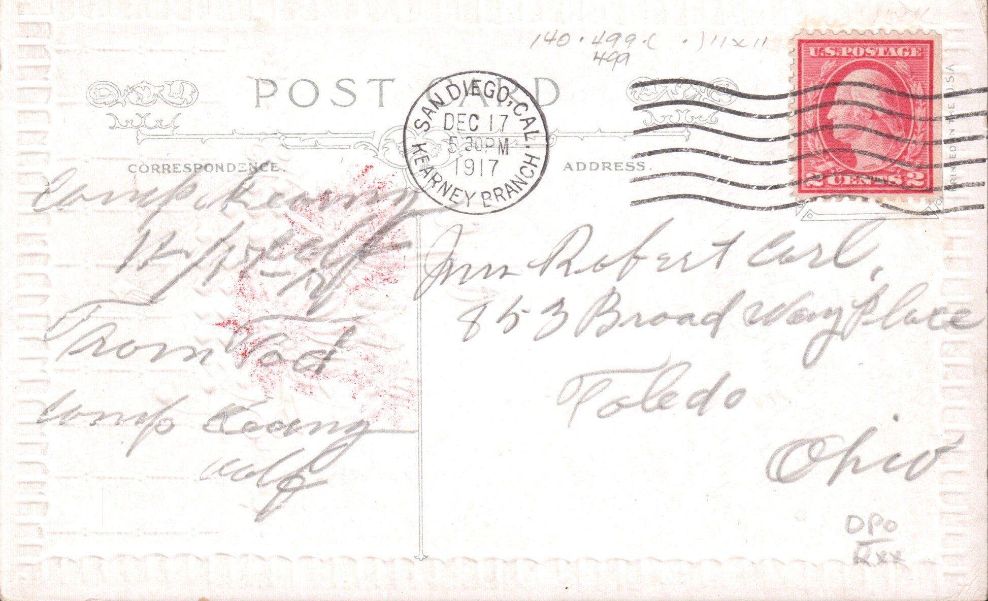 Kearney Br. (San Diego) (1917-1921) 1917 machine cancel on post card