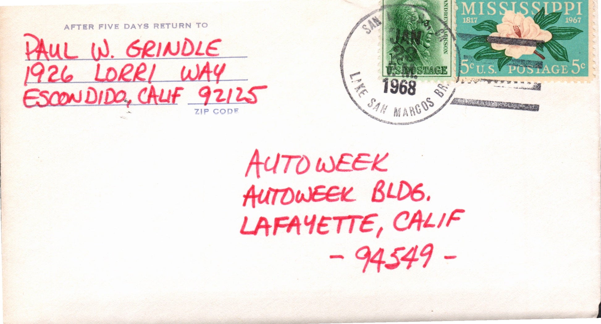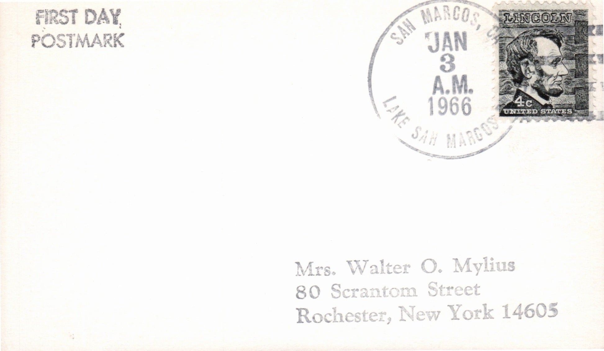 Lake San Marcos B (San Marcos) (1966-1990) 1966 4-bar on 3x5 card, FD of Postal status; 1968 4-bar on cover