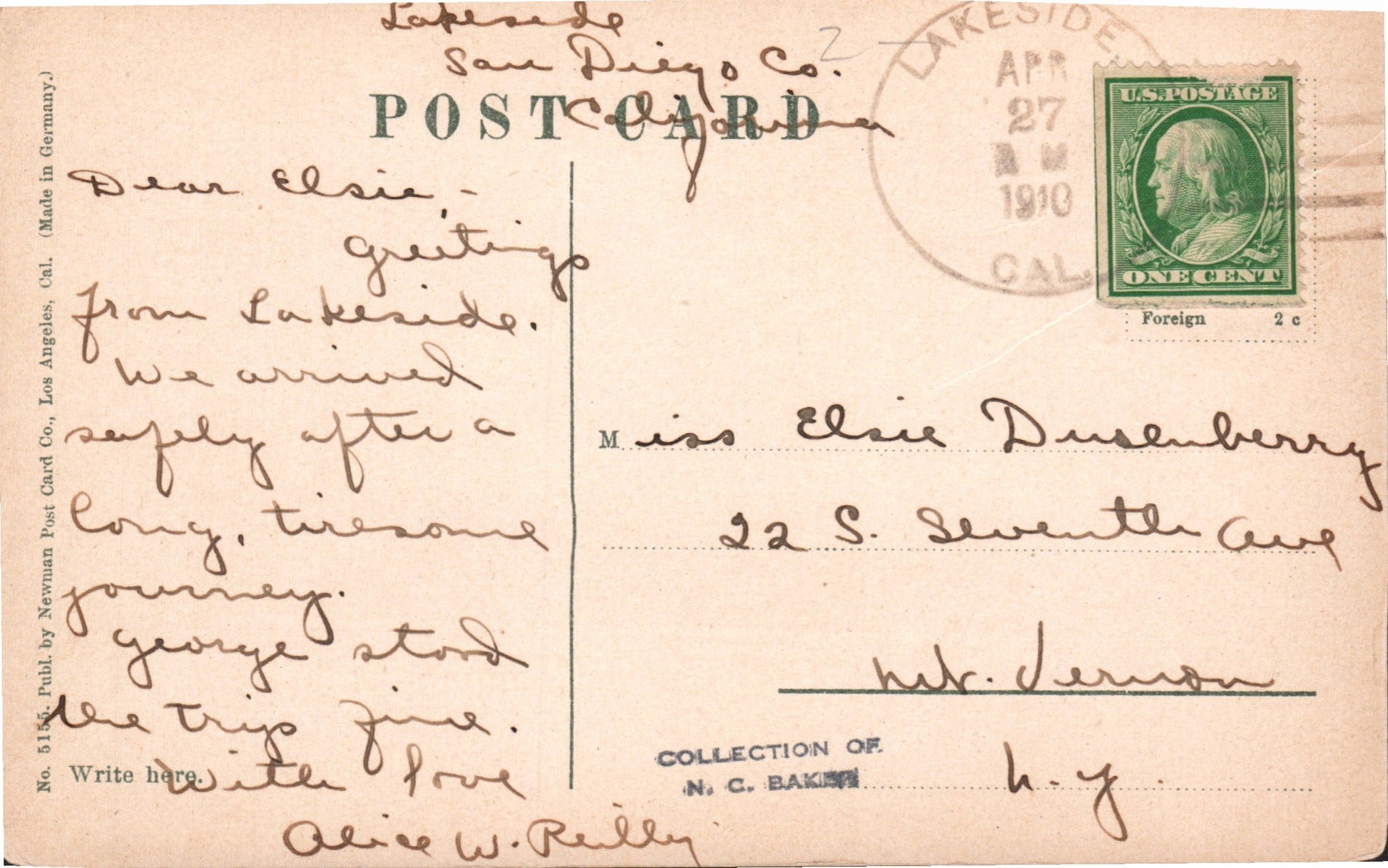 Lakeside 1910 4-bar on post card; 1955 machine cancel on Postal Card
