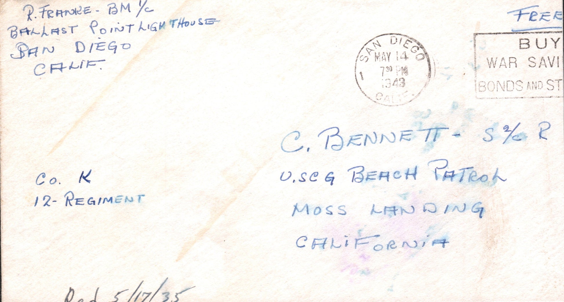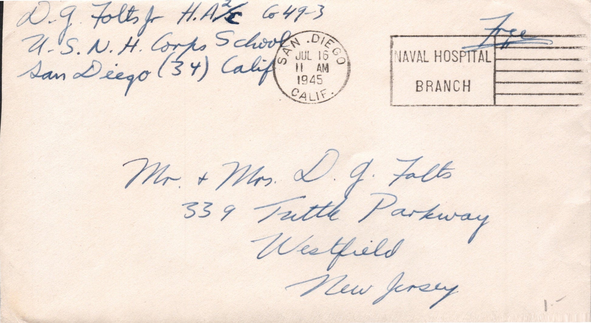 Naval Hospital Bx (San Diego) (1929-1982) 1945 machine cancel, ”free” soldiers’ mail