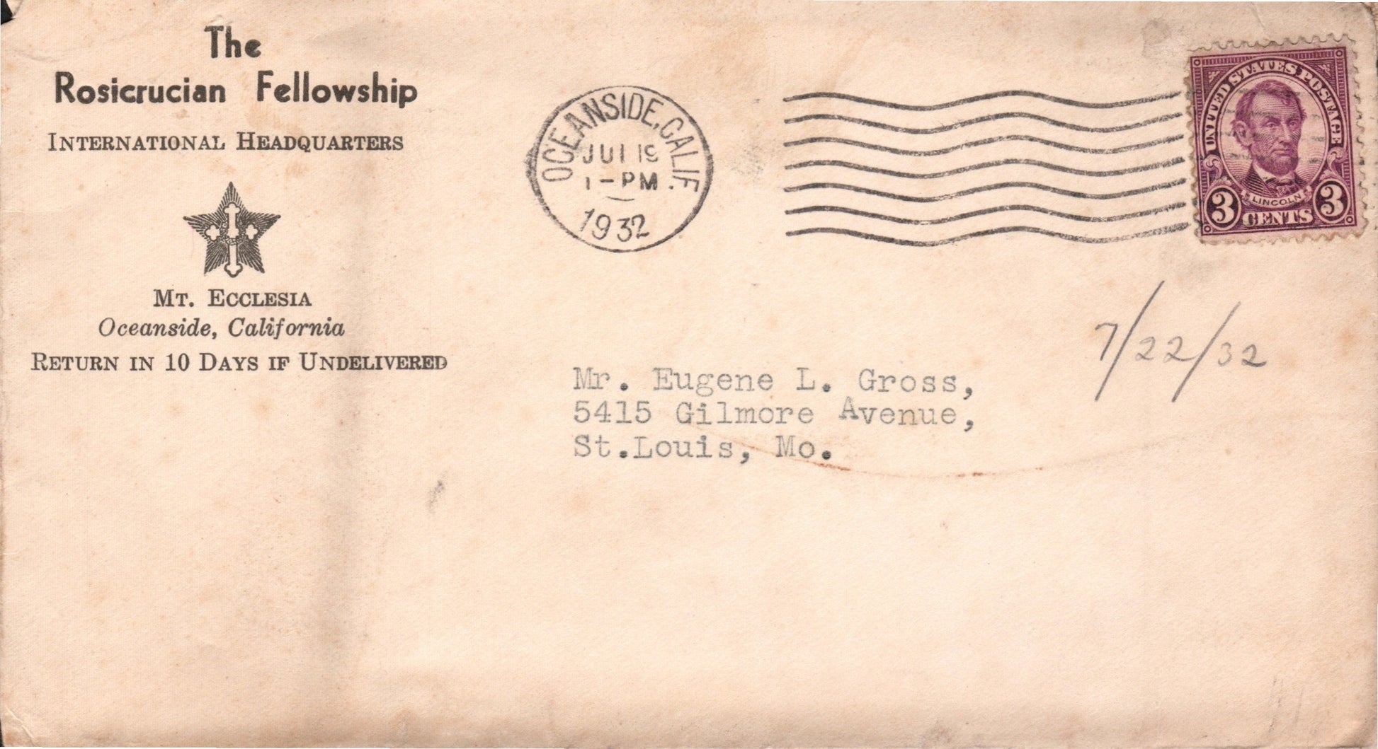 Oceanside 1932 machine cancel on cover, corner “Rosicrucian Fellowship”; 1963 machine cancel on cover; 1971 machine cancel on cover