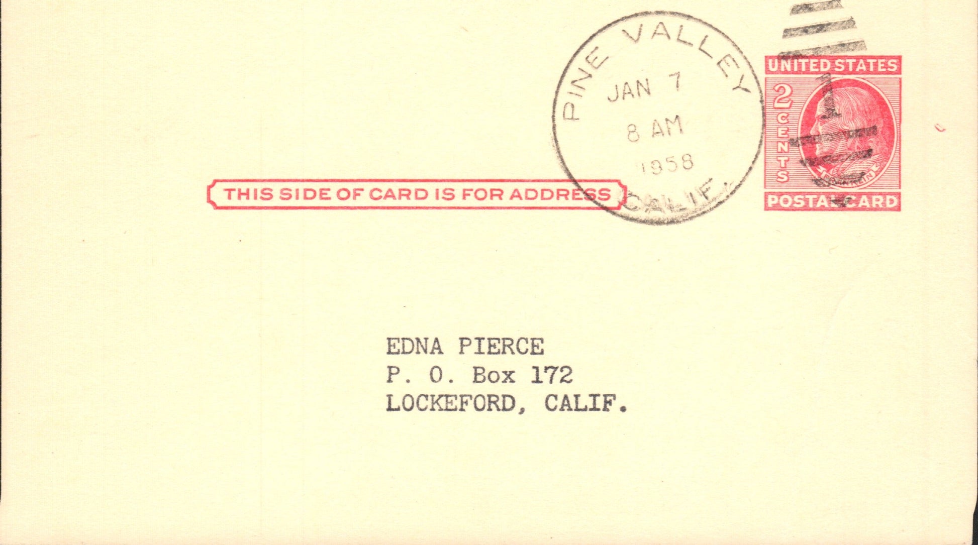 Warner Springs 1950 duplex on Postal Card