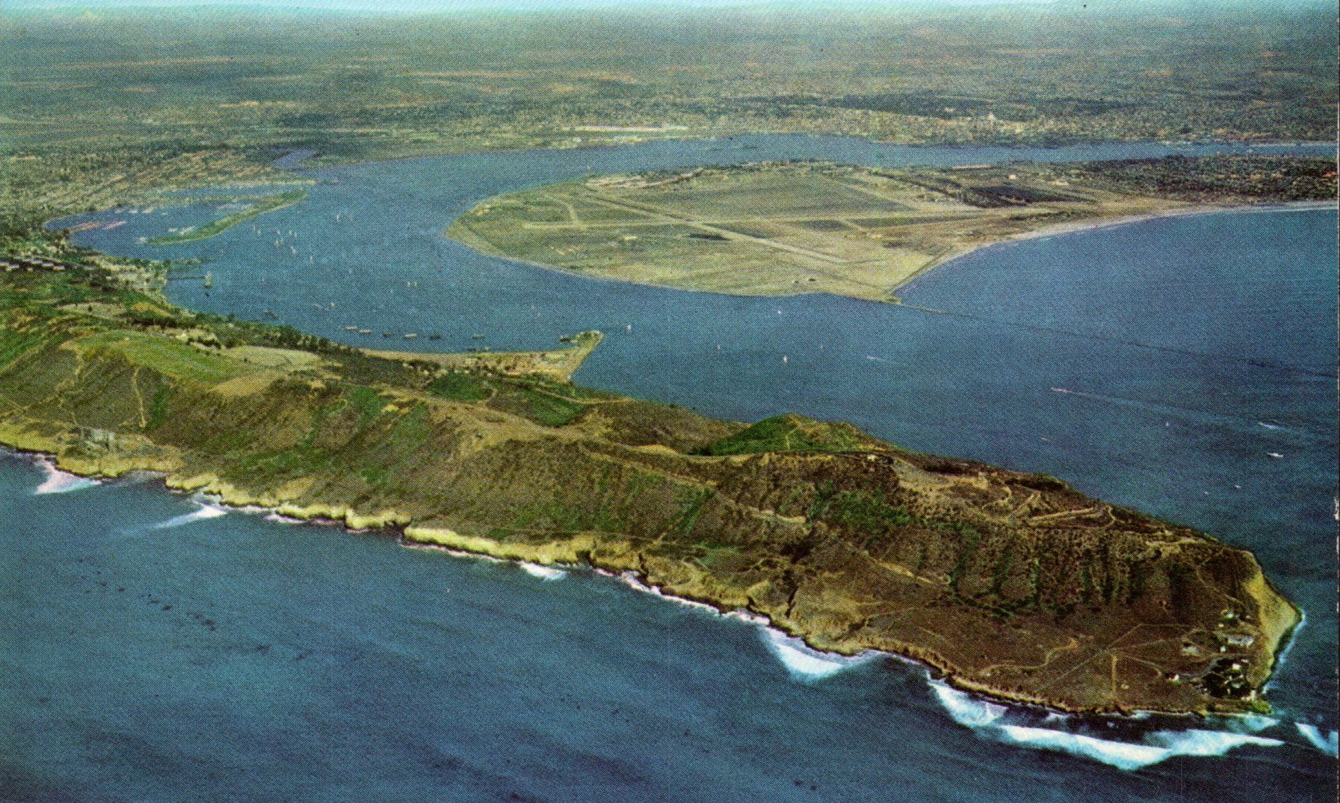 Post cards: Aerial view [chrome]; View from sea [B&W real photo]