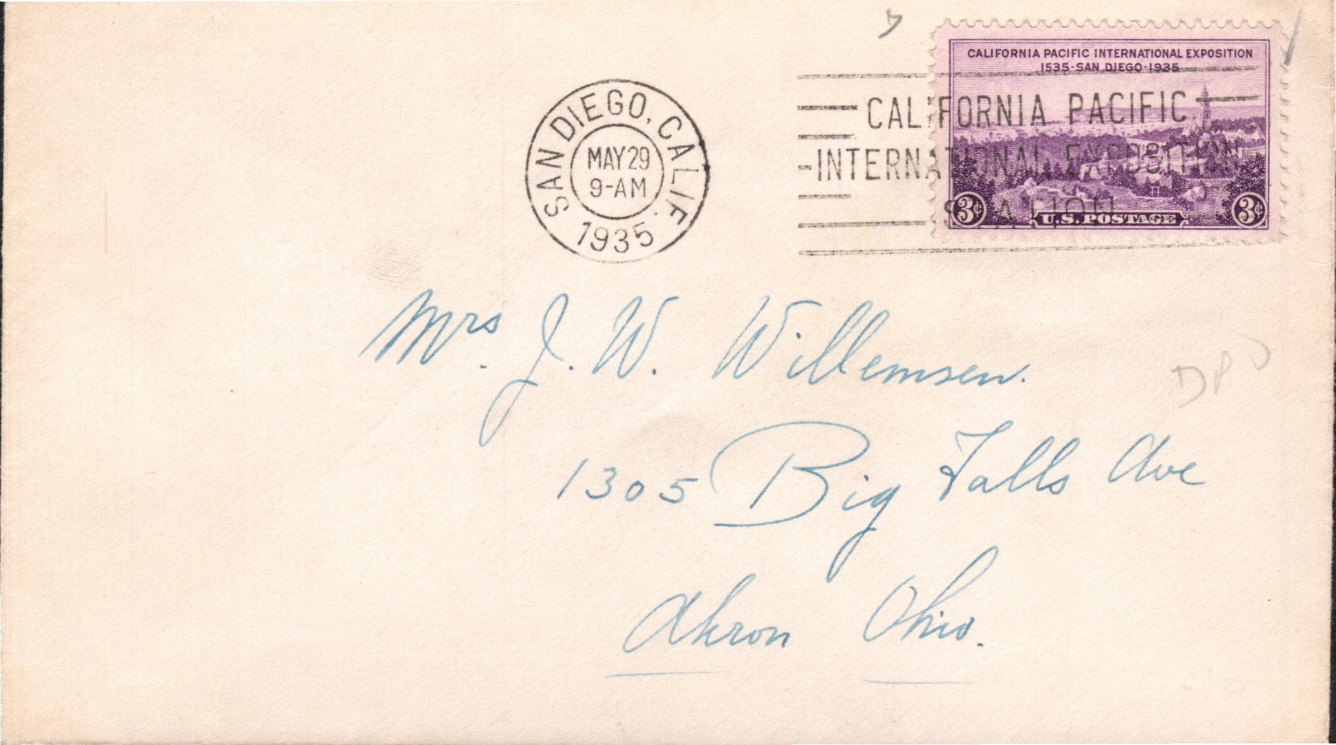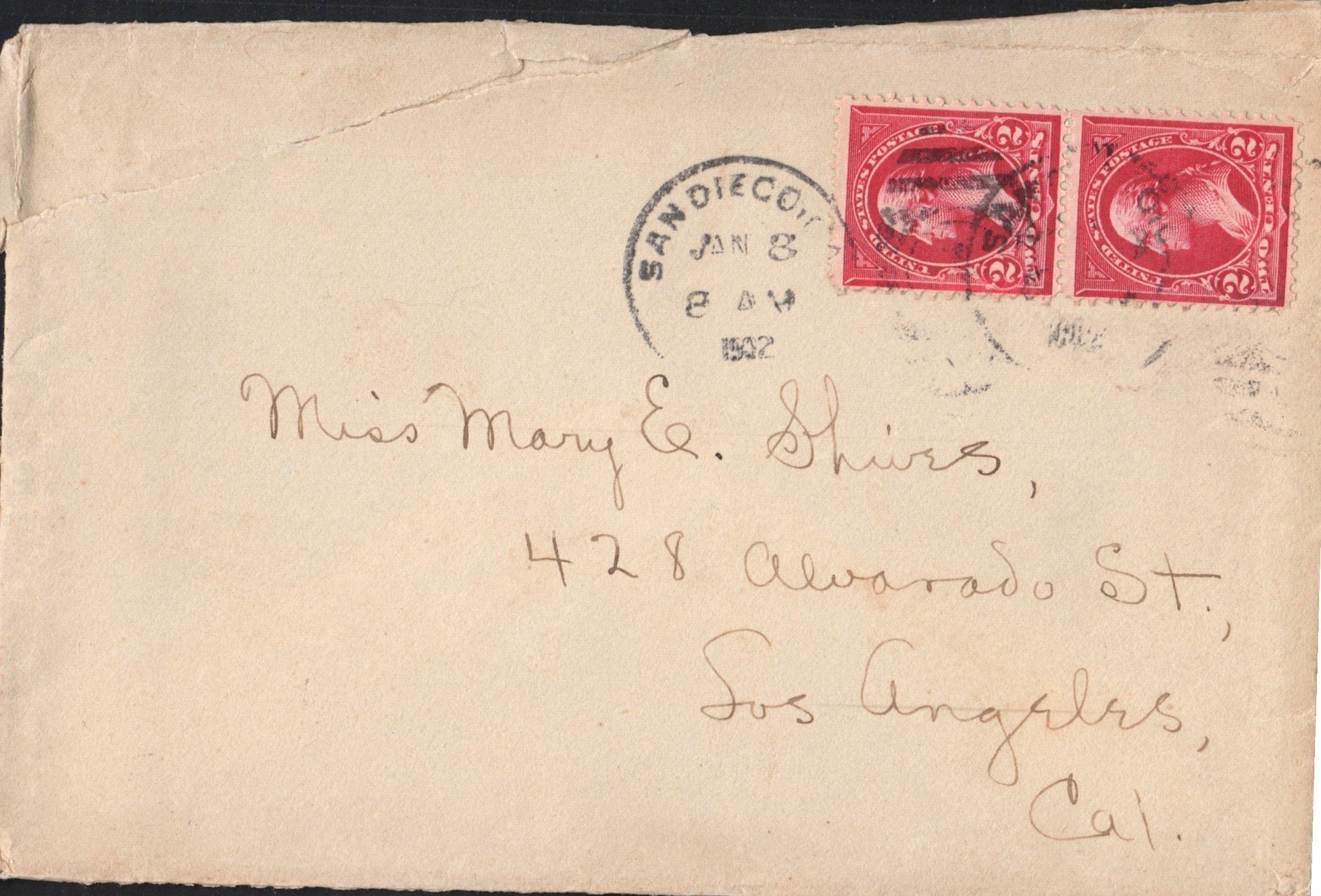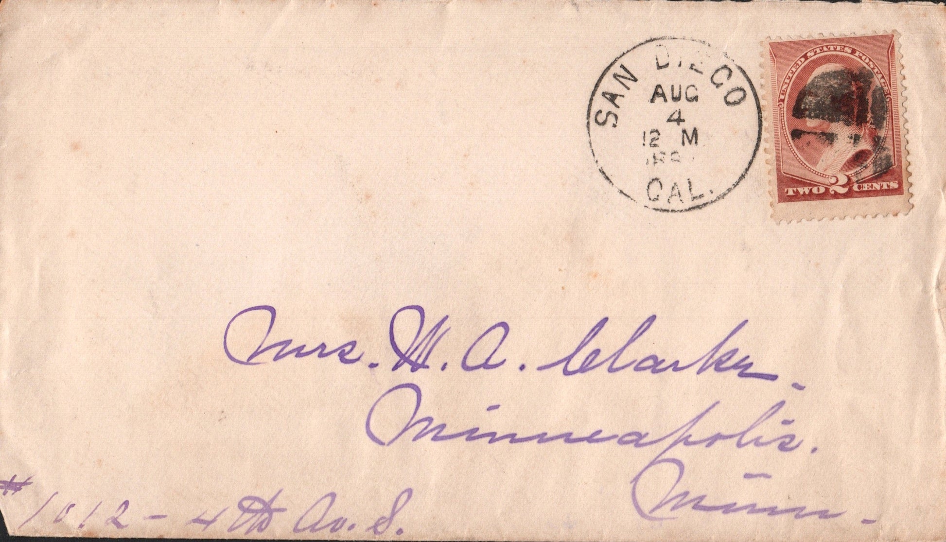 San Diego 1887 cds & cork killer on cover; 1890 duplex on cover; 1905 Flag cancel on post card; 1907 duplex on cover; 1915 slogan “Panama-California Exposition” on post card; 1919 machine cancel on cover; 1930 machine slogan “Air Mail Saves Time” on cover, original contents, Christmas seals on back; 1934 machine cancel on tax notice card; 1935 machine slogan “California Pacific International Exposition” on cover; 1938 machine cancel on cacheted cover “U.S.S. Winslow”; 1943 machine slogan “Buy War Bonds” partly off right of cover, “free” soldier’s mail; 1955 machine slogan “California Public School Week” on post card; 1967 machine slogan “Navy Seabees 25th Anniversary” on cover; 1969 machine FD of issue 6¢ California stamp on cacheted cover; 1985 machine slogan “Always Use Zip Code” on cover, original contents