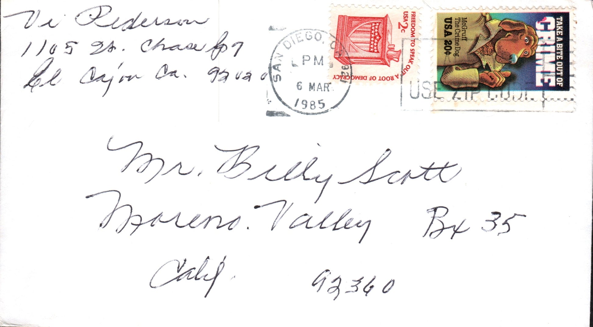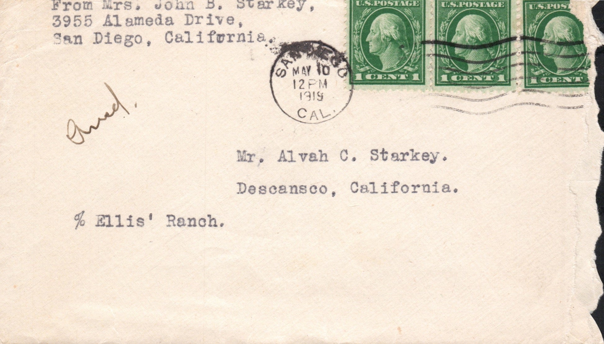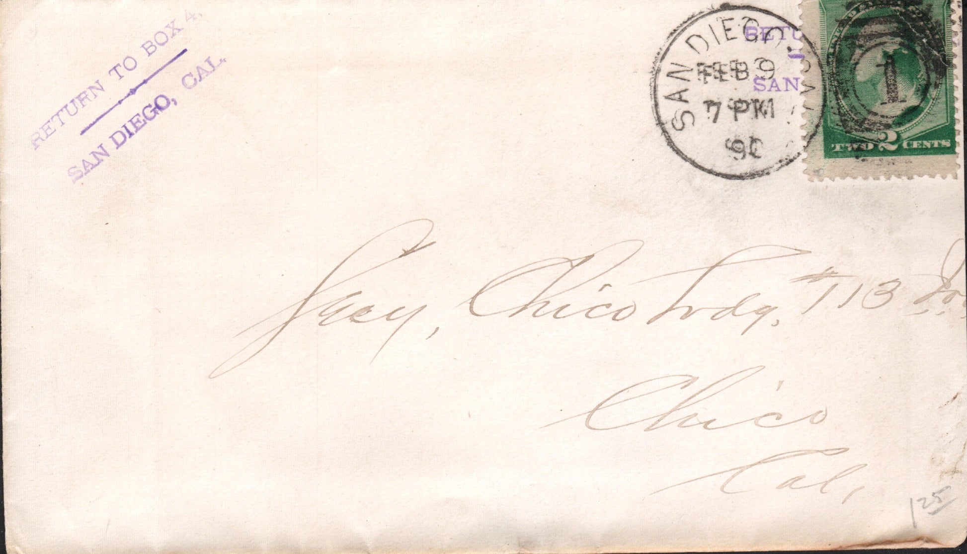San Diego 1887 cds & cork killer on cover; 1890 duplex on cover; 1905 Flag cancel on post card; 1907 duplex on cover; 1915 slogan “Panama-California Exposition” on post card; 1919 machine cancel on cover; 1930 machine slogan “Air Mail Saves Time” on cover, original contents, Christmas seals on back; 1934 machine cancel on tax notice card; 1935 machine slogan “California Pacific International Exposition” on cover; 1938 machine cancel on cacheted cover “U.S.S. Winslow”; 1943 machine slogan “Buy War Bonds” partly off right of cover, “free” soldier’s mail; 1955 machine slogan “California Public School Week” on post card; 1967 machine slogan “Navy Seabees 25th Anniversary” on cover; 1969 machine FD of issue 6¢ California stamp on cacheted cover; 1985 machine slogan “Always Use Zip Code” on cover, original contents